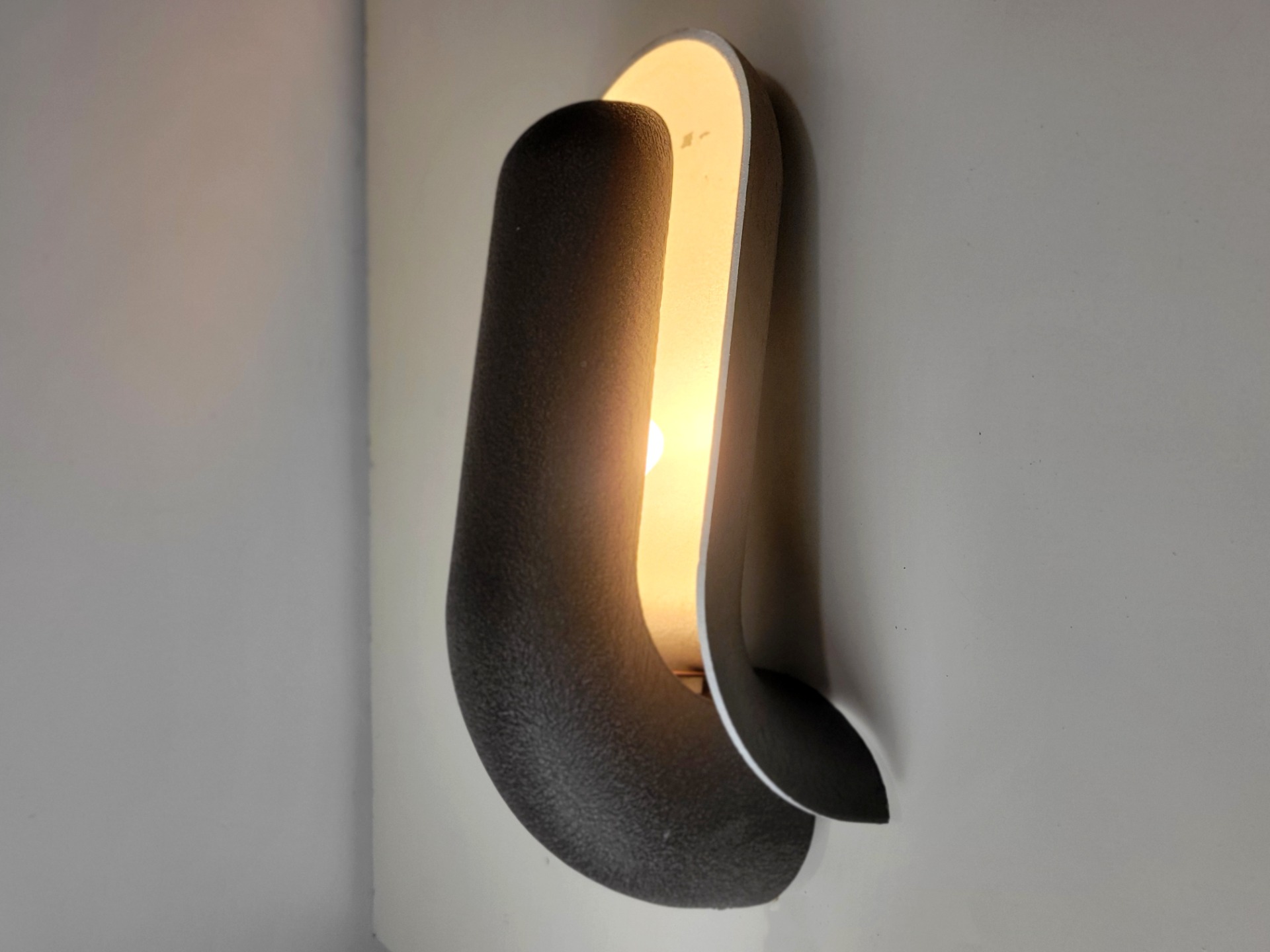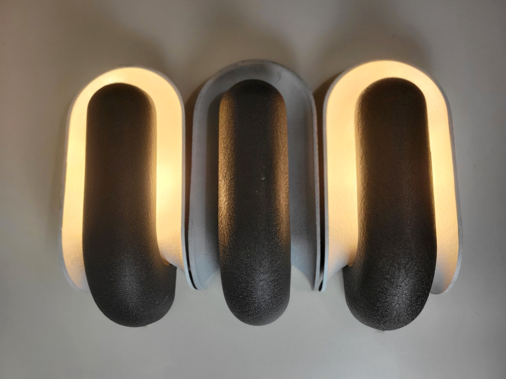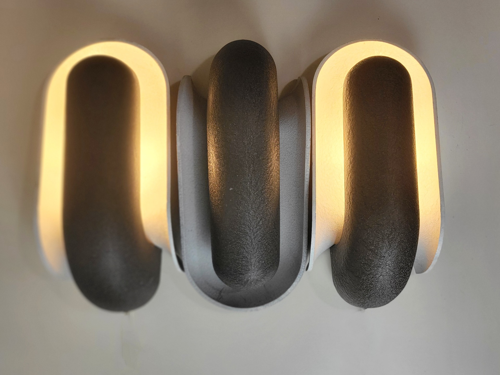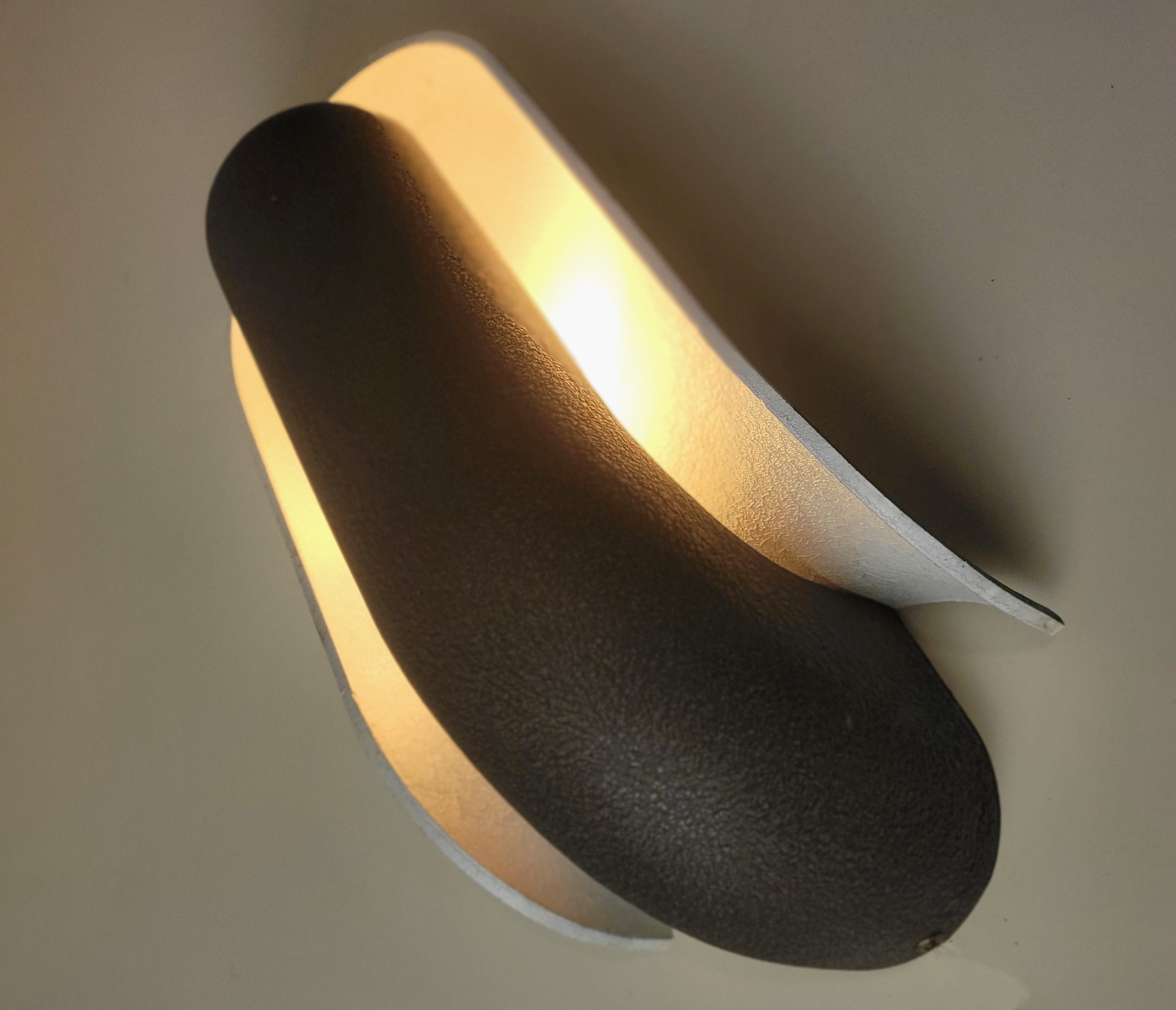Set van 3 vintage wandlampen ontworpen door Piet Cohen voor Raak Amsterdam. Bijzonder fraaie wandlamp, waarin het licht uit zijn schulp kruipt; een exotisch schaaldier van gegoten aluminium met een concentrische tweede schelp waarachter het licht op subtiele wijze vandaan kruipt. De set van de drie bruine Schelpdier wandlampen verkeren in nette vintage conditie. Twee lampen hebben enkele lichte gebruikssporen. Eén verkeert in zeer goede staat gezien de leeftijd.