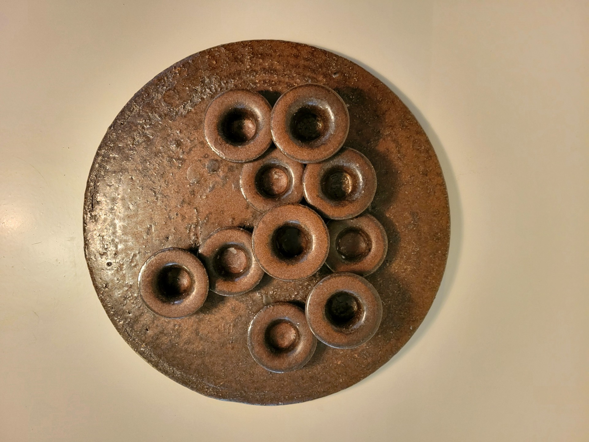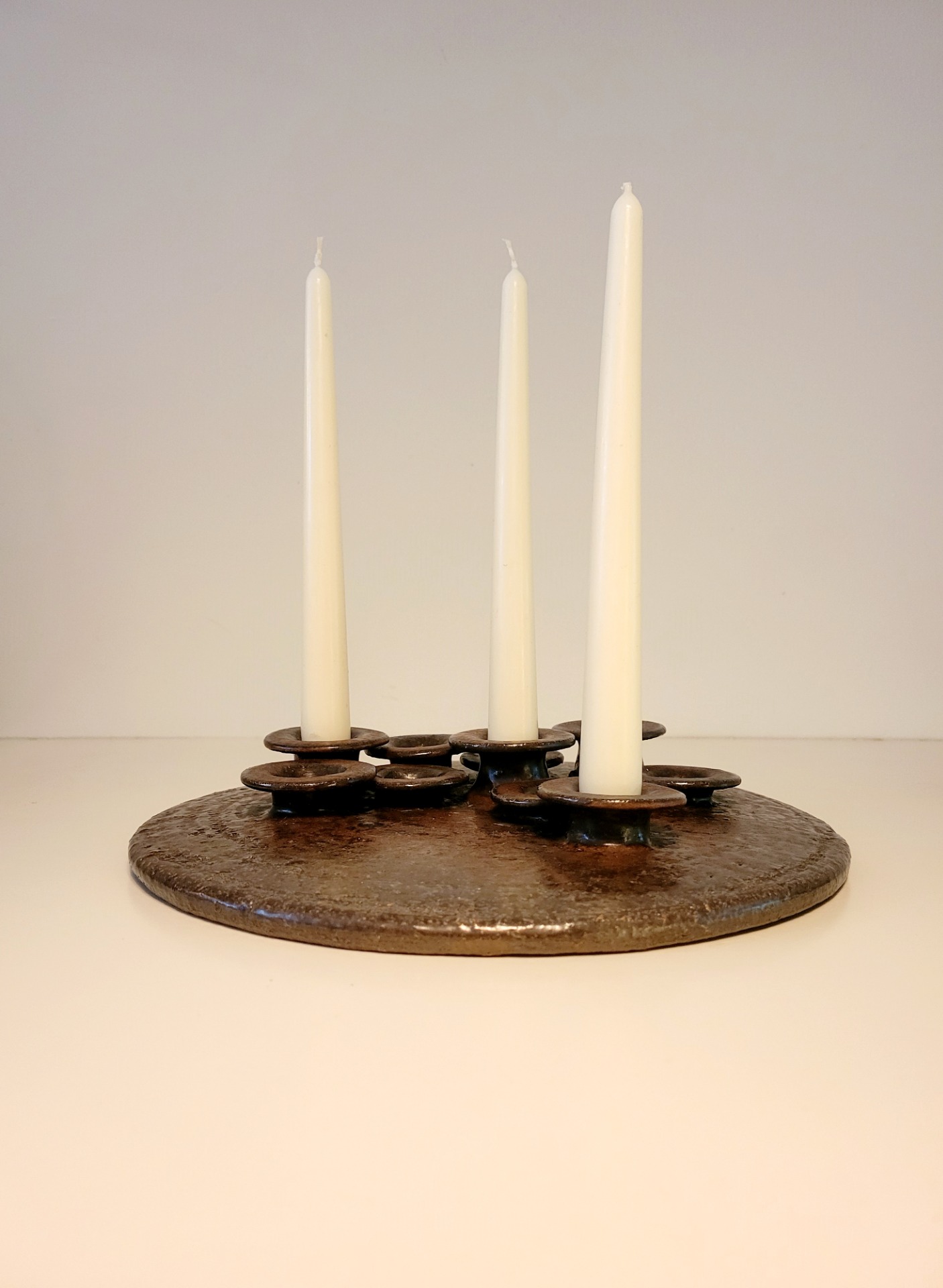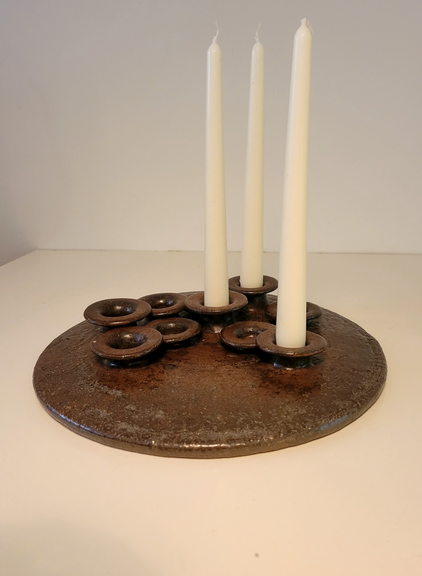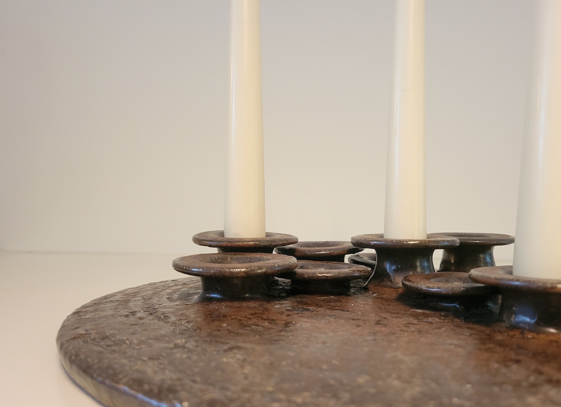 Vintage kandelaar van keramiek voor 10 kaarsen, ontworpen door Rudi Stahl en uitgebracht door Rudi Stahl Art Pottery in Höhr-Grenzhausen, Duitsland. 1970. Het bijzondere ontwerp is in stijl van Brutaisme. De kandelaar is handgemaakt en aan de onderzijde gesigneerd, heeft een ophanging en kan daarom ook als wanddecoratie worden gebruikt.