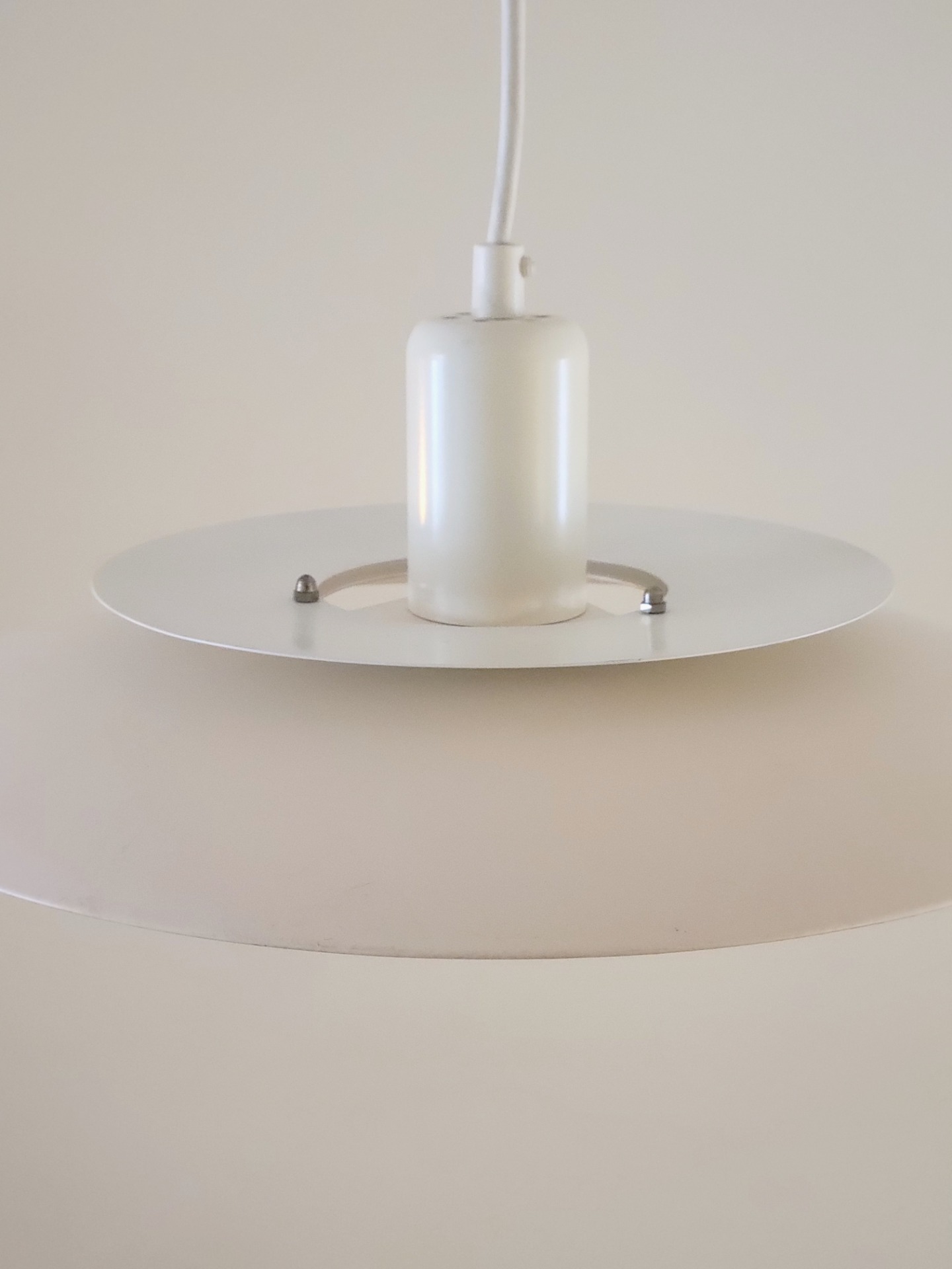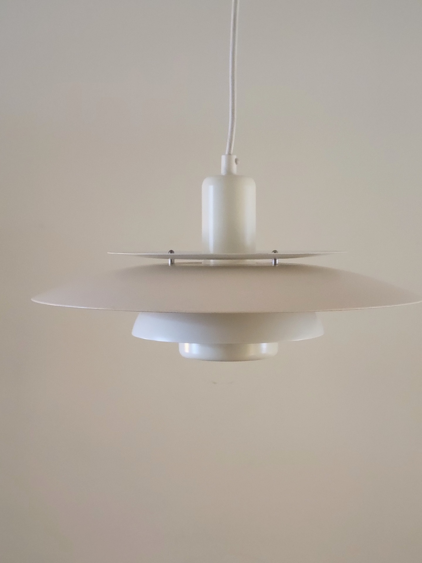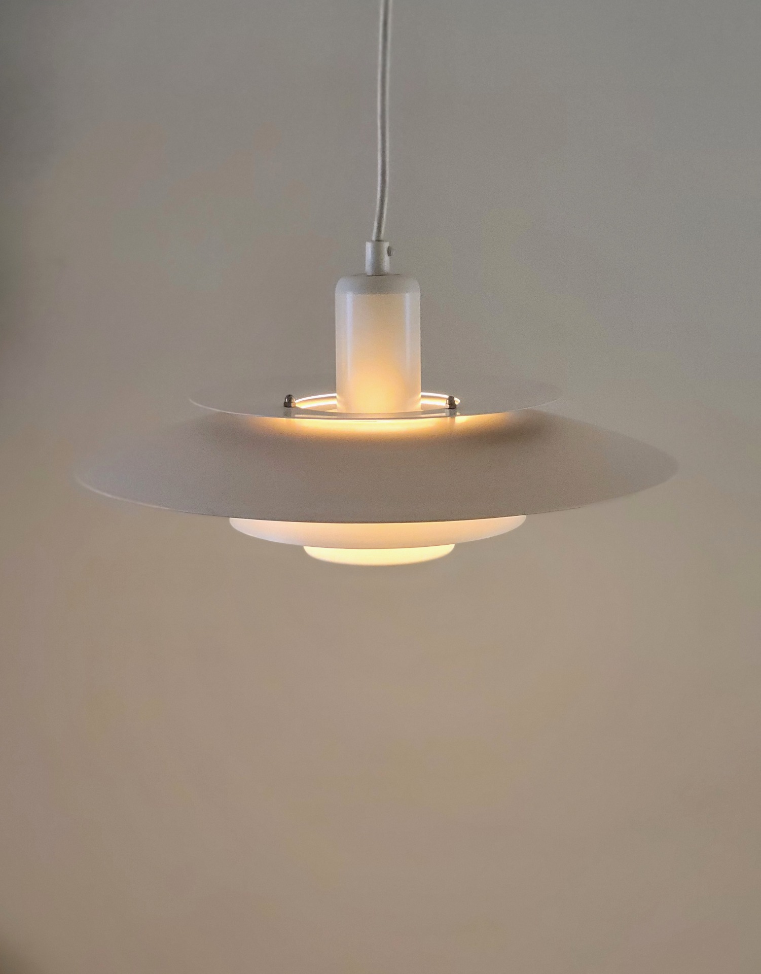 Tijdloos Deens design van Lyskaer Belysning uit de jaren '70. De metalen schalenlamp is opgebouwd uit 4 schalen waardoor het licht weerkaatst wordt. De schalen zijn afwisselend in een crème en een helder witte kleur gelakt. De lamp verkeert in zeer nette staat met niet of nauwelijks sporen van gebruik.
