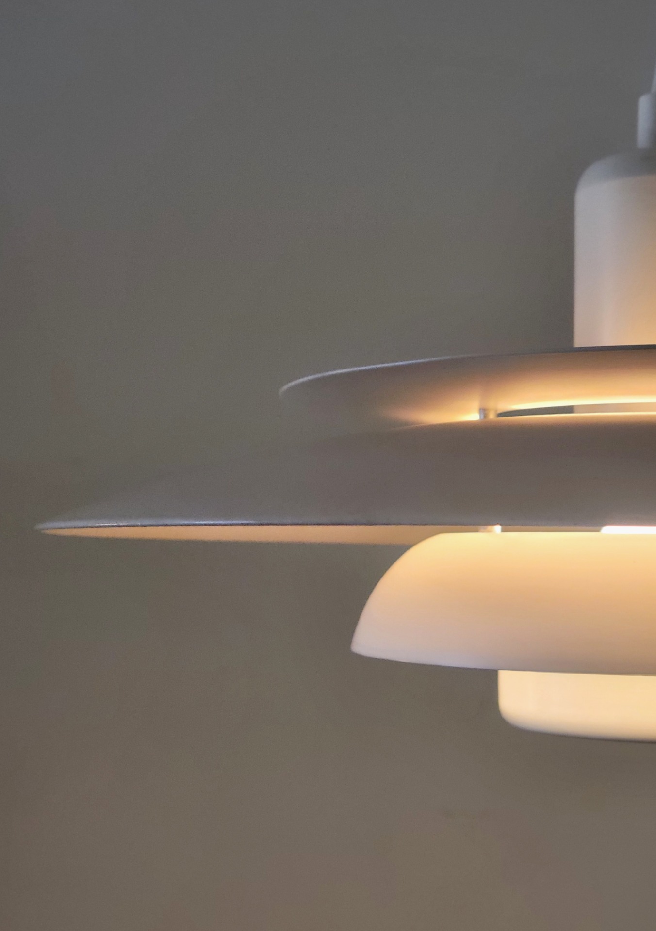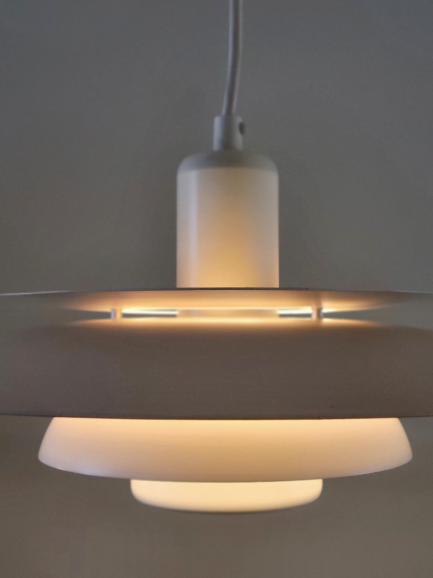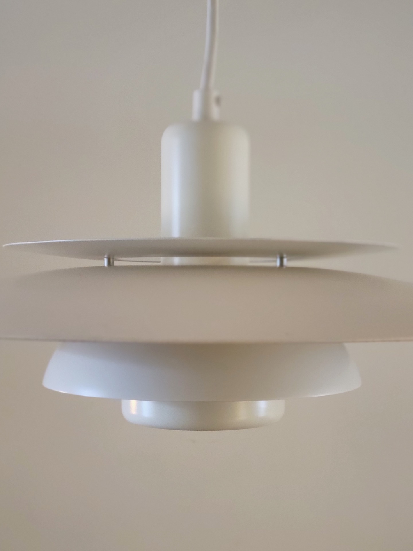 Tijdloos Deens design van Lyskaer Belysning uit de jaren '70. De metalen schalenlamp is opgebouwd uit 4 schalen waardoor het licht weerkaatst wordt. De schalen zijn afwisselend in een crème en een helder witte kleur gelakt. De lamp verkeert in zeer nette staat met niet of nauwelijks sporen van gebruik.