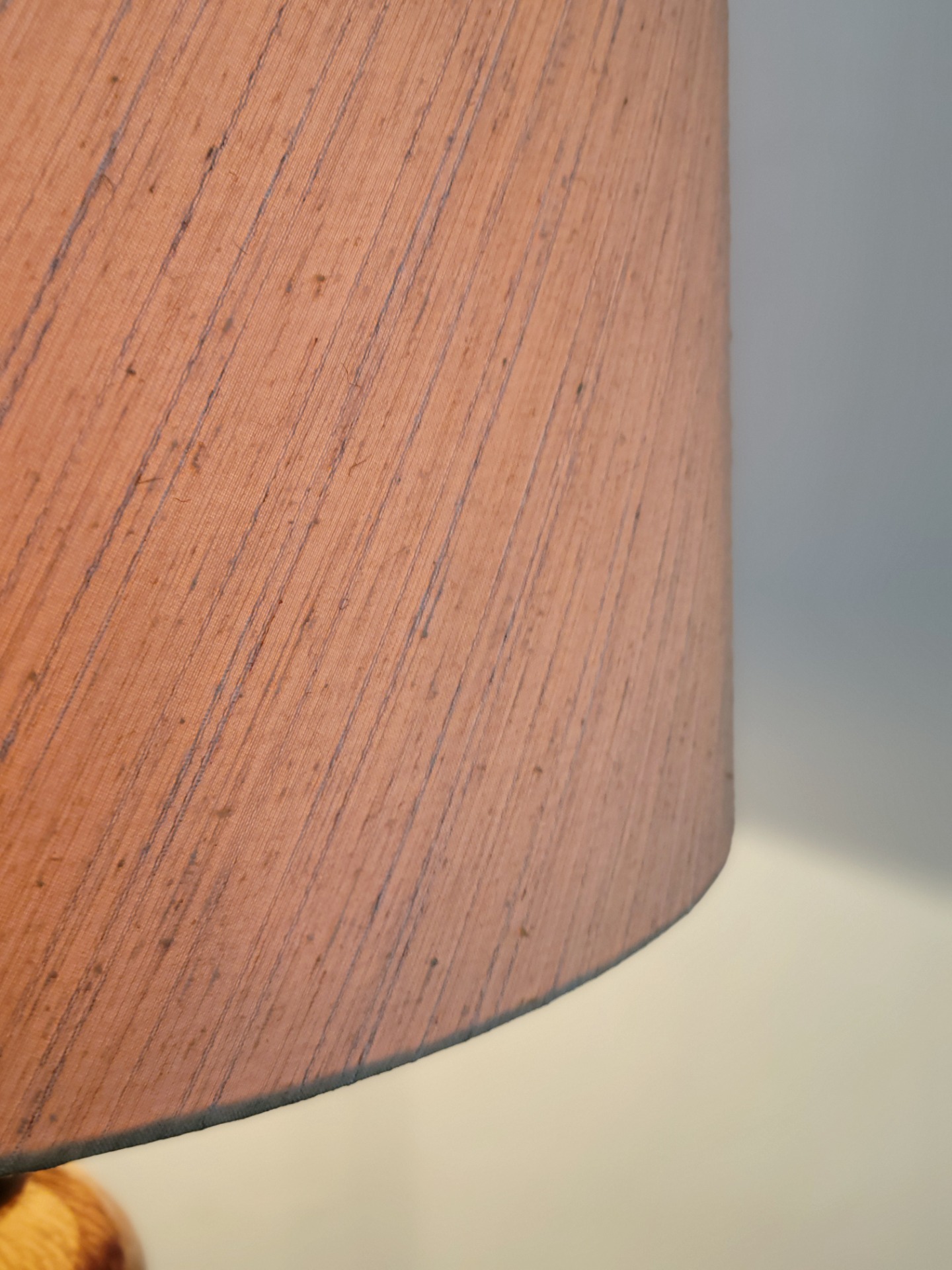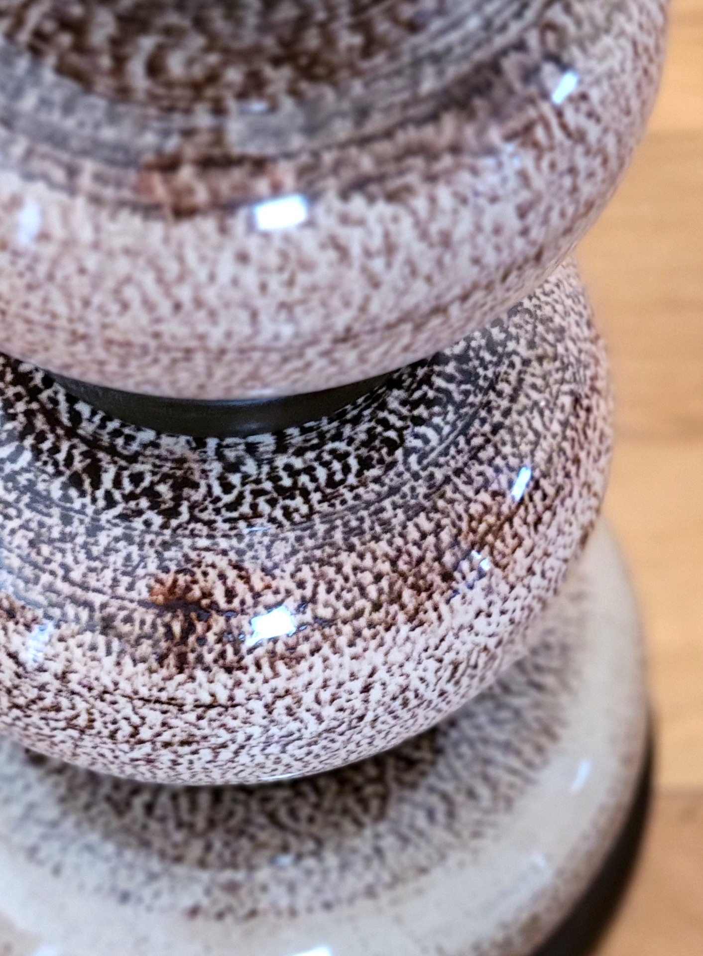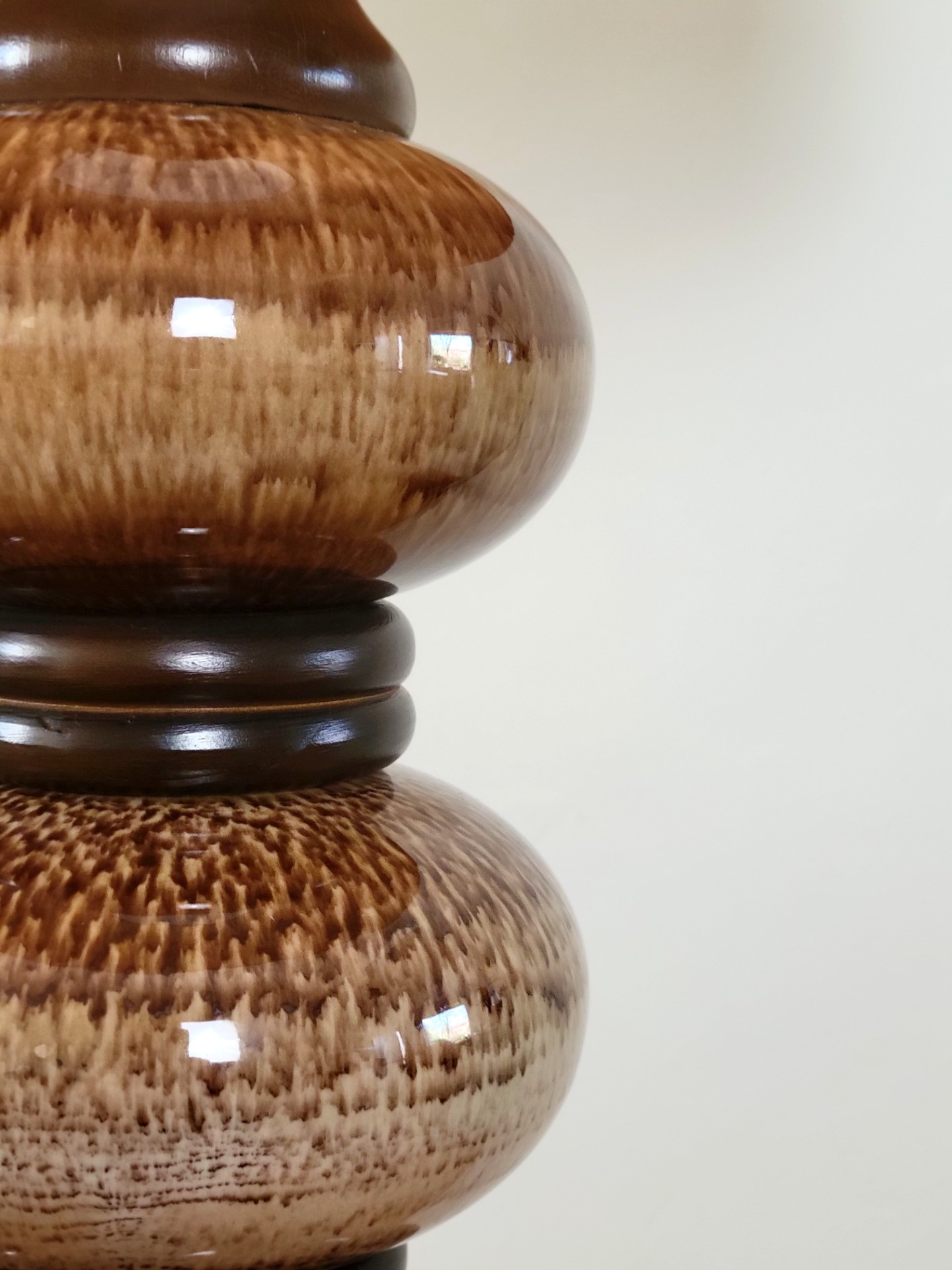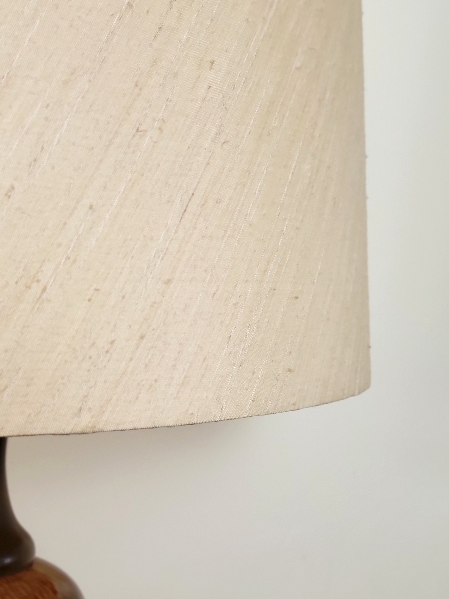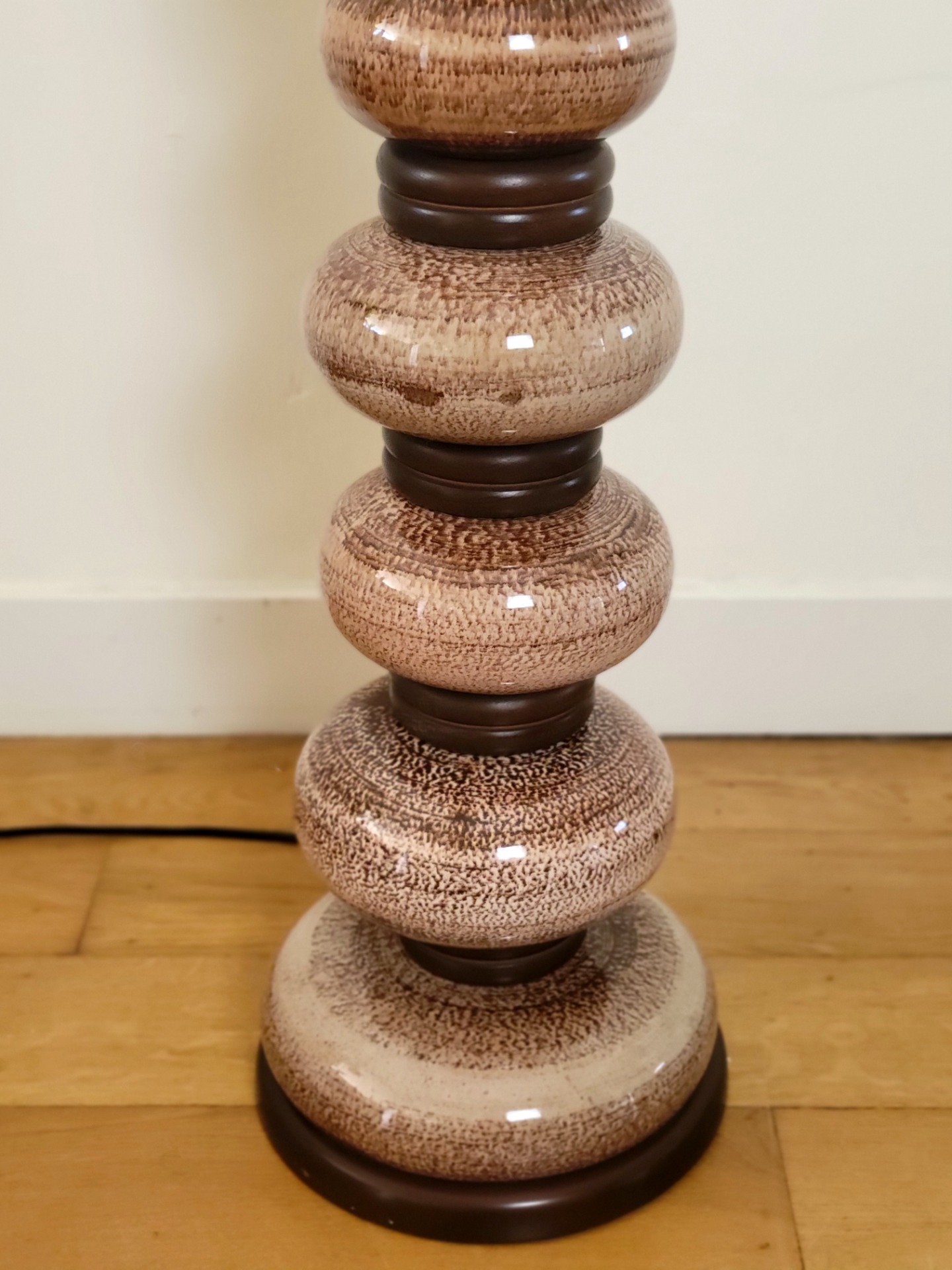 Bijzondere vloerlamp van Kaiser Leuchten, Duitsland 1960. De lamp heeft een prachtige keramieken voet in warme , aardse bruintinten en een subtiel gemêleerd glazuur. De lamp is opgebouwd uit elegante, bolvormige segmenten met donkere accenten ertussen, wat zorgt voor een mooi ritme en een luxe uitstraling. De combinatie van het glanzende keramiek en de grote crèmekleurige linnen kap geeft de lamp de nodige klasse. De lamp verkeert in nette vintage staat. De kap heeft aan de binnenzijde een lichte beschadiging.