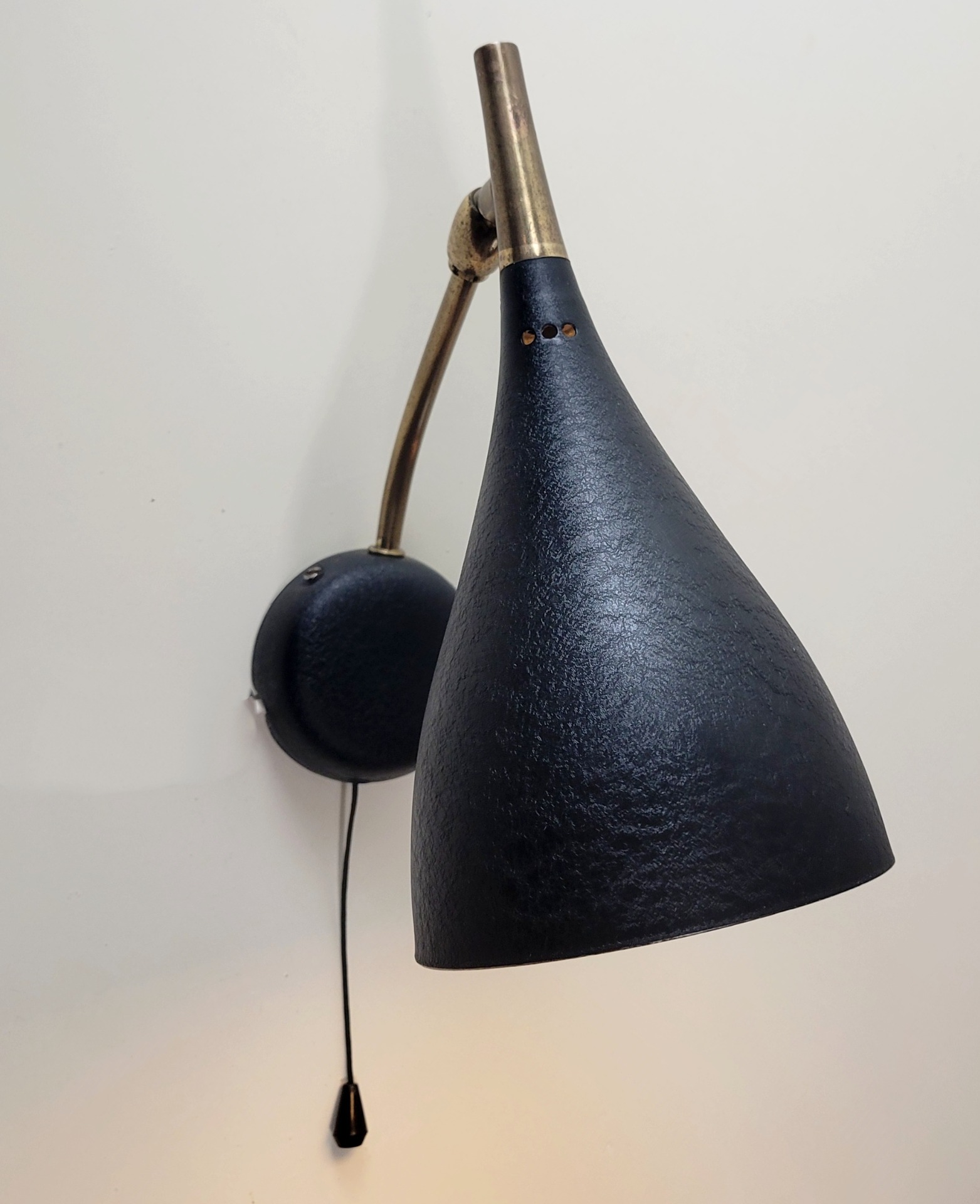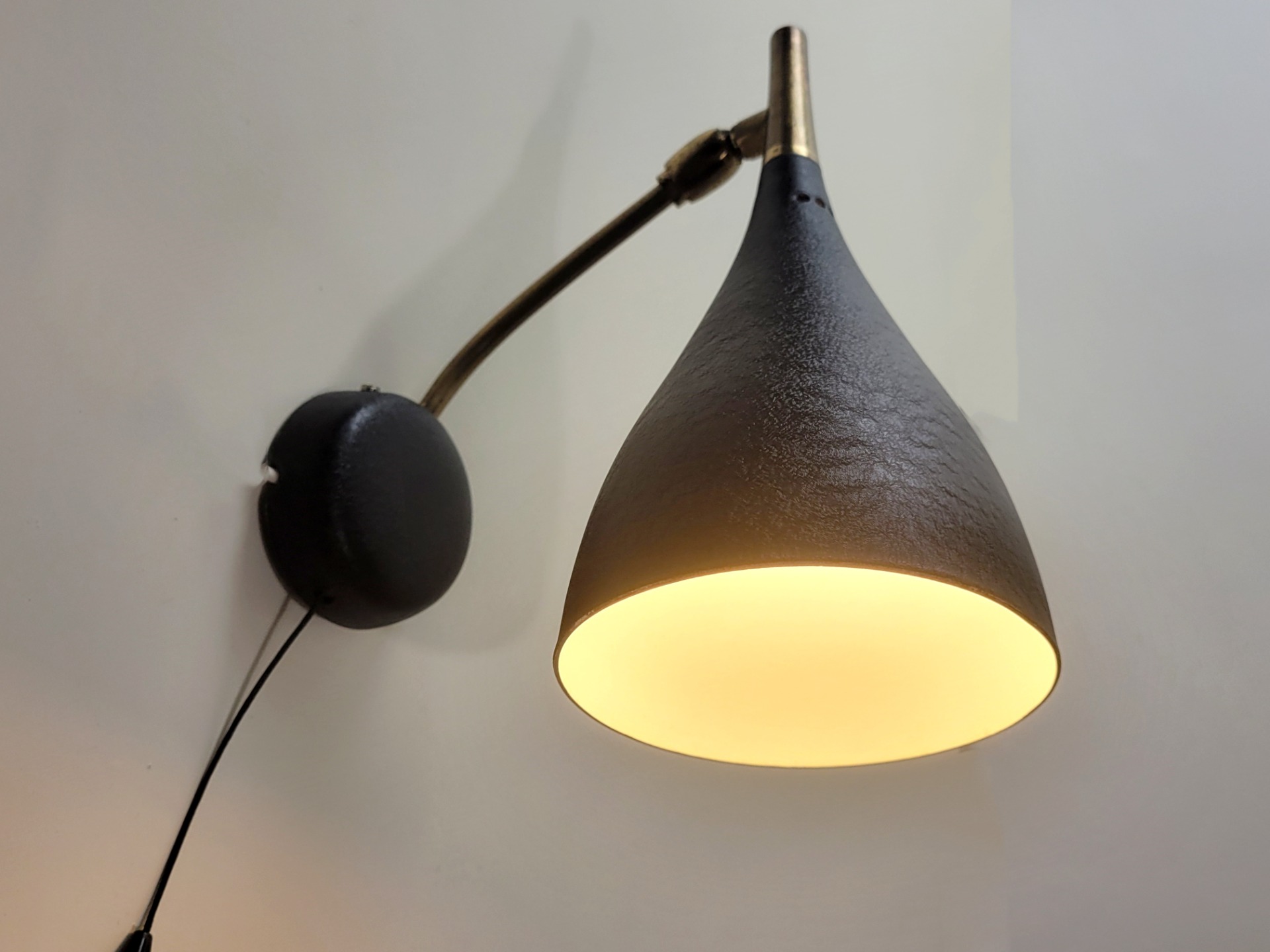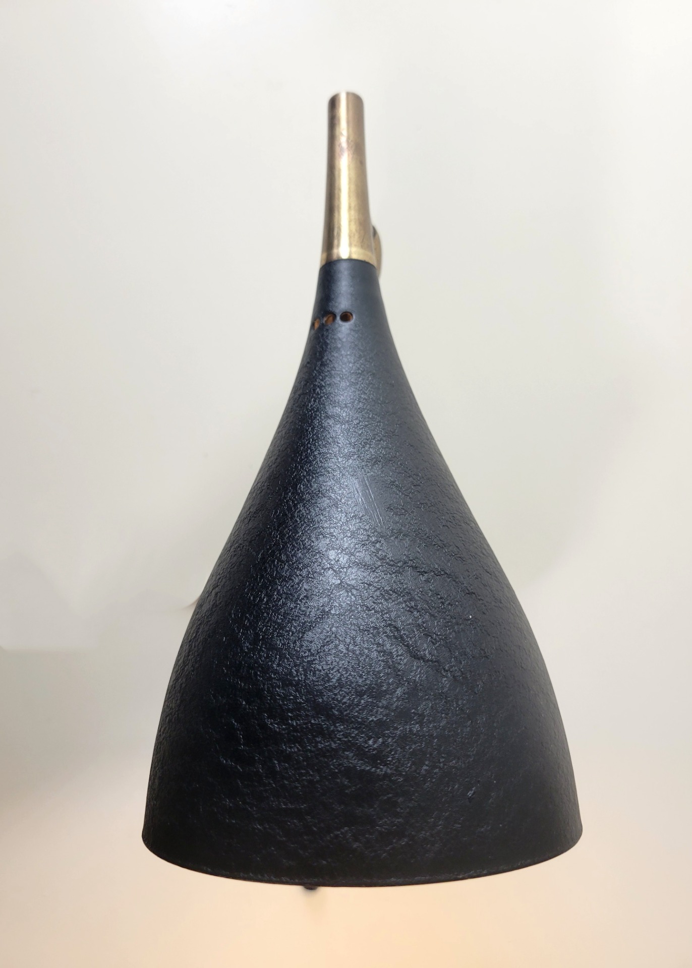 Vintage wandlamp van Cosack Leuchten, Duitsland 1950. Een zeer elegant ontworpen wandlamp. De fijn uitgevoerde lampenkap heeft een conische vorm . De kap is voorzien van een zwart matte lak met een lichte structuur, waardoor de lamp een exclusieve uitstraling krijgt. De kap loopt aan de bovenkant naadloos over in een messing uiteinde. Aan de bovenzijde van de zwarte kap bevinden zich drie gaten die dienen voor de warmteafvoer. De kap is via een scharnier verbonden met de messingkleurige arm. Hierdoor is de lamp draaibaar en kantelbaar. De ronde wandmontageplaat is eveneens uitgevoerd in de zwarte structuurlak. De lamp is voorzien van trekschakelaar. De lamp verkeert in hele nette vintage conditie.