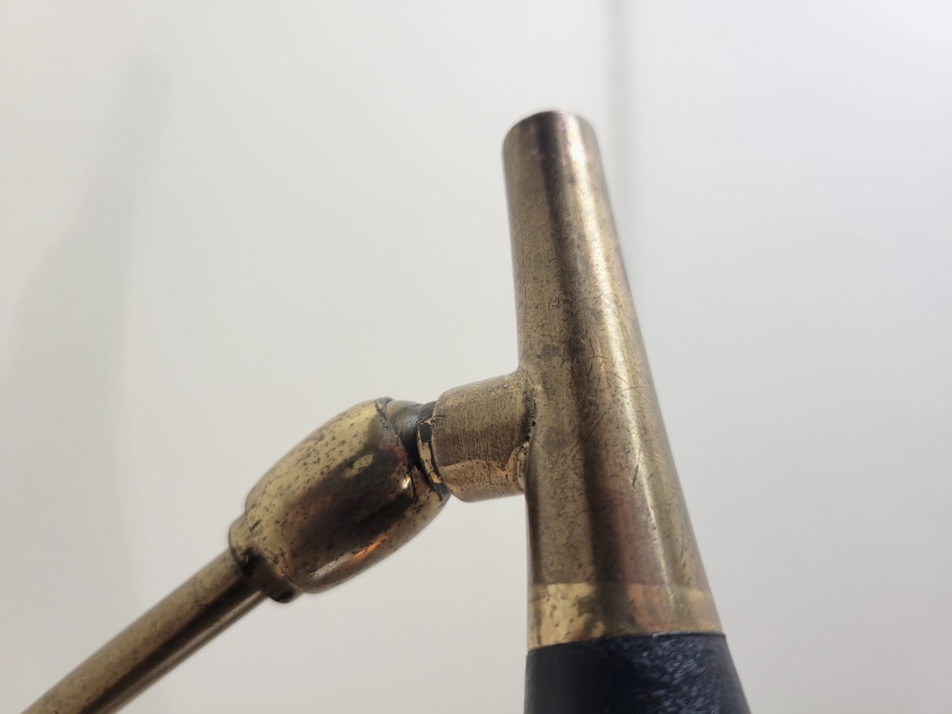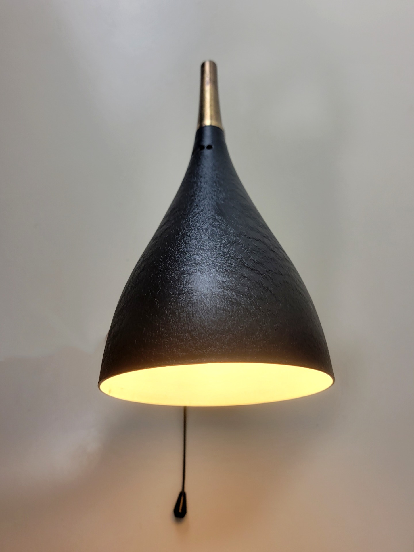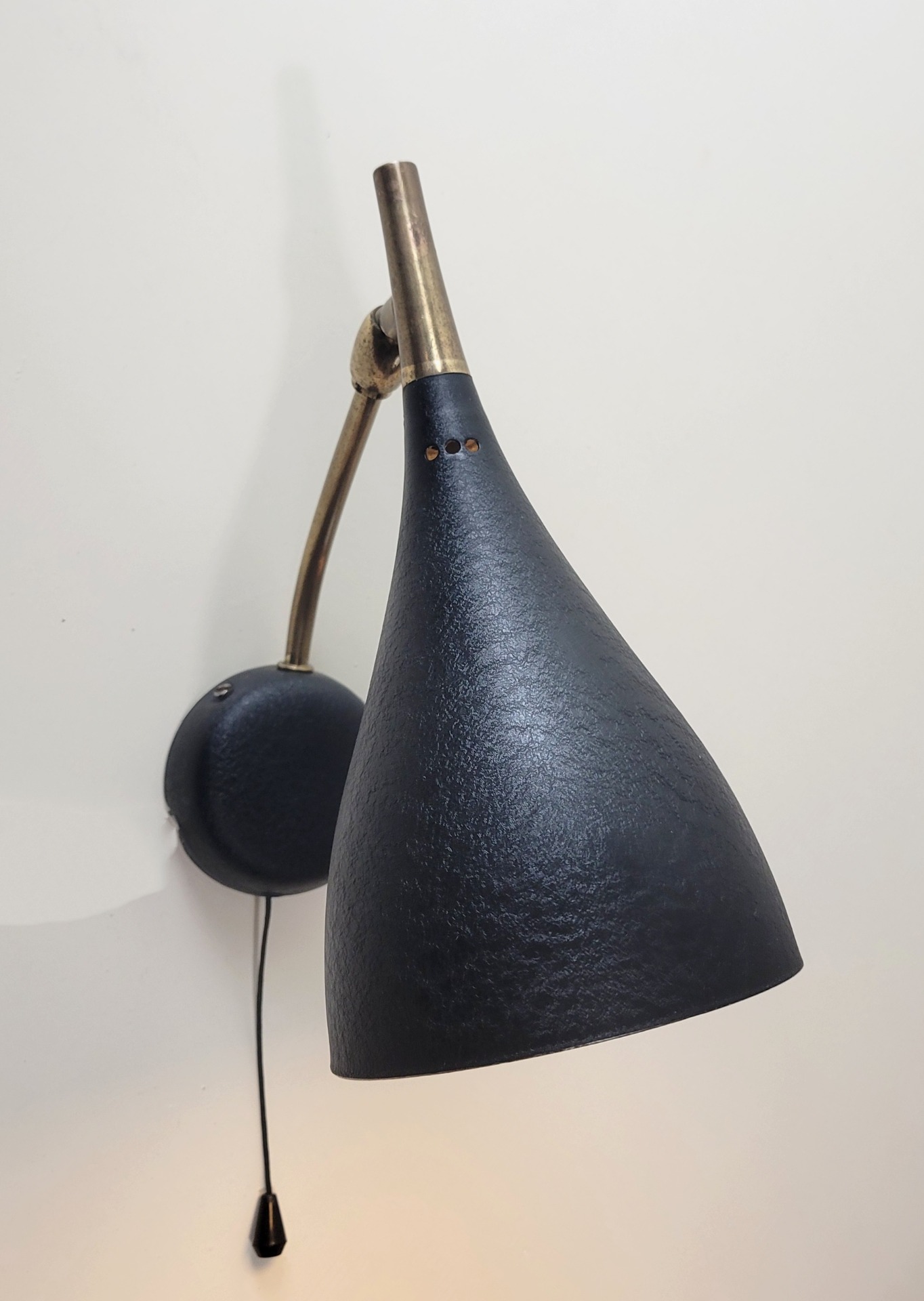 Vintage wandlamp van Cosack Leuchten, Duitsland 1950. Een zeer elegant ontworpen wandlamp. De fijn uitgevoerde lampenkap heeft een conische vorm . De kap is voorzien van een zwart matte lak met een lichte structuur, waardoor de lamp een exclusieve uitstraling krijgt. De kap loopt aan de bovenkant naadloos over in een messing uiteinde. Aan de bovenzijde van de zwarte kap bevinden zich drie gaten die dienen voor de warmteafvoer. De kap is via een scharnier verbonden met de messingkleurige arm. Hierdoor is de lamp draaibaar en kantelbaar. De ronde wandmontageplaat is eveneens uitgevoerd in de zwarte structuurlak. De lamp is voorzien van trekschakelaar. De lamp verkeert in hele nette vintage conditie.