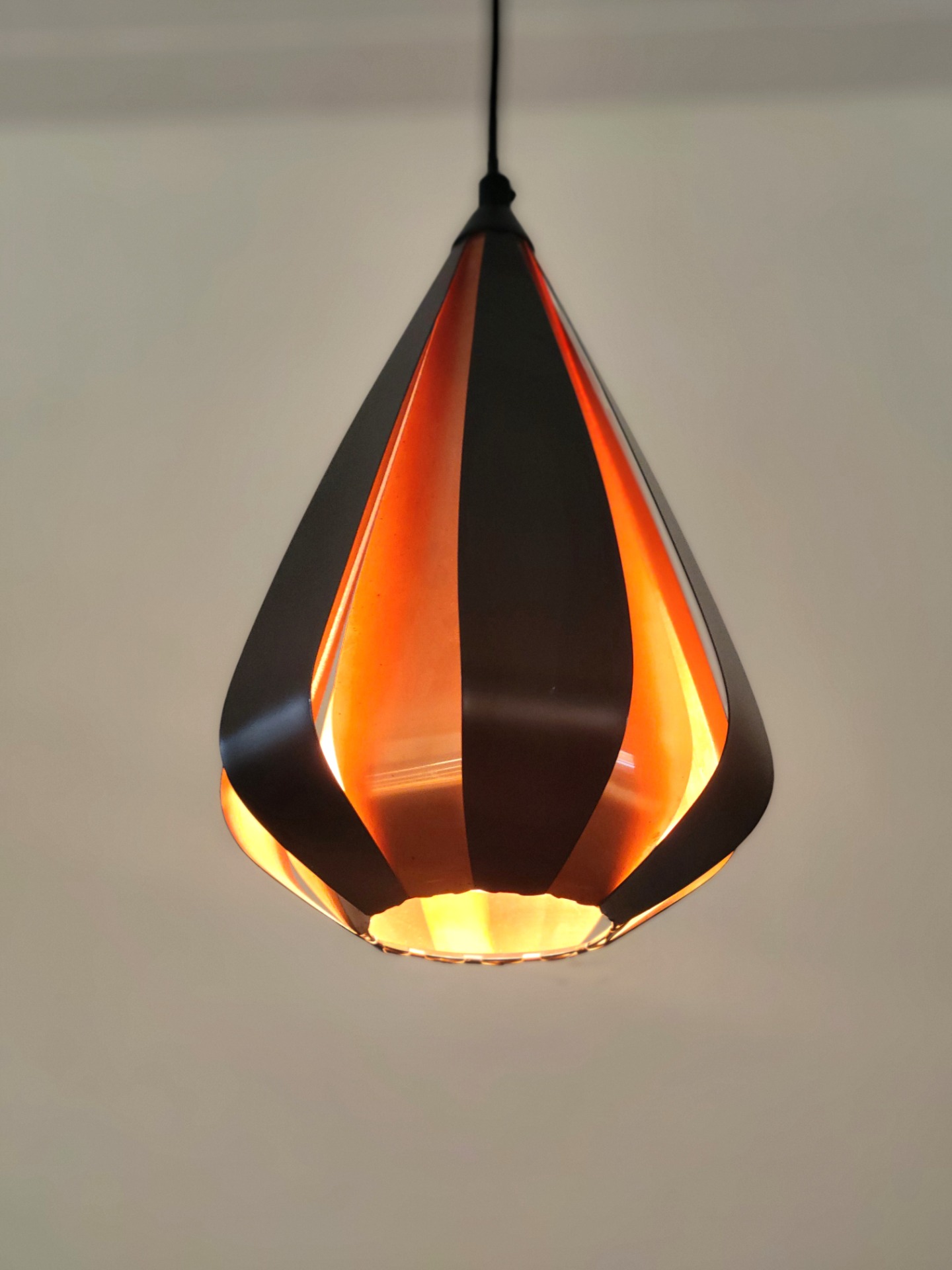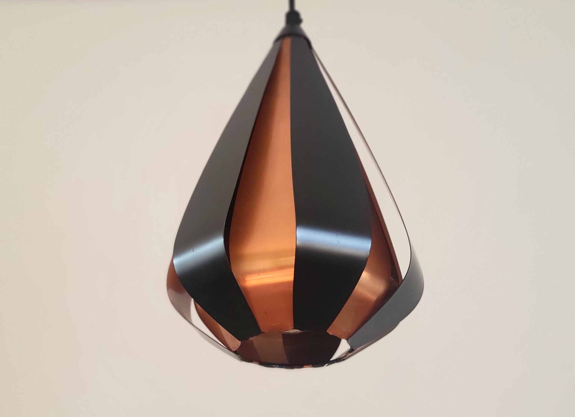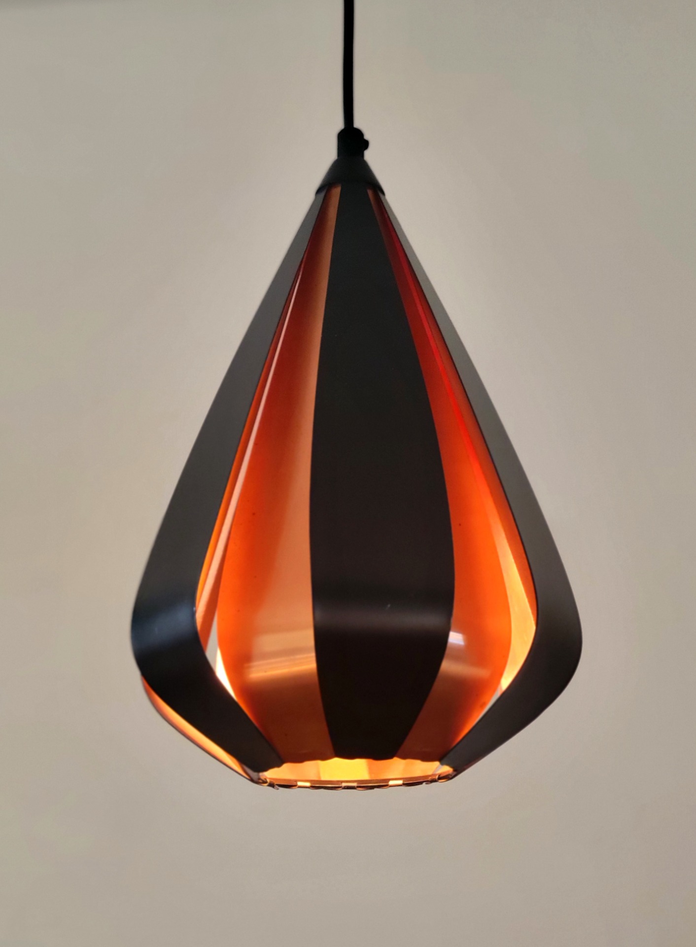 Een prachtige en sfeervolle set van twee Deense hanglampen ontworpen door Werner Schou voor Coronell Elektro. Deze iconische lampen uit de jaren ’60 zijn uitgevoerd in zwart gelakt metaal met warme koperkleurige binnenzijde. De elegante, druppelvormige lamellen creëren een bijzonder lichtspel: direct licht naar beneden gecombineerd met een zachte, warme gloed die subtiel door de openingen straalt. De lampen geven een intieme en luxueuze sfeer. De lampen verkeren in zeer nette staat.