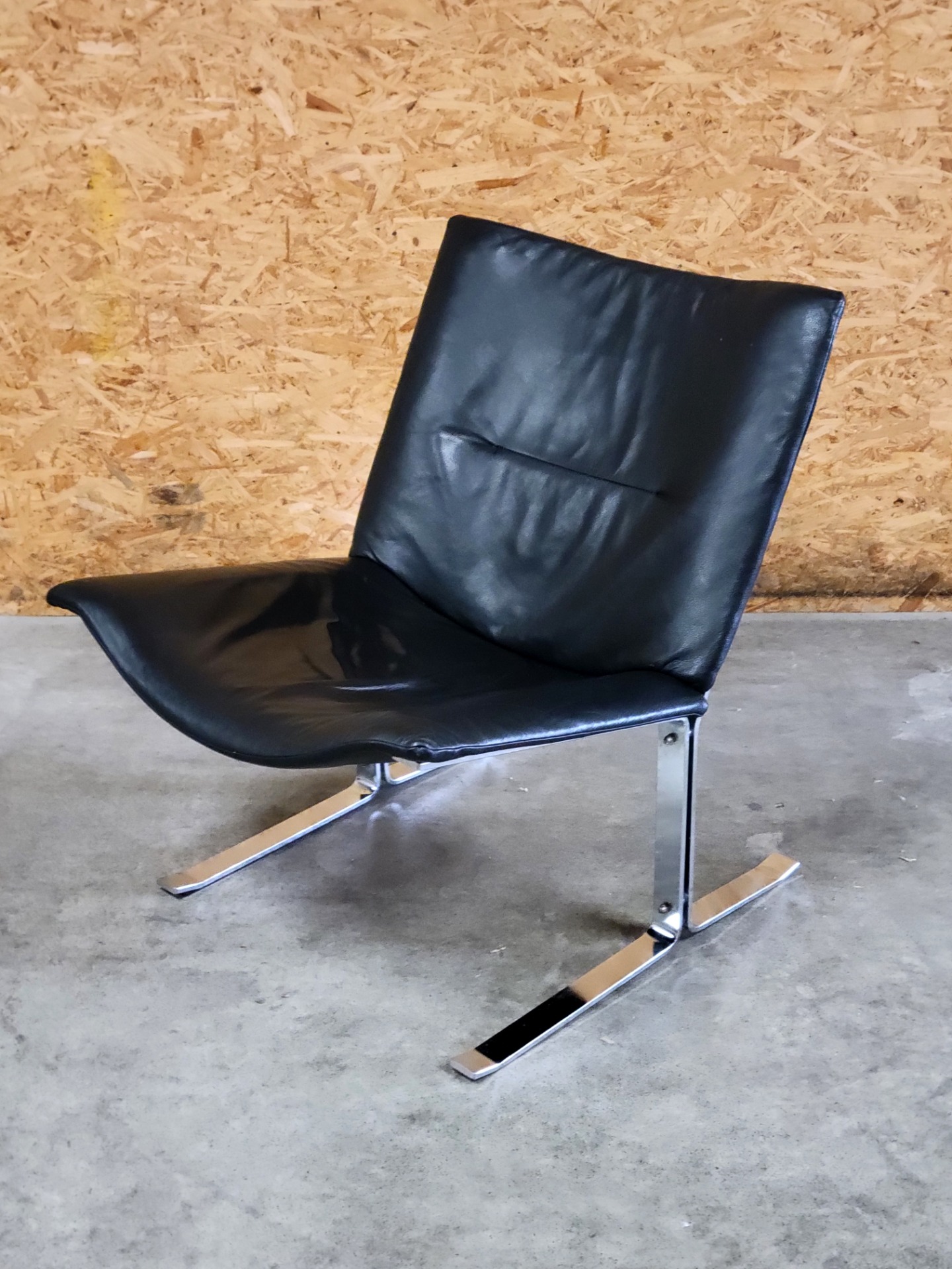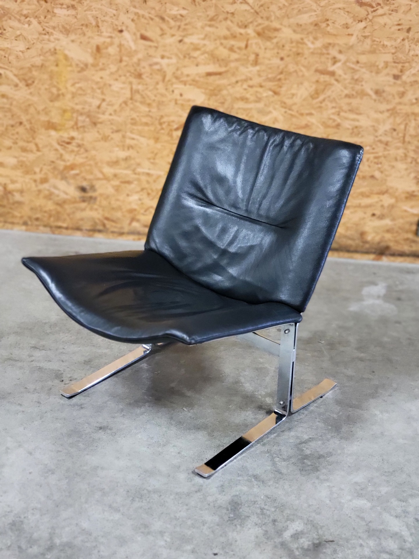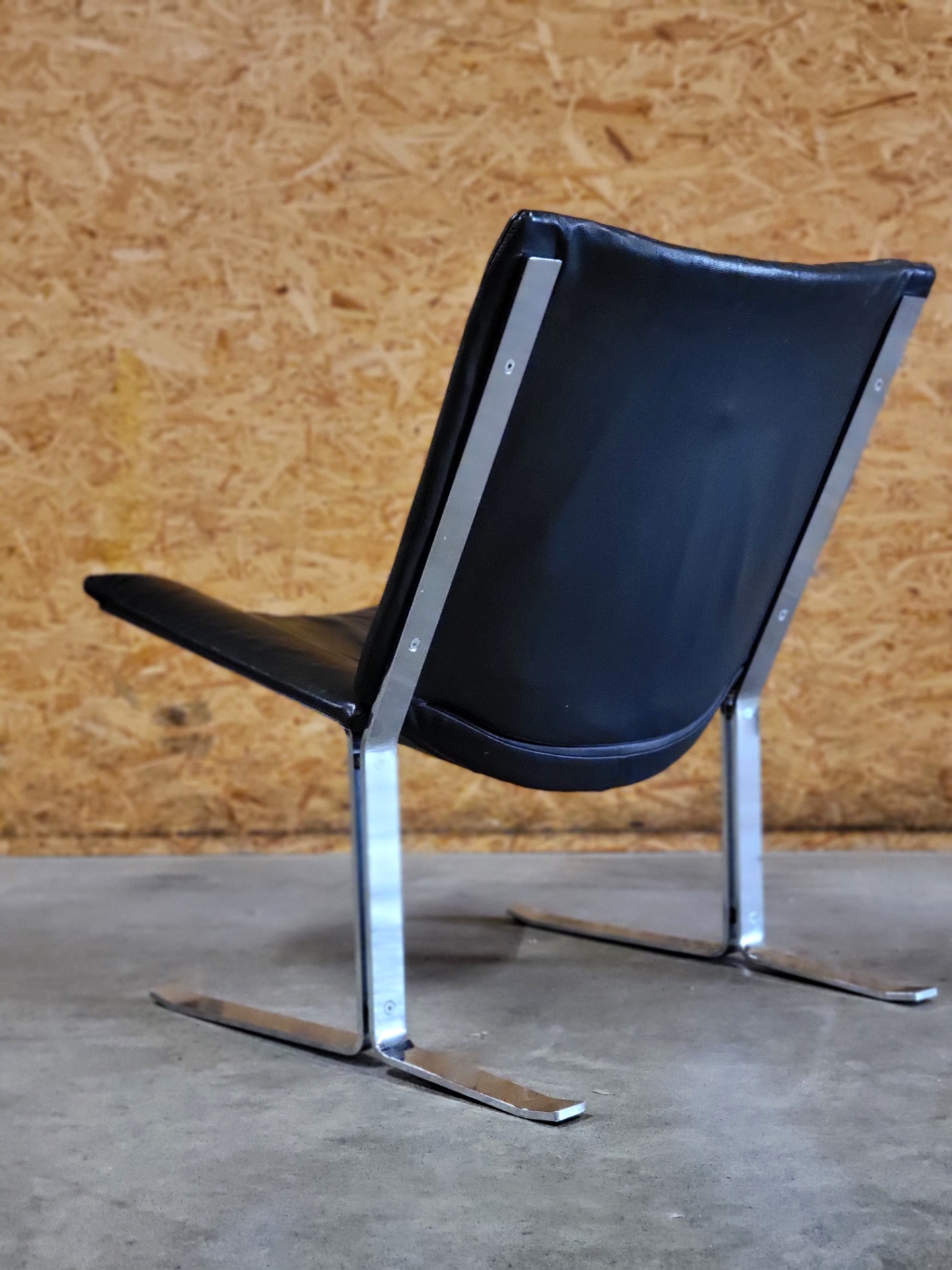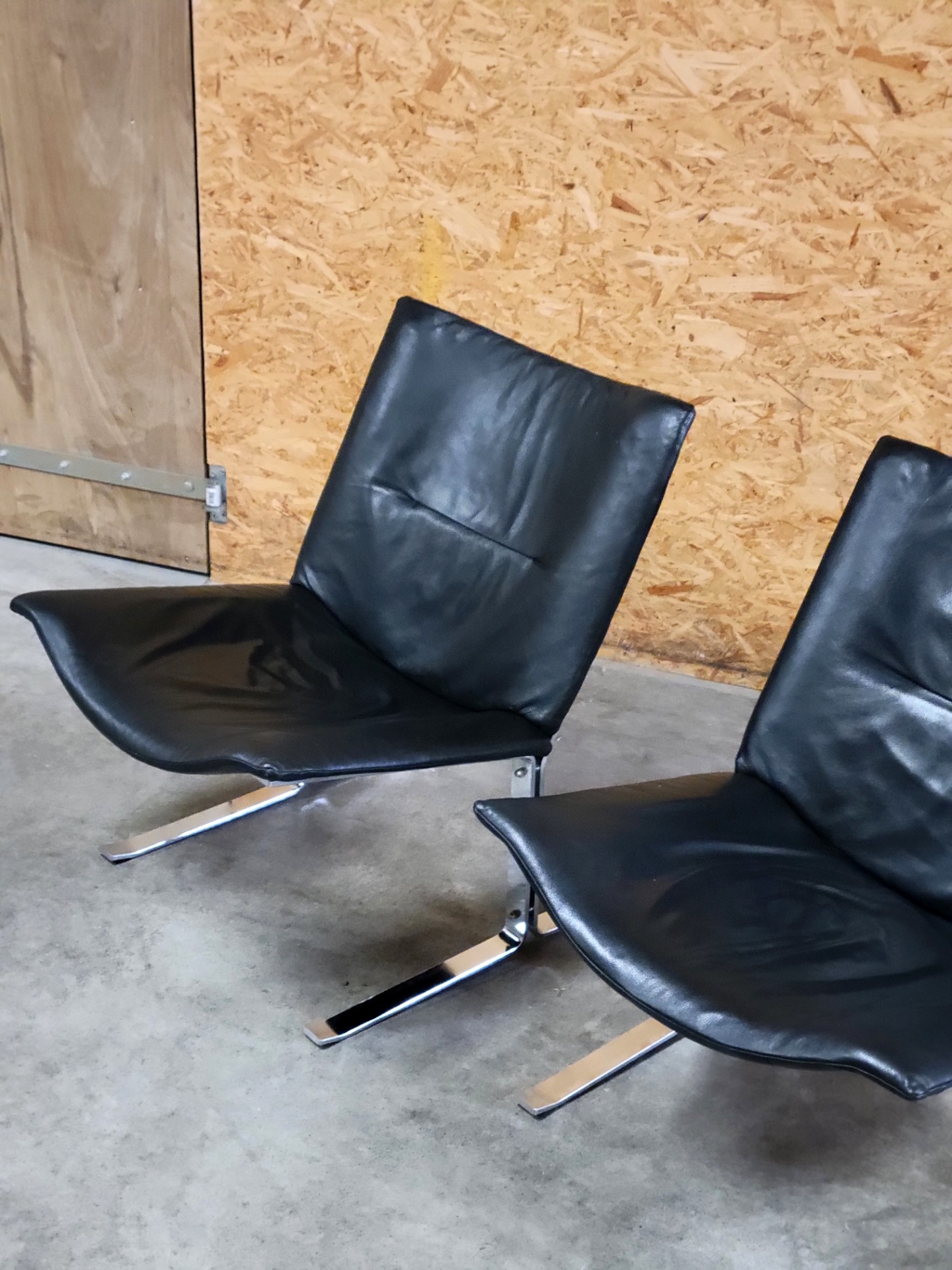 Set van 2 Eagle fauteuils ontworpen en uitgebracht door Kebe Mobler, Denemarken, 1980. De stoelen hebben een bijzonder en zeer herkenbaar Postmodern ontwerp. De gestikte zwart leren zitting rusten op het zware, verchroomde onderstel. Door de combinatie van materiaal gebruik en ontwerp lijkt de zitting haast te zweven. Dit tijdloos design laat zich makkelijk in vele interieurs passen. De set verkeert in nette vintage staat met enkele, niet storende sporen van gebruik. Prijs is voor de set van twee.