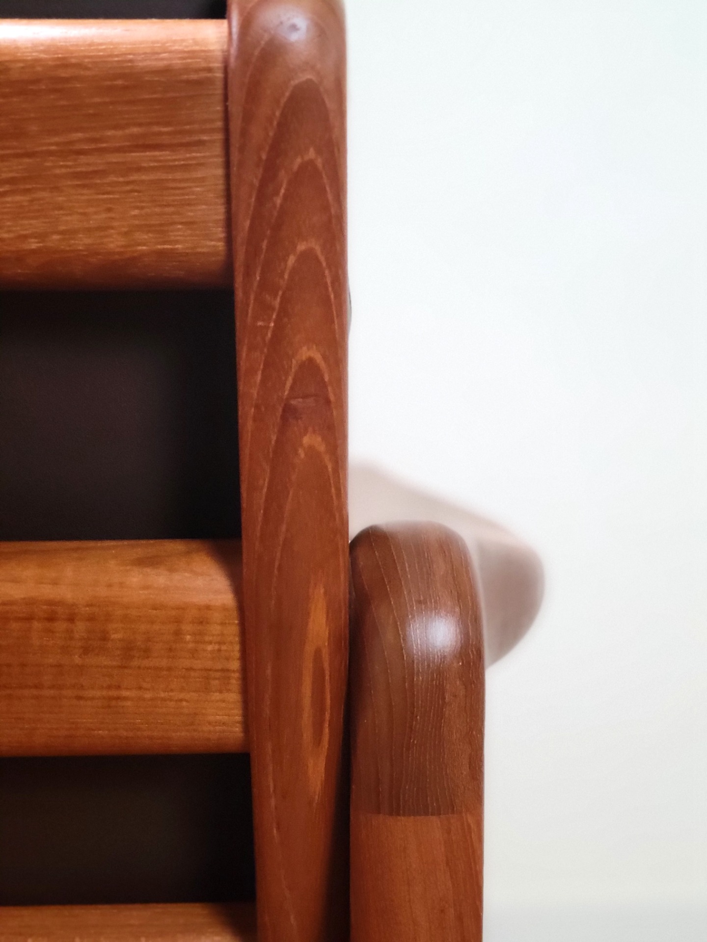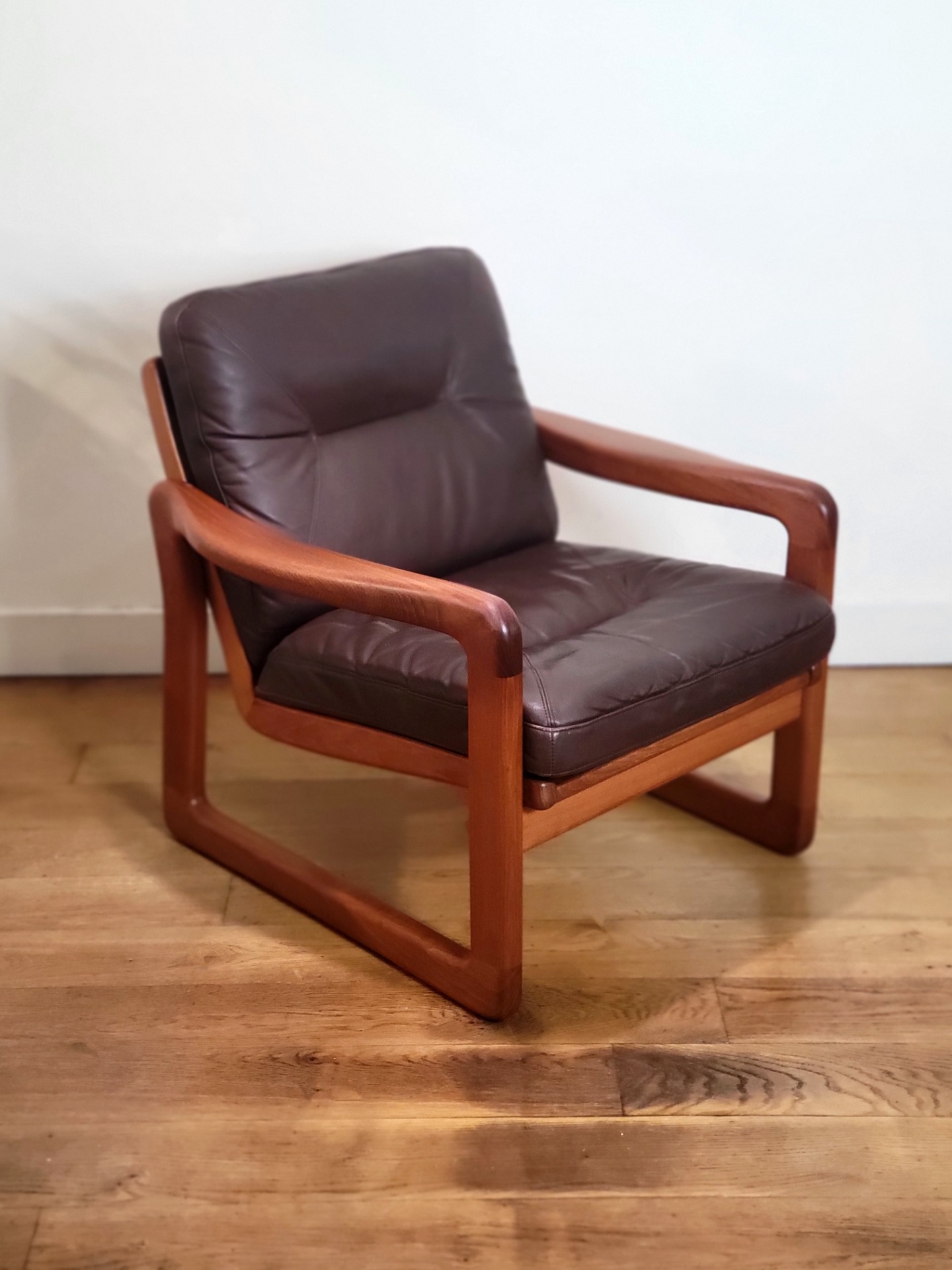 Set van twee vintage fauteuils ontworpen door EMC Furniture, Denemarken jaren '70. Een bijzonder fraai vormgegeven set. Organisch gevormde massief teakhouten frames. Fraaie afgeronde randen, sierlijke houtverbindingen en een prachtig zichtbare houtnerf. De stoelen verkeren in zeer goede staat. Het houtwerk heeft niet of nauwelijks sporen van gebruik. De nog originele donkerbruine leren stoffering is in mooie rijke staat en heeft een prachtig patina. De stoelen hebben een stevige maar zachte zit. Gemerkt aan de onderzijde. Wordt als set aangeboden.
