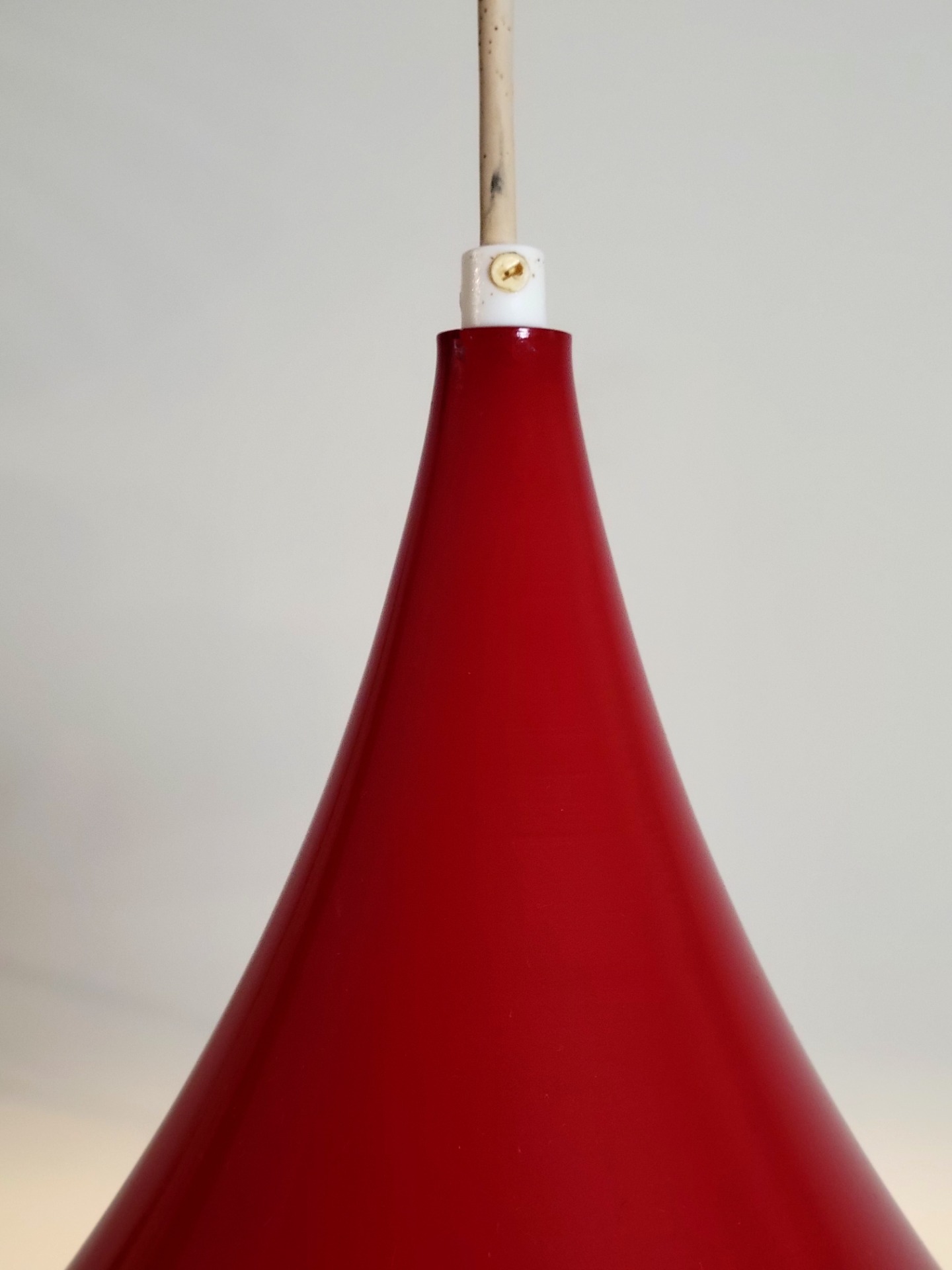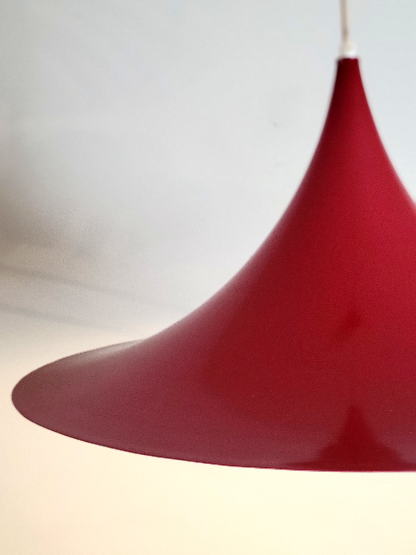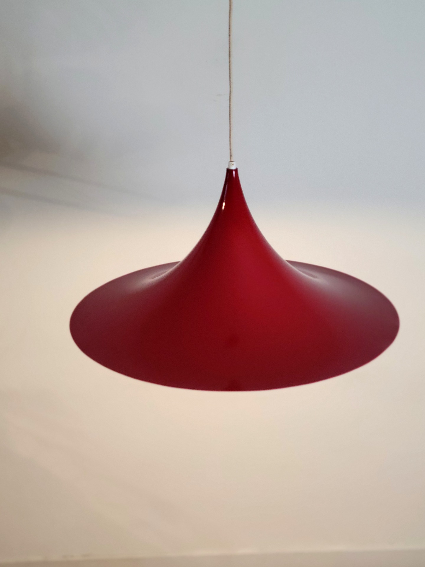 Set van twee grote Deense Semi, trompet of hekenhoed hanglampen, in warm rood. De lampen hebben een doorsnede van maar liefst 61 cm. De vintage trompet hanglamp is in stijl van de bekende Semi hanglamp van Fog & Morup. De lampen worden geleverd met originele rode metalen plafondkap. Beide lampen verkeren in nette vintage staat. Een lamp heeft een kleine verbuiging aan de rand. Geen lakschade.
