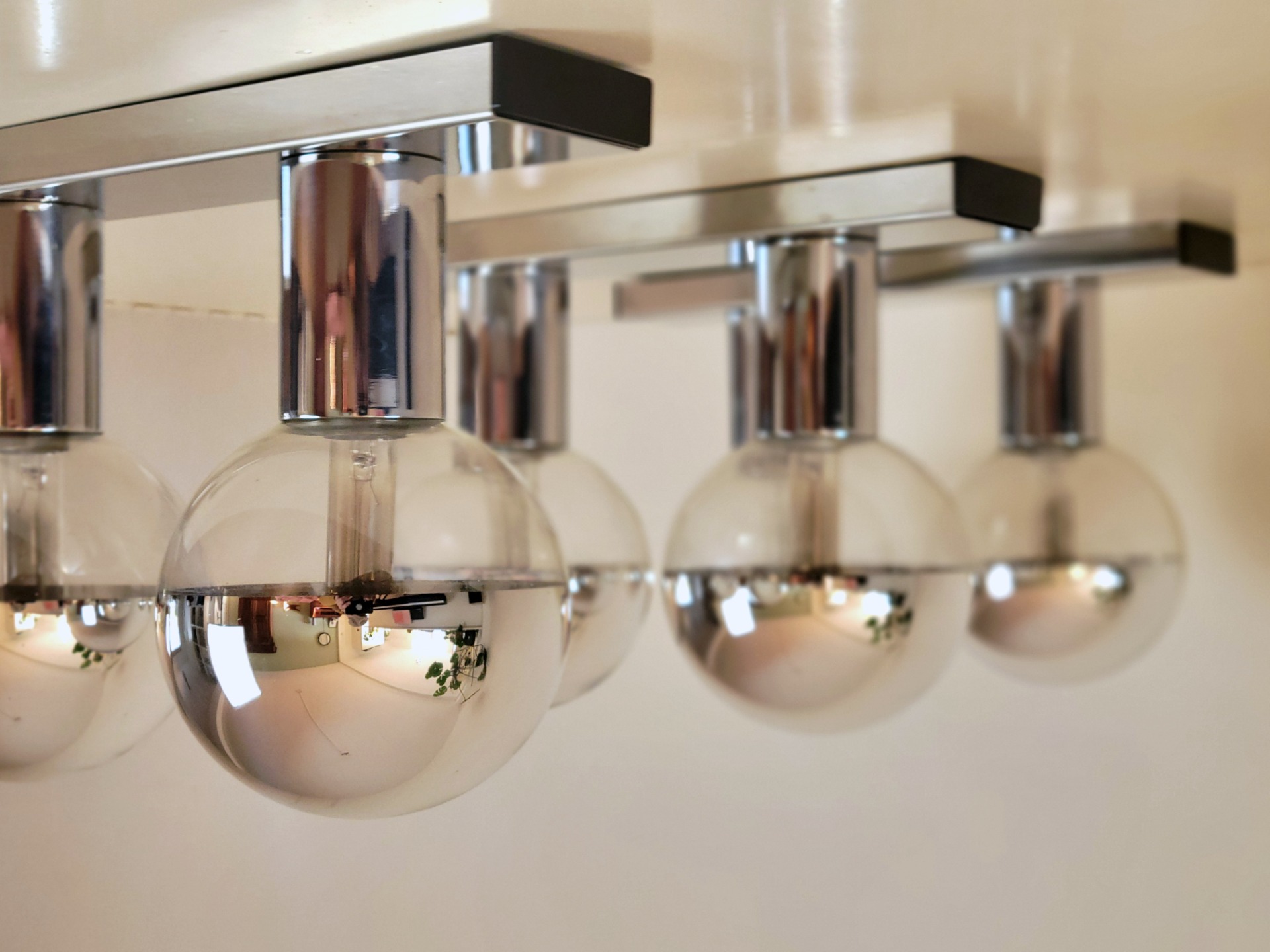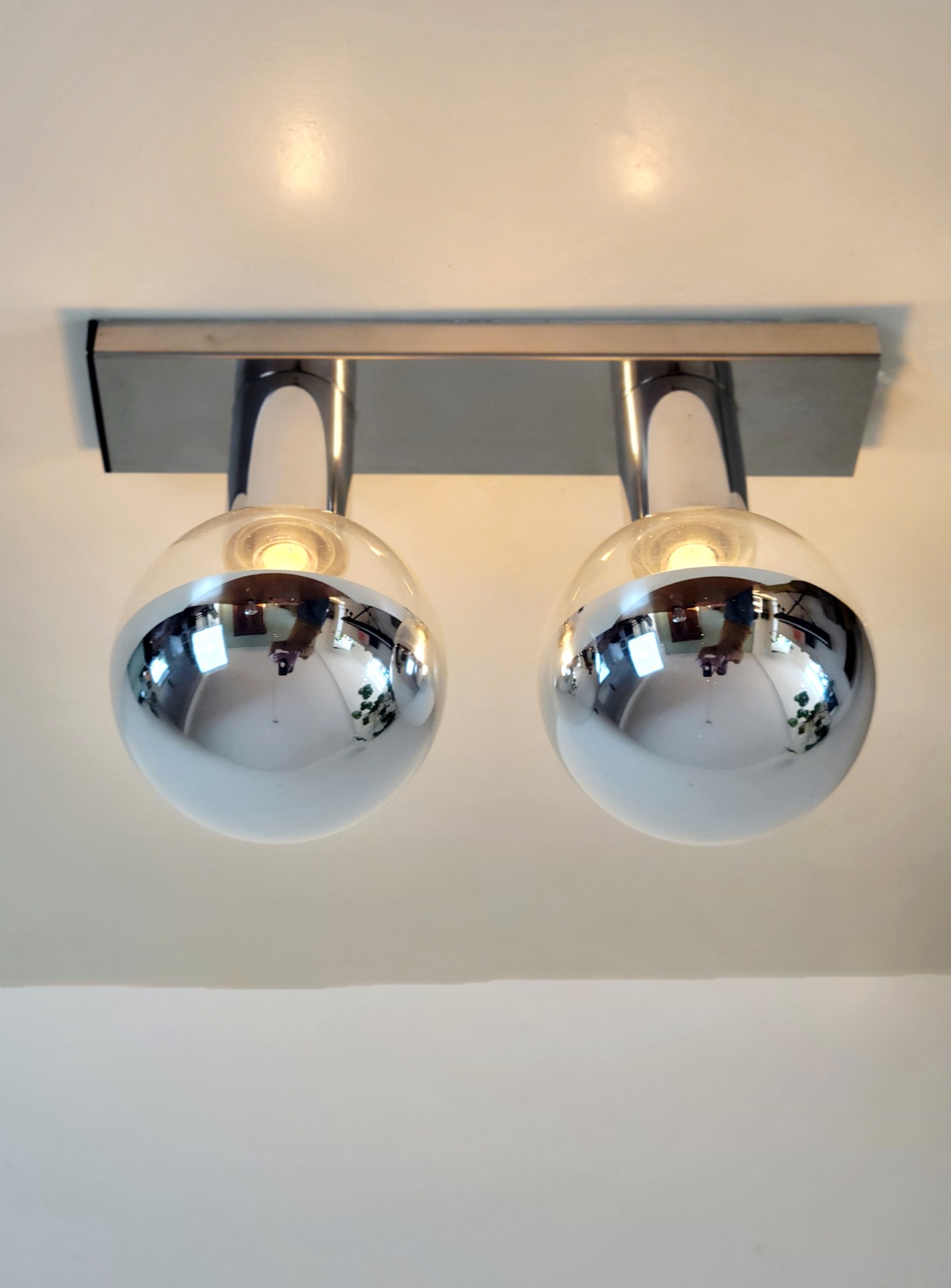 Iconisch, tijdloos en sculpturaal: deze prachtige lampen van Motoko Ishii, geproduceerd door het Duitse Staff Leuchten in 1970. Het ontwerp kenmerkt zich door de minimalistische, geometrische vorm met een hoogglans verchroomde, spiegelende kap. Het licht wordt subtiel en diffuus verspreid, terwijl de reflecterende afwerking zorgt voor een speels effect van ruimte en omgeving. Functioneel én sculpturaal. De lampen verkeren in zeer goede staat. Slechts enkele kleine verfspetters aanwezig , oppervlakkig en nauwelijks storend. Het chroom heeft een mooie glans.