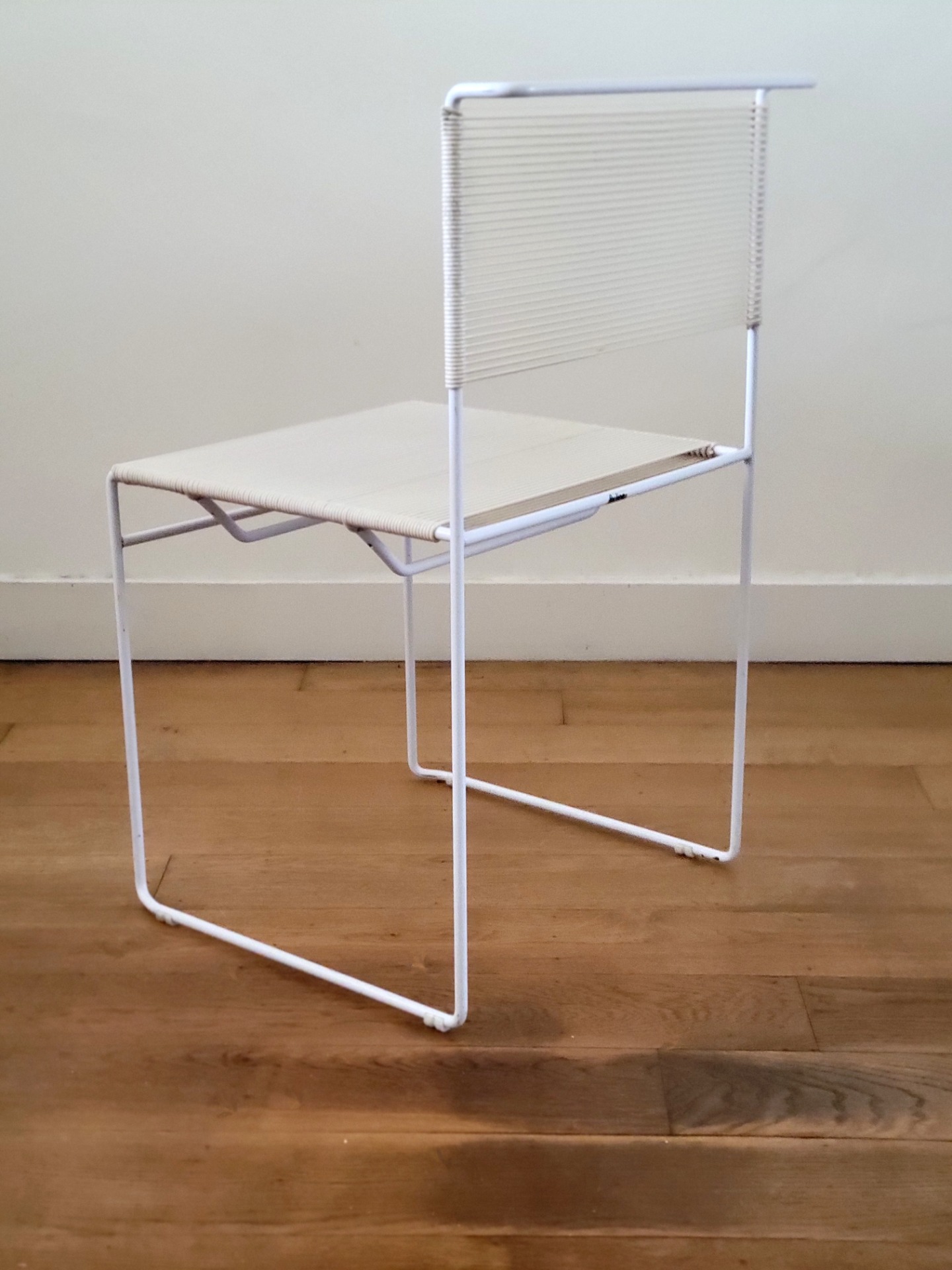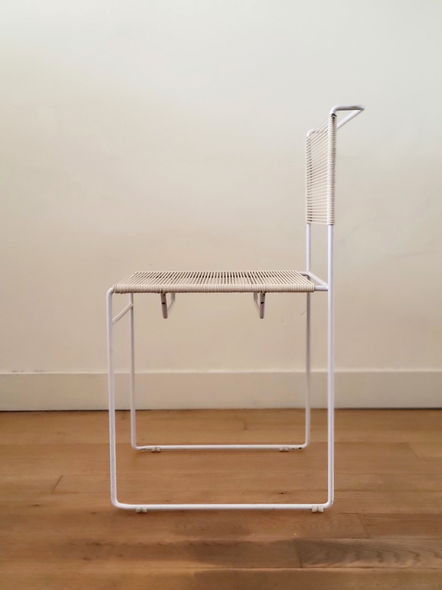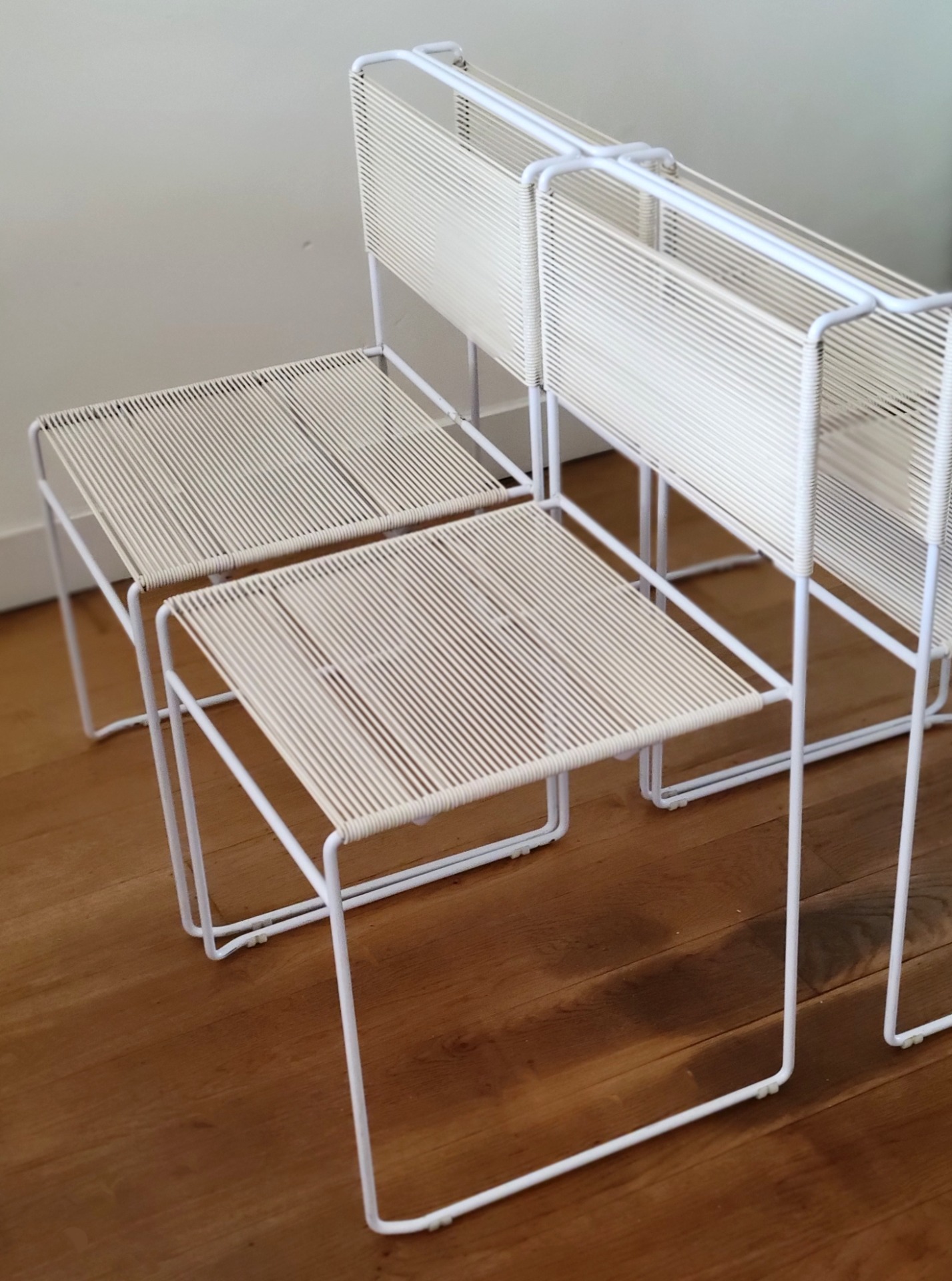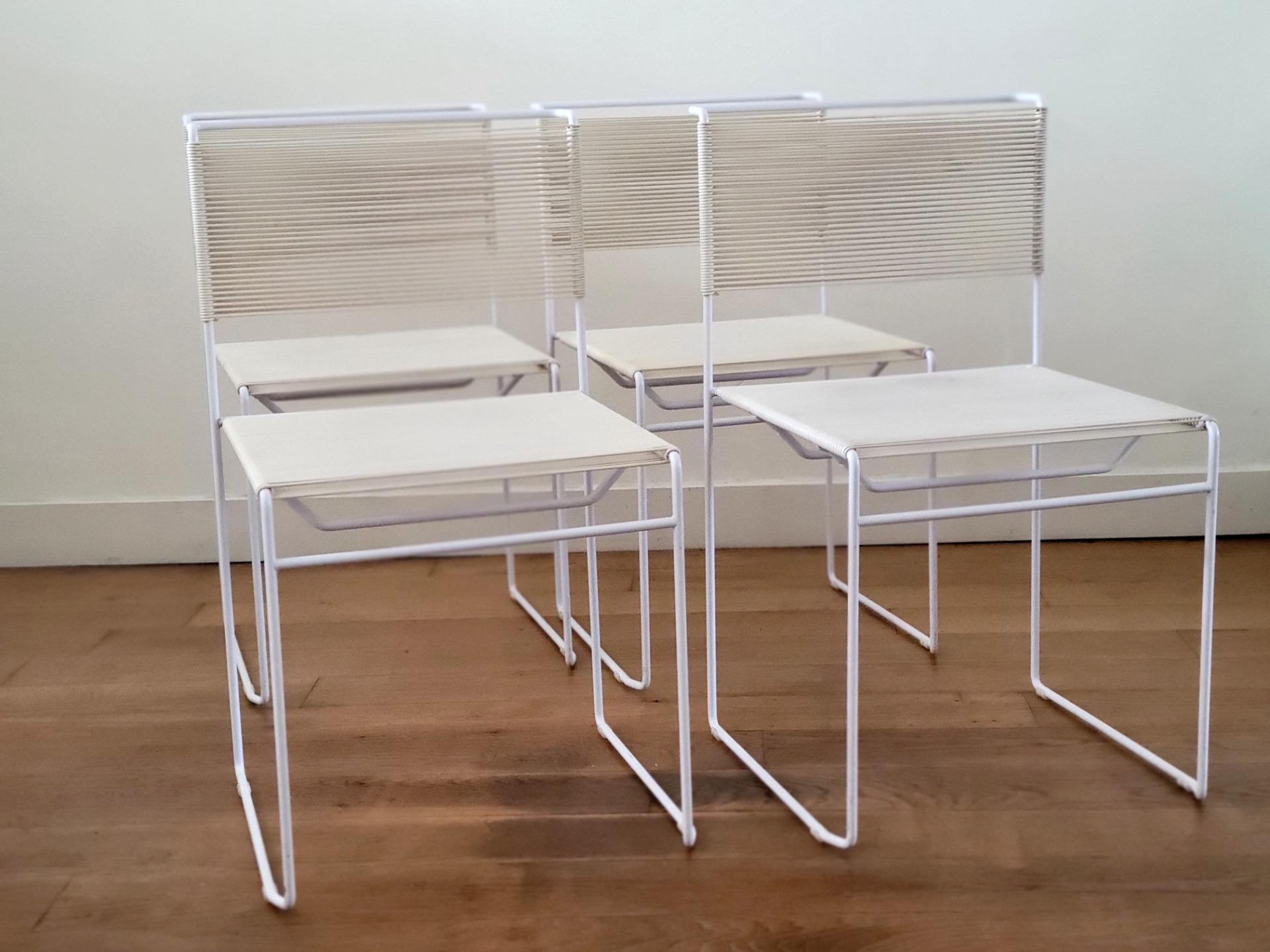Set van 4 vintage stoelen van Giandomenico Bellotti voor Flyline Italy zijn een waar icoon van Italiaans minimalisme en een perfecte mix van elegantie en speelsheid. Bekend als "spaghettistoelen" vanwege hun kenmerkende PVC koordzitting en rugleuning, heeft elke stoel een strak, kubusvormig wit gelakt stalen frame .