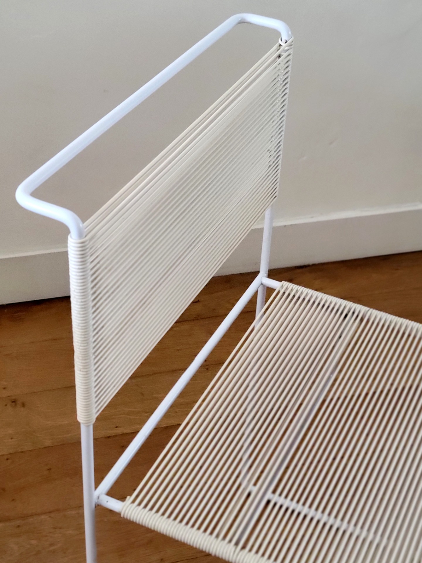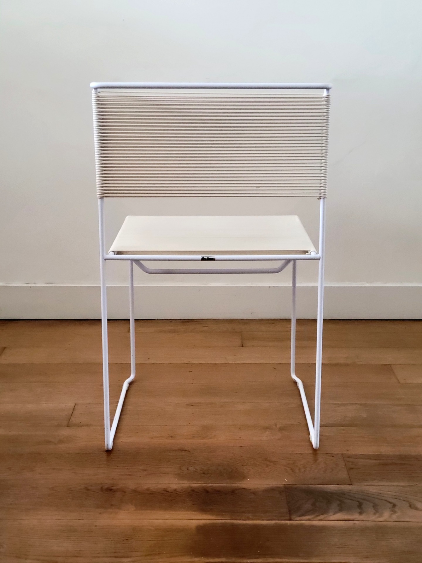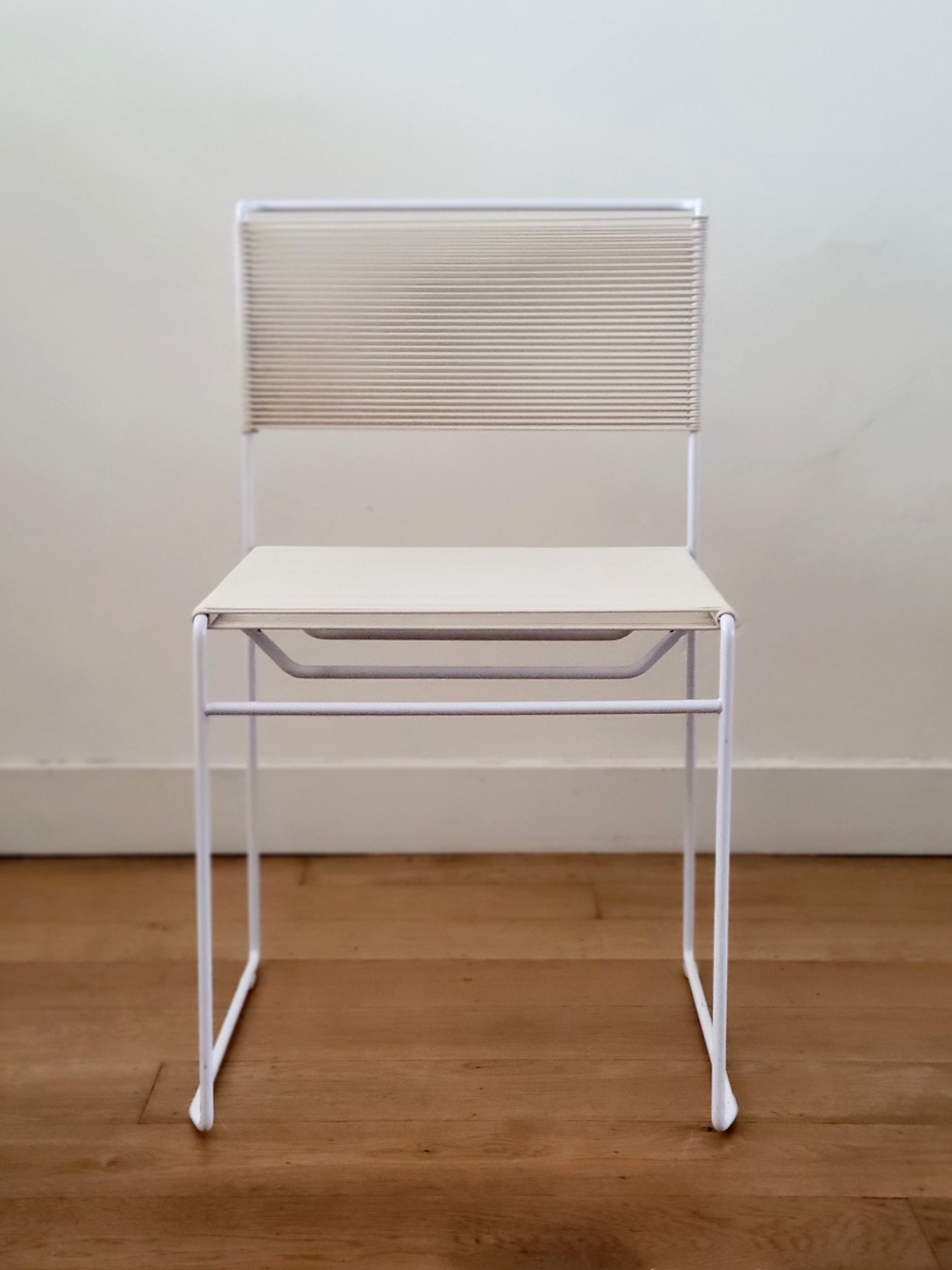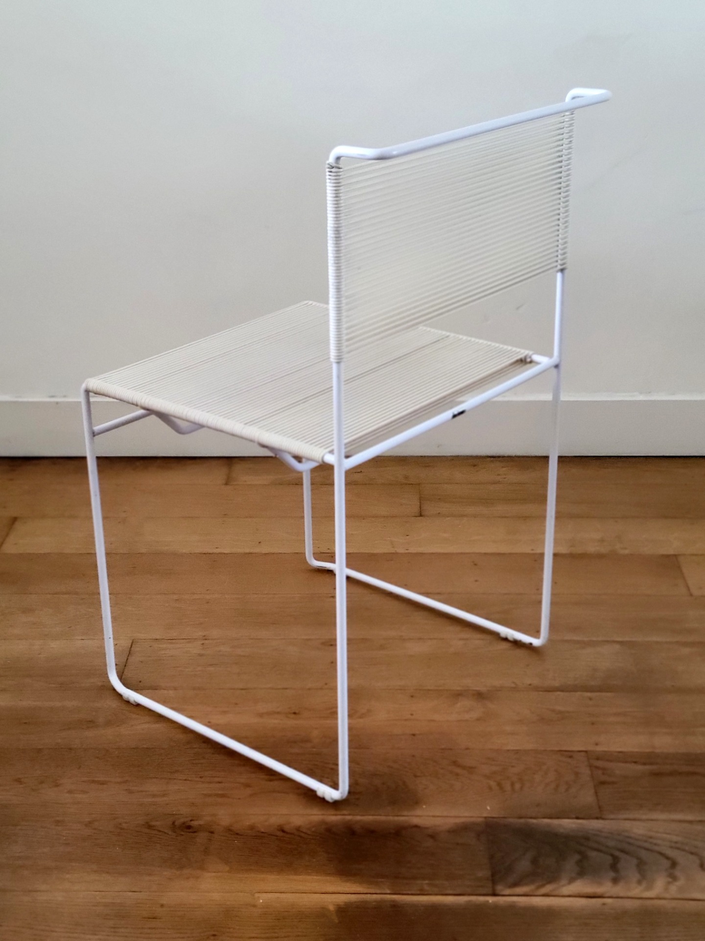 Set van 4 vintage stoelen van Giandomenico Bellotti voor Flyline Italy zijn een waar icoon van Italiaans minimalisme en een perfecte mix van elegantie en speelsheid. Bekend als "spaghettistoelen" vanwege hun kenmerkende PVC koordzitting en rugleuning, heeft elke stoel een strak, kubusvormig wit gelakt stalen frame .