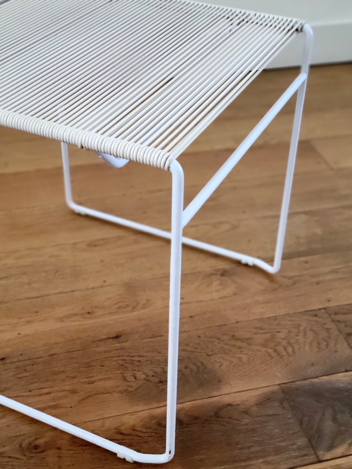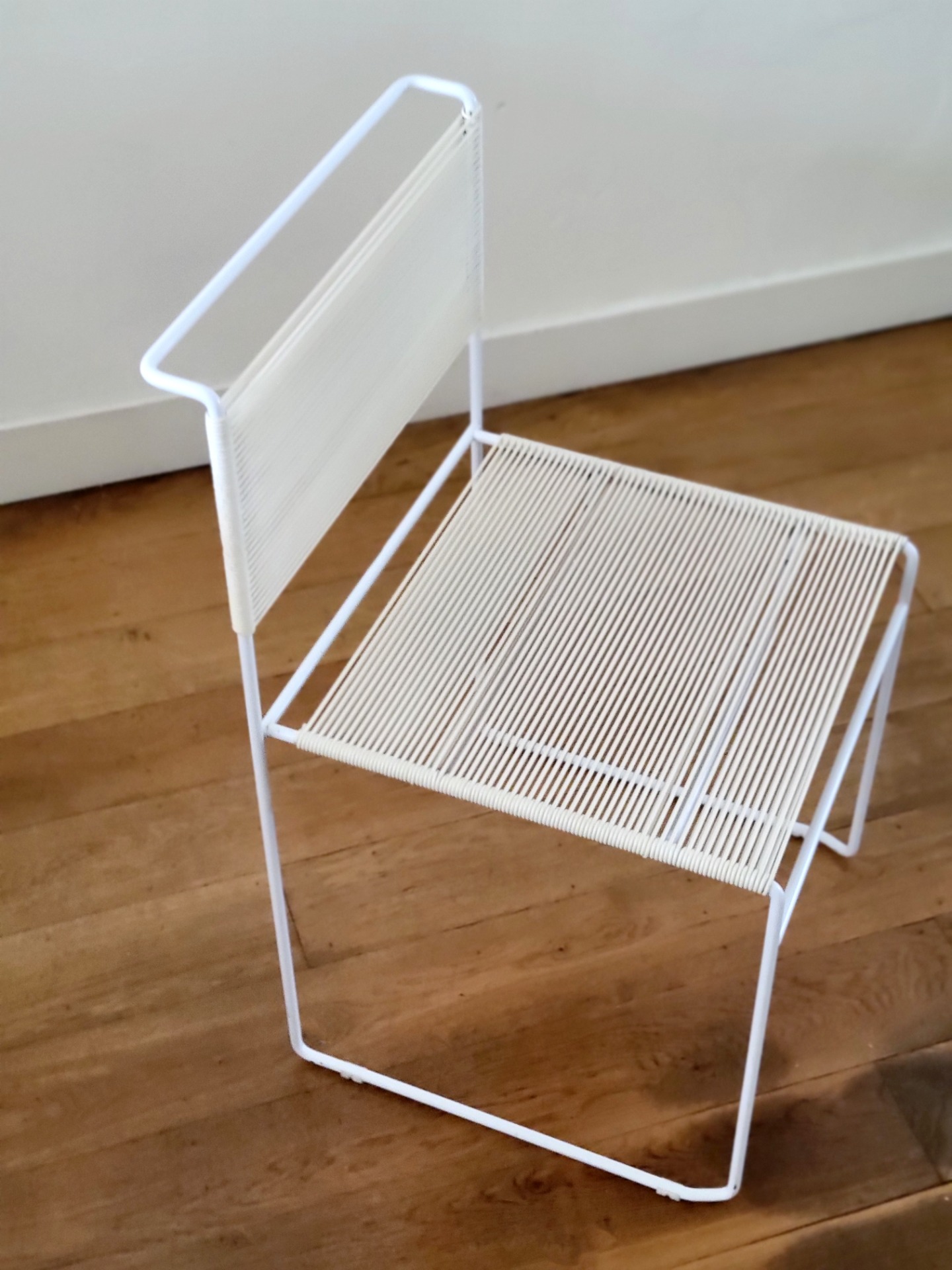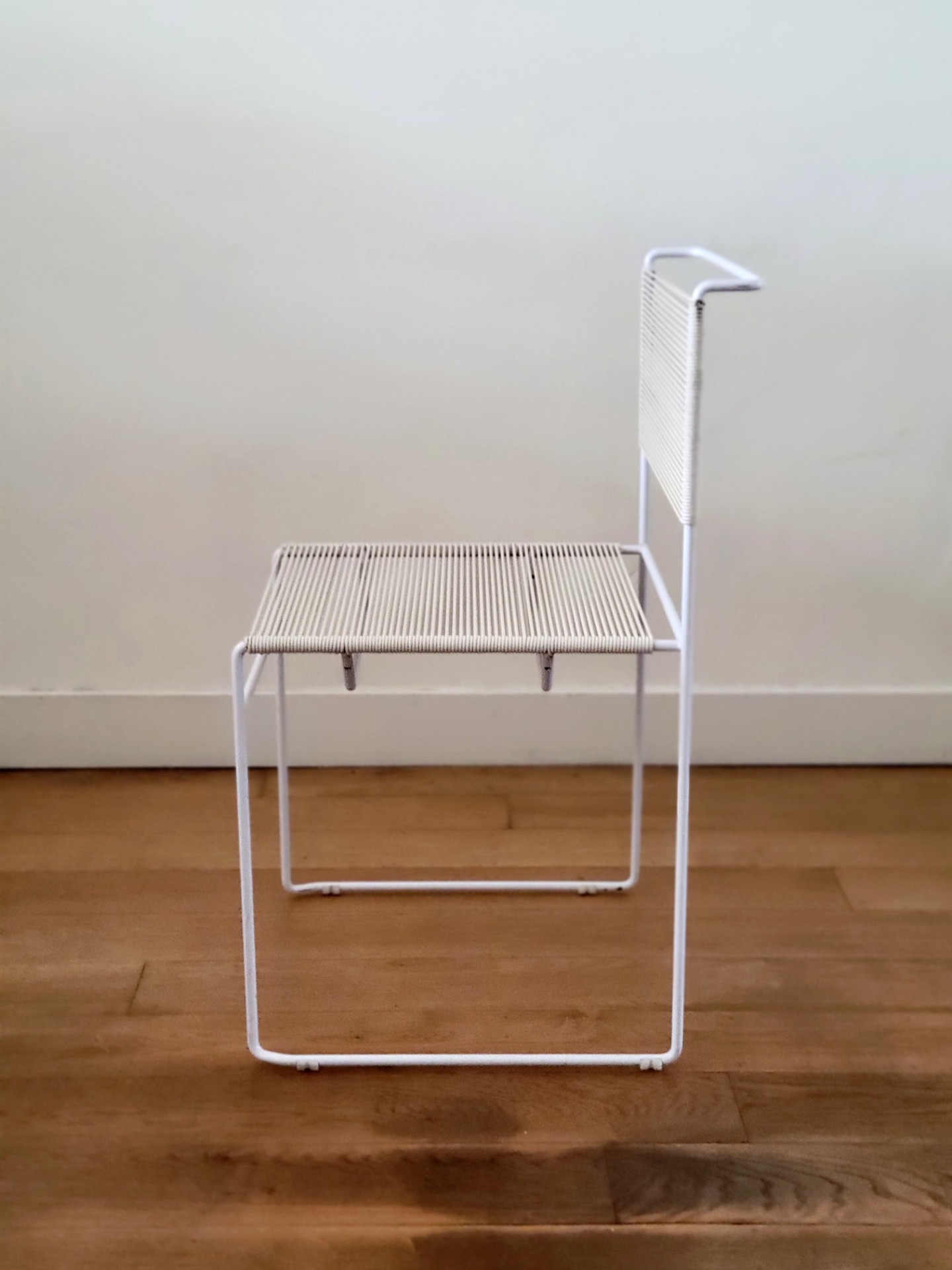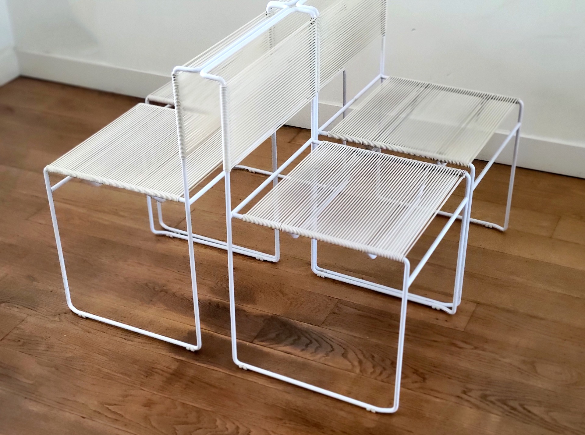 De zitting en rugleuning zijn met de hand bespannen met flexibele koorden, waardoor een comfortabel en toch visueel licht silhouet ontstaat. Hun luchtige ontwerp en strakke geometrie geven ze een tijdloze, moderne uitstraling. De set van vier stoelen verkeren in goede vintage conditie, met kleine gebruikssporen die overeenkomen met de leeftijd. Er is één stoel met een lichte beschadiging op het koord, maar deze is nog stevig en op spanning.