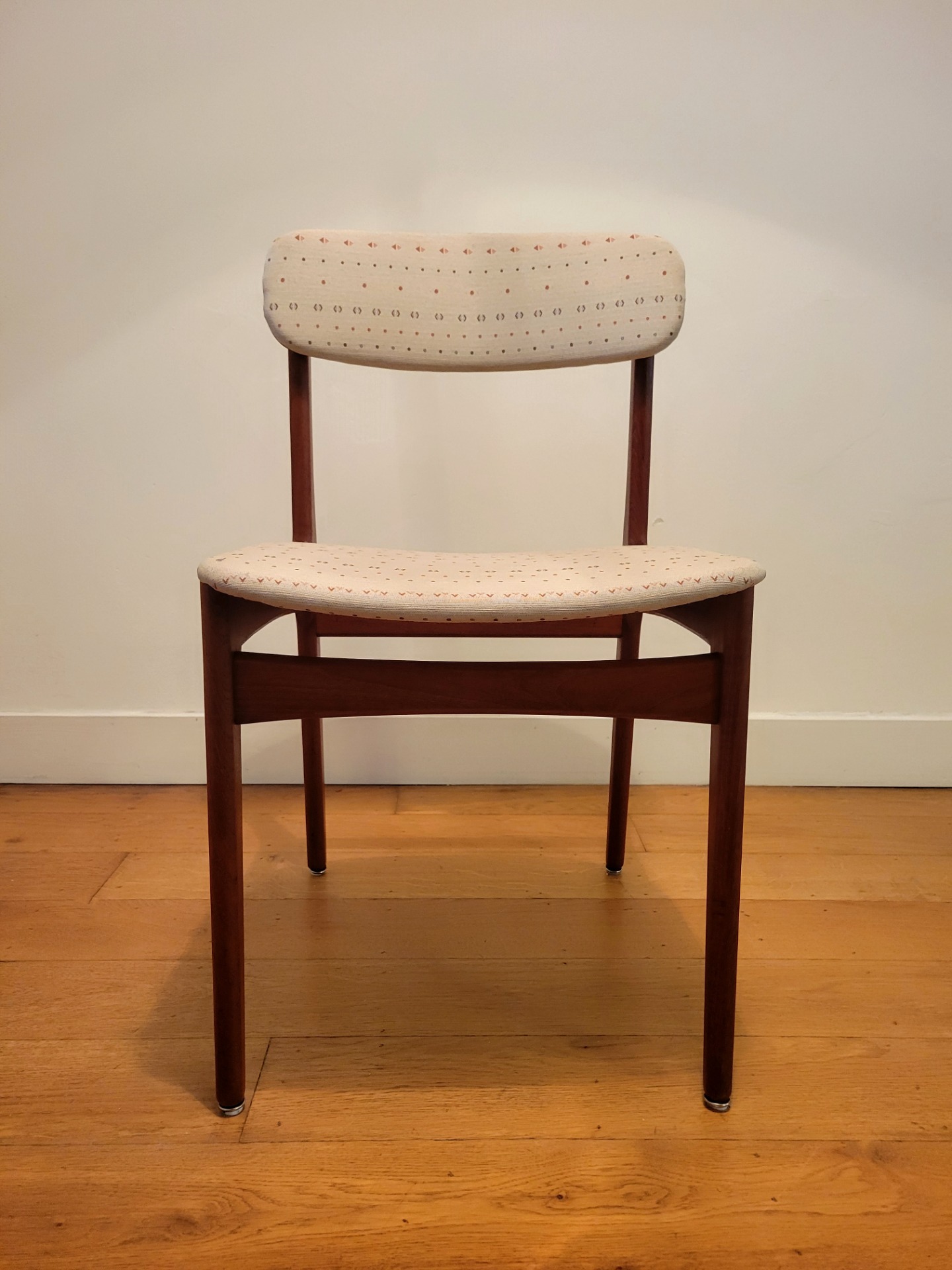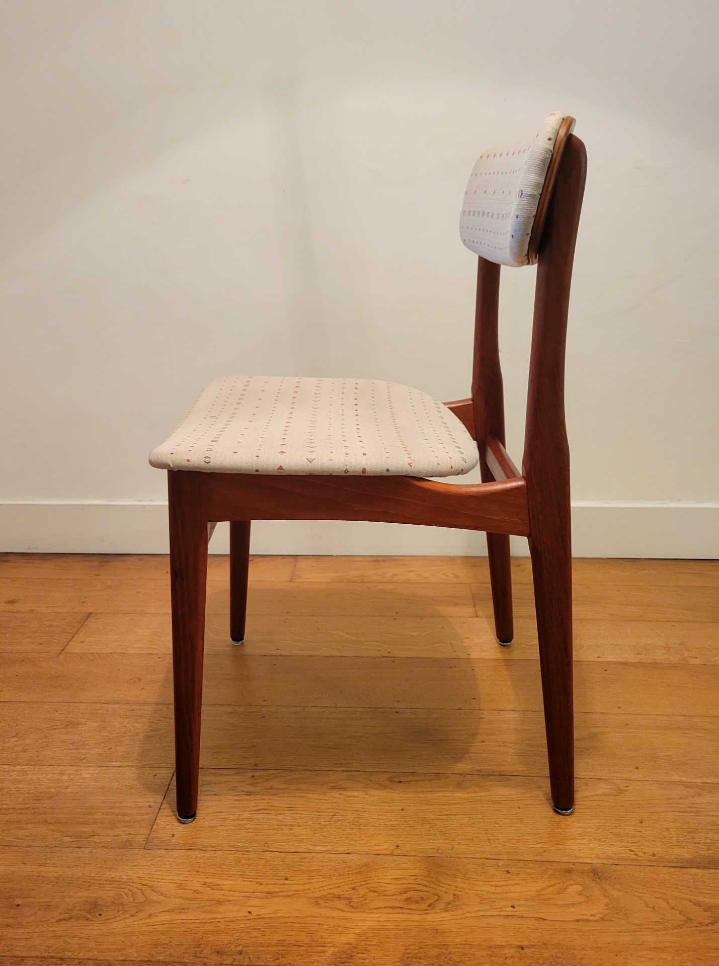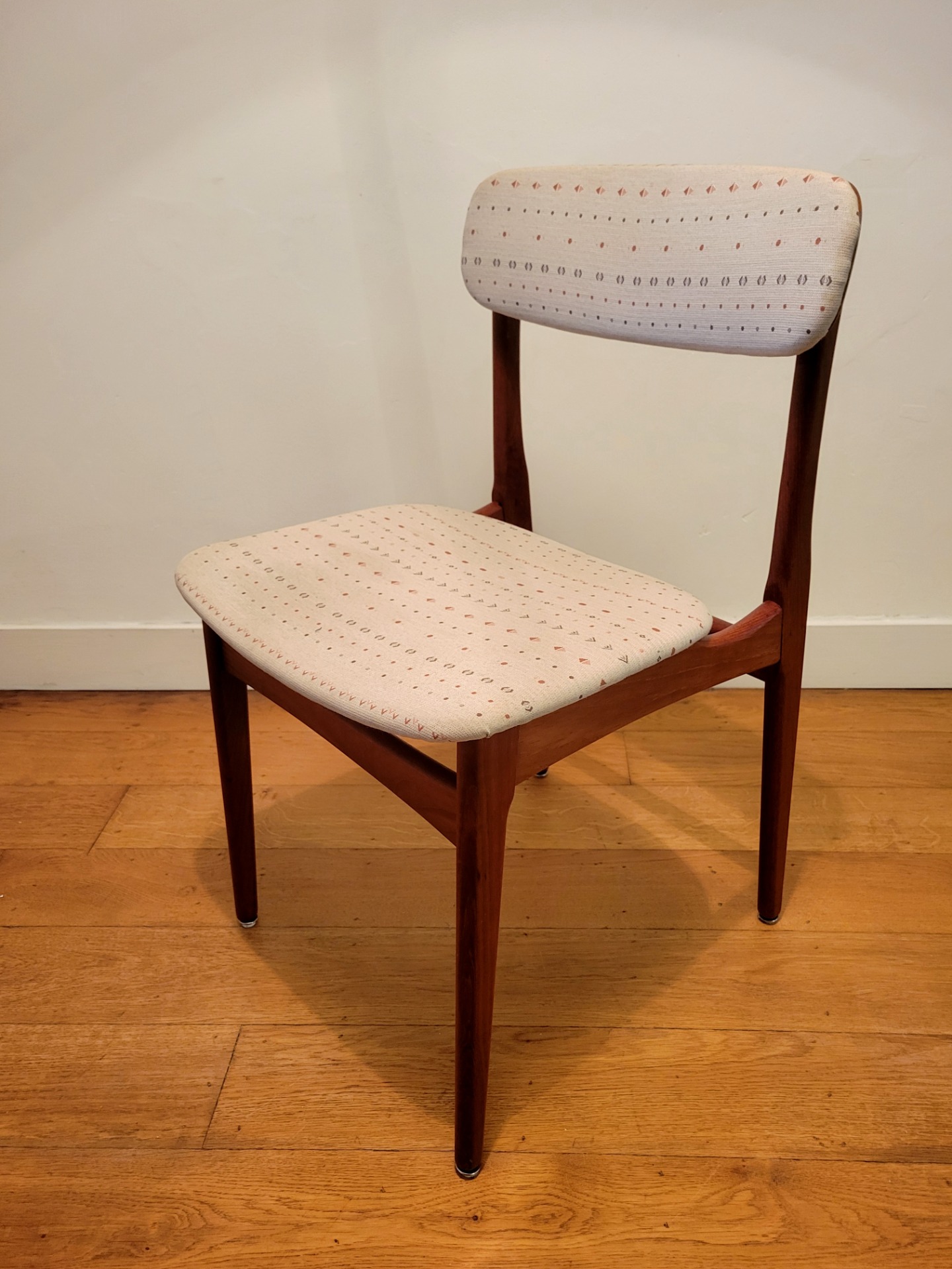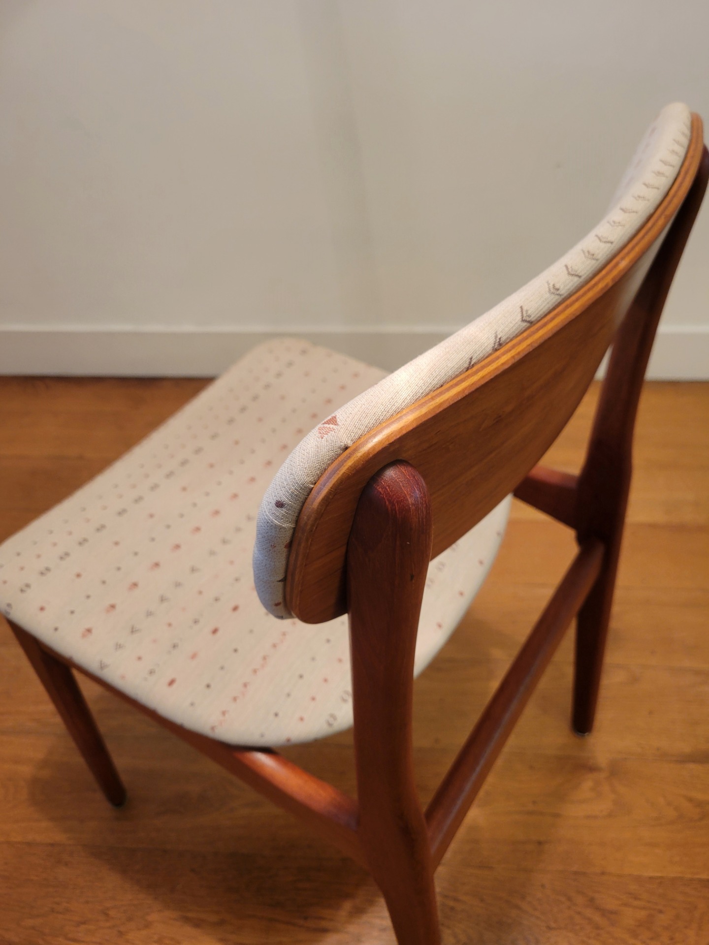 Set van 4 elegante eetkamerstoelen ontworpen door B. Rasmussen en geproduceerd in Denemarken door Thorsø Møbelfabrik in de begin jaren 60. Het ranke en elegante frame van de stoelen zijn van massief teakhout en de rugleuning van teakfineer. De stoelen hebben een lichte stoffering met een typisch Scandinavische print. De set verkeert in nette vintage staat. Het hout werk is opnieuw geolied en heeft slechts enkele lichte gebruikssporen. Eén rugleuning heeft een kleine repartie gehad.