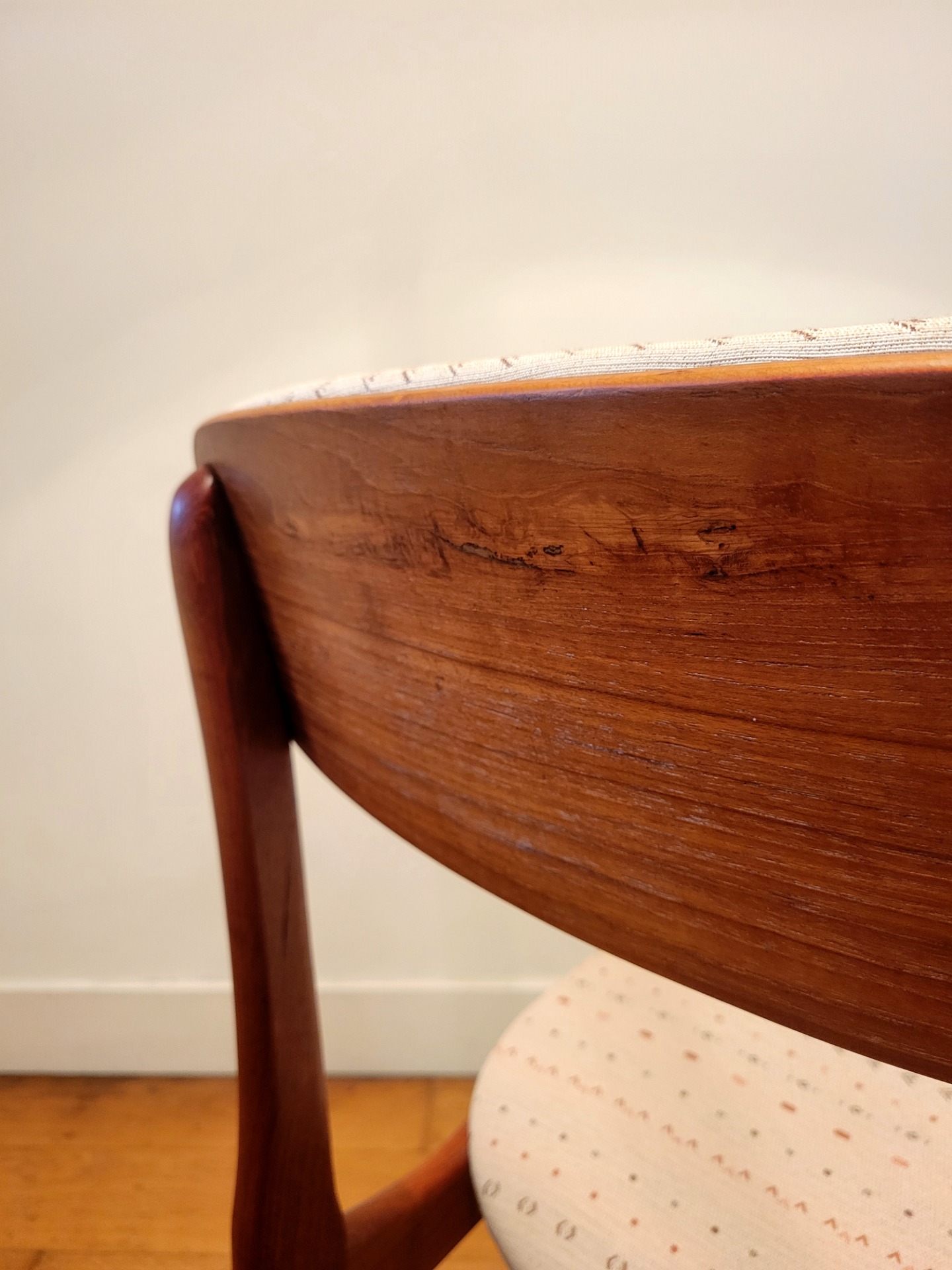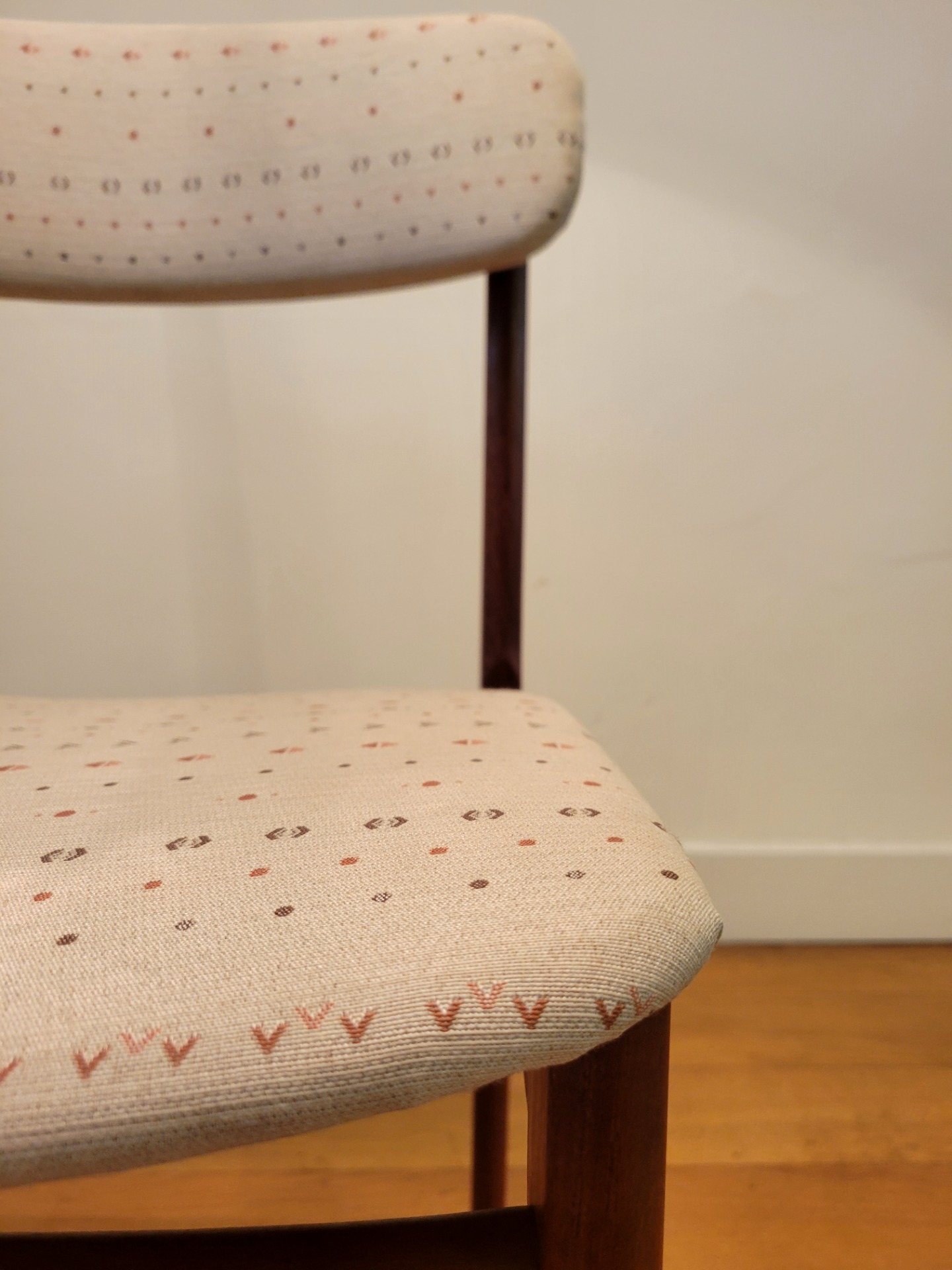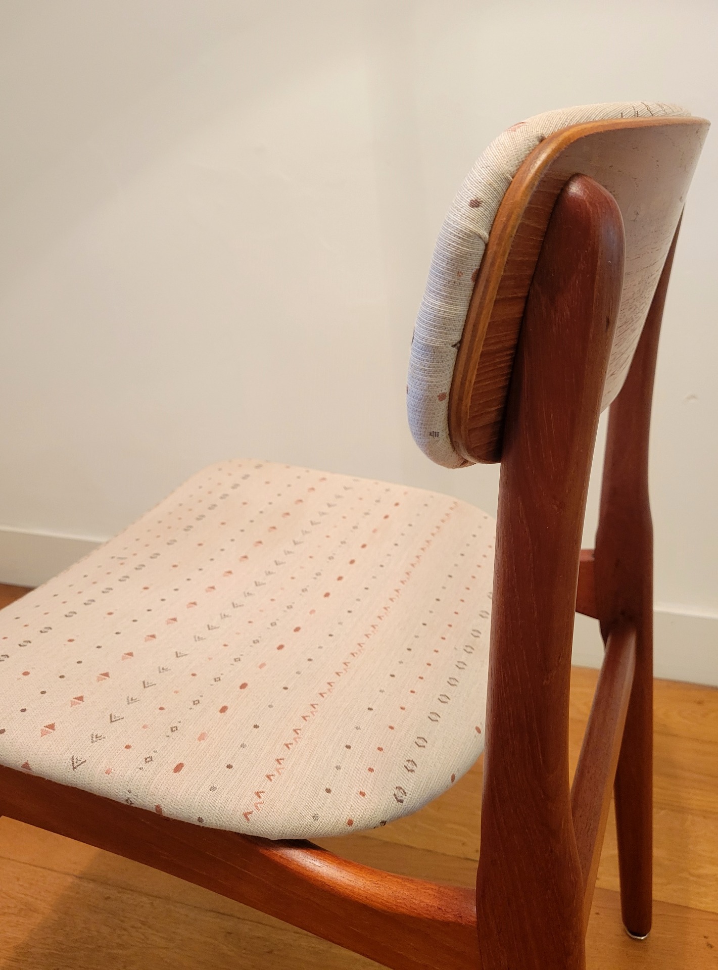 Set van 4 elegante eetkamerstoelen ontworpen door B. Rasmussen en geproduceerd in Denemarken door Thorsø Møbelfabrik in de begin jaren 60. Het ranke en elegante frame van de stoelen zijn van massief teakhout en de rugleuning van teakfineer. De stoelen hebben een lichte stoffering met een typisch Scandinavische print. De set verkeert in nette vintage staat. Het hout werk is opnieuw geolied en heeft slechts enkele lichte gebruikssporen. Eén rugleuning heeft een kleine repartie gehad.