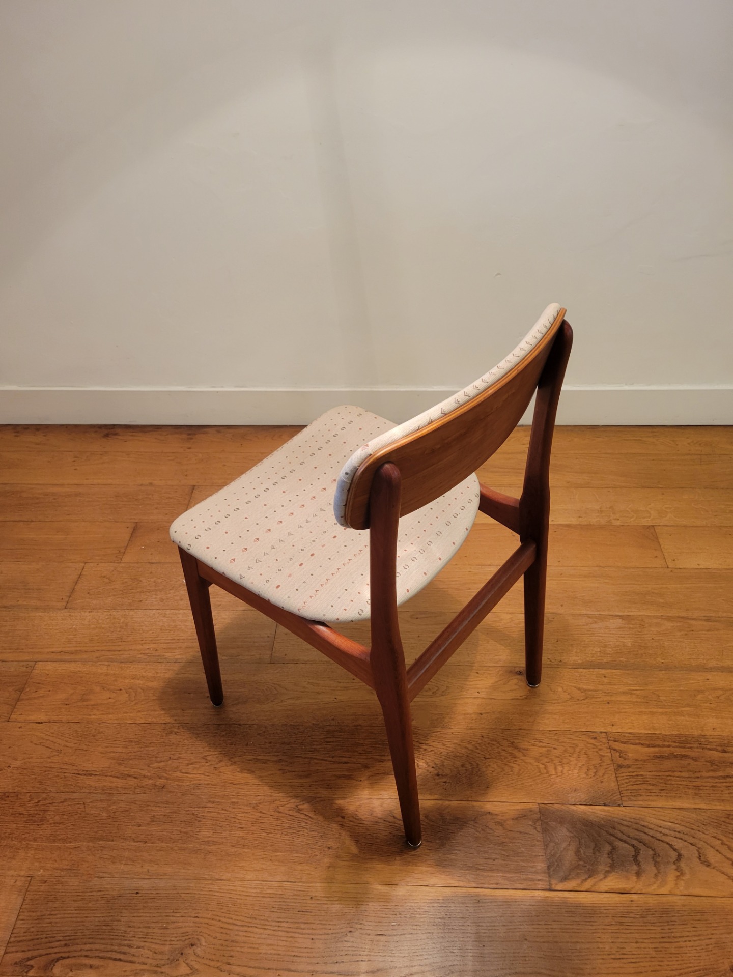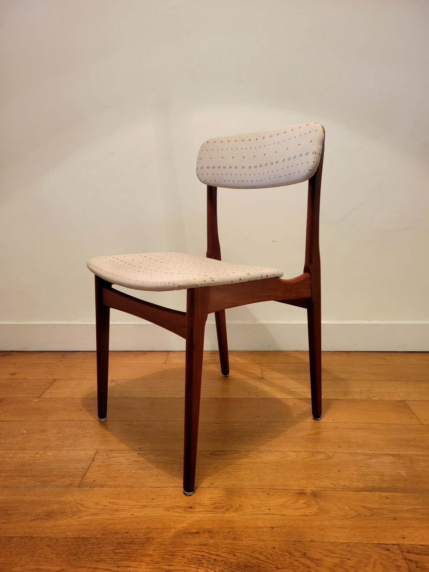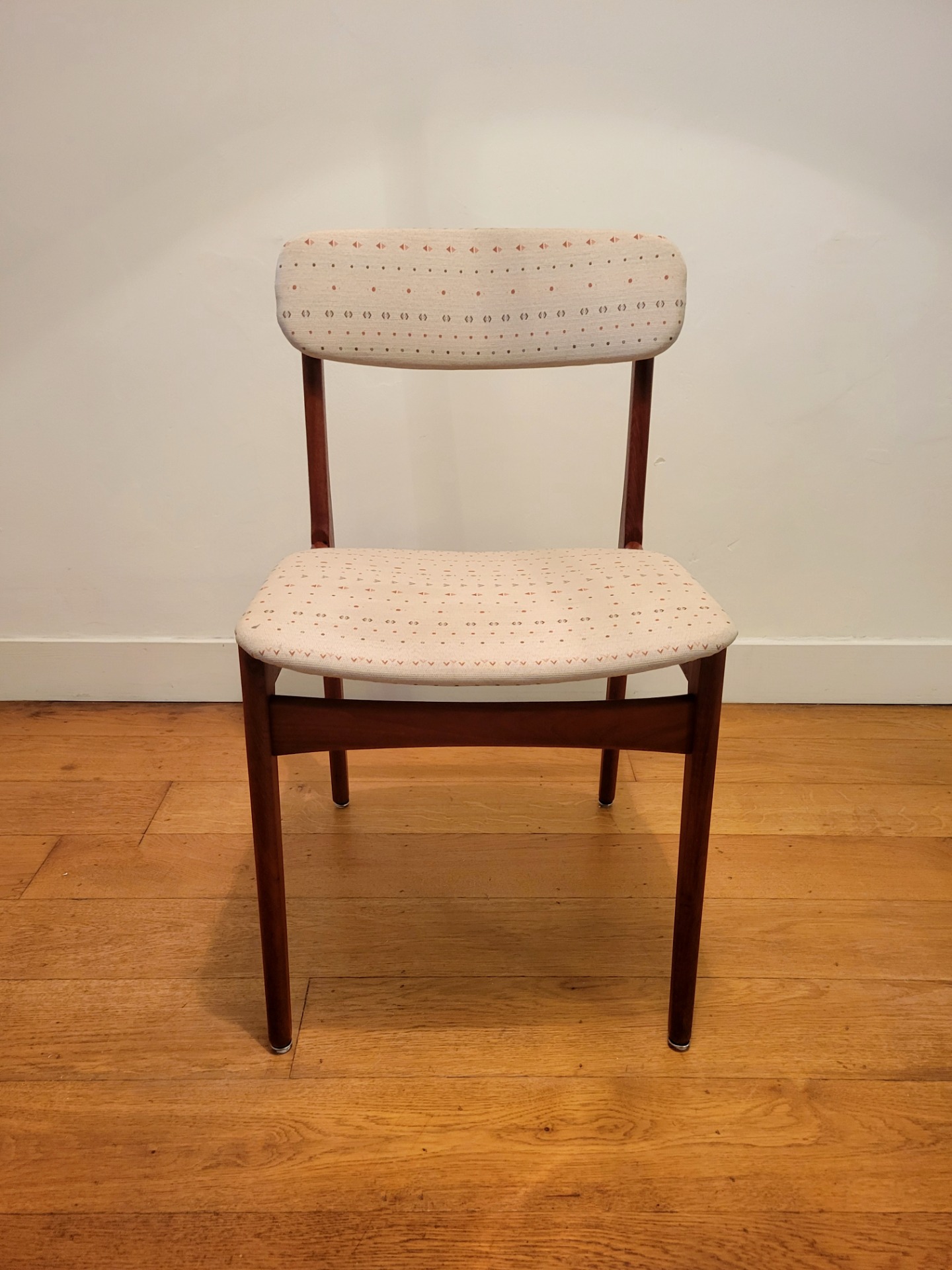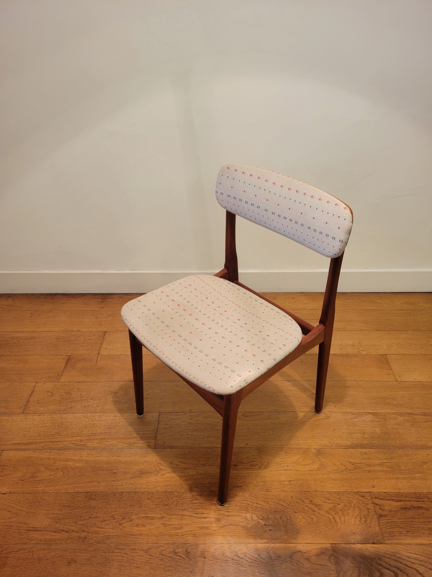 Set van 4 elegante eetkamerstoelen ontworpen door B. Rasmussen en geproduceerd in Denemarken door Thorsø Møbelfabrik in de begin jaren 60. Het ranke en elegante frame van de stoelen zijn van massief teakhout en de rugleuning van teakfineer. De stoelen hebben een lichte stoffering met een typisch Scandinavische print. De set verkeert in nette vintage staat. Het hout werk is opnieuw geolied en heeft slechts enkele lichte gebruikssporen. Eén rugleuning heeft een kleine repartie gehad.
