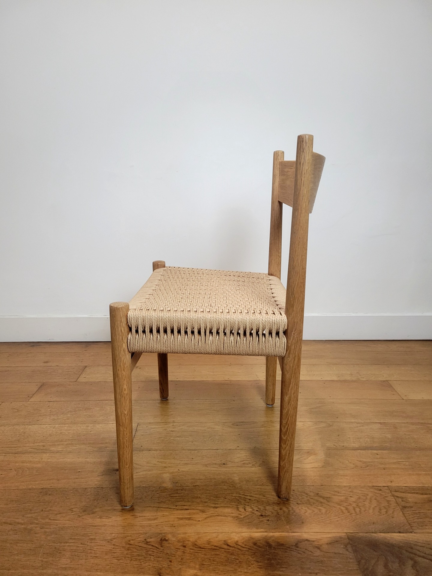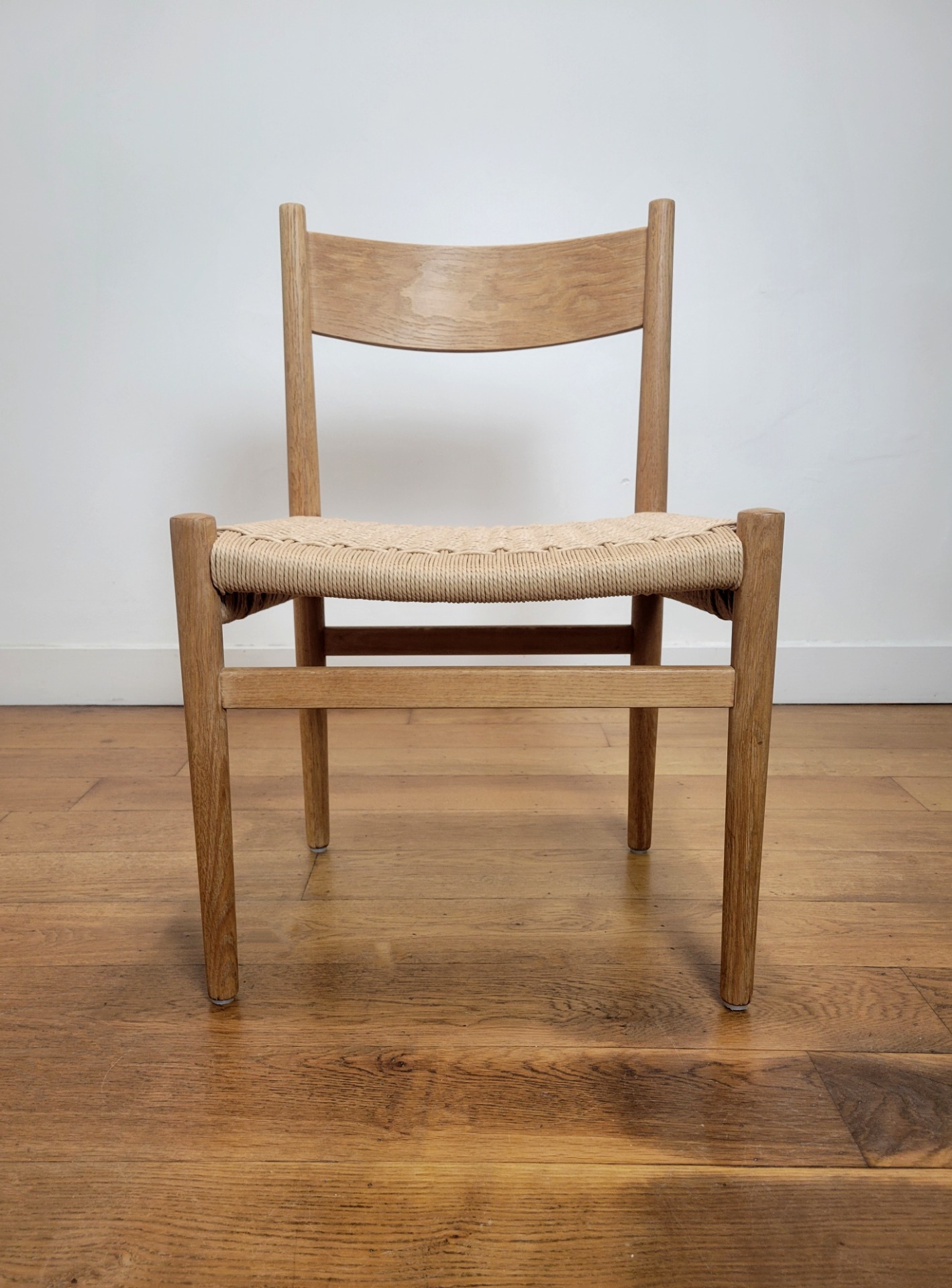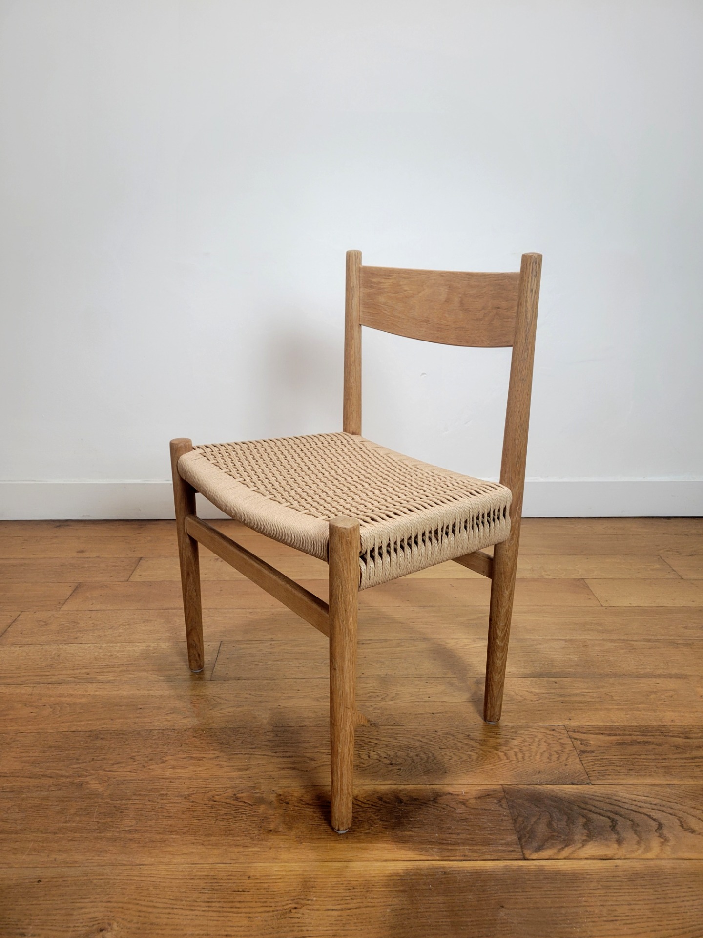 Bijzondere set van zes Ch40 eetkamerstoelen ontworpen door Hans J. Wegner voor Carl Hansen, Denemarken 1960. Het ontwerp is helder en krachtig, de verhoudingen zijn perfect in balans. Op het eerste oog een vrij minimalistisch stoel, maar door de combinatie van de gebruikte materialen; massief eikenhout en papercord, krijgt de stoel een warme natuurlijke uitstraling. De CH40 is niet lang in productie geweest en wordt daardoor ook niet vaak aangeboden. De stoelen verkeren in uitstekende staat. Het houtwerk is gerestaureerd en de zittingen zijn voorzien van nieuw papercord.