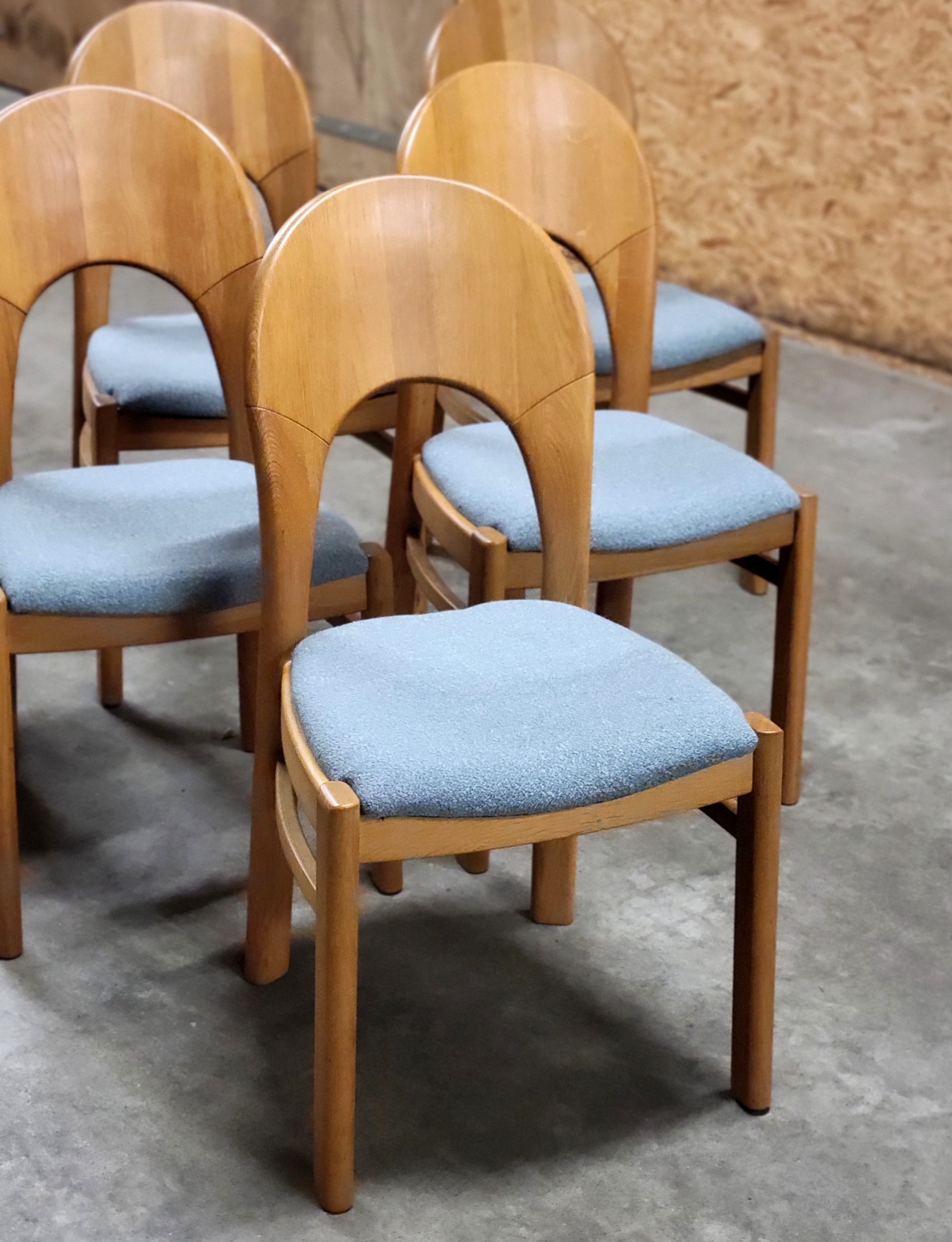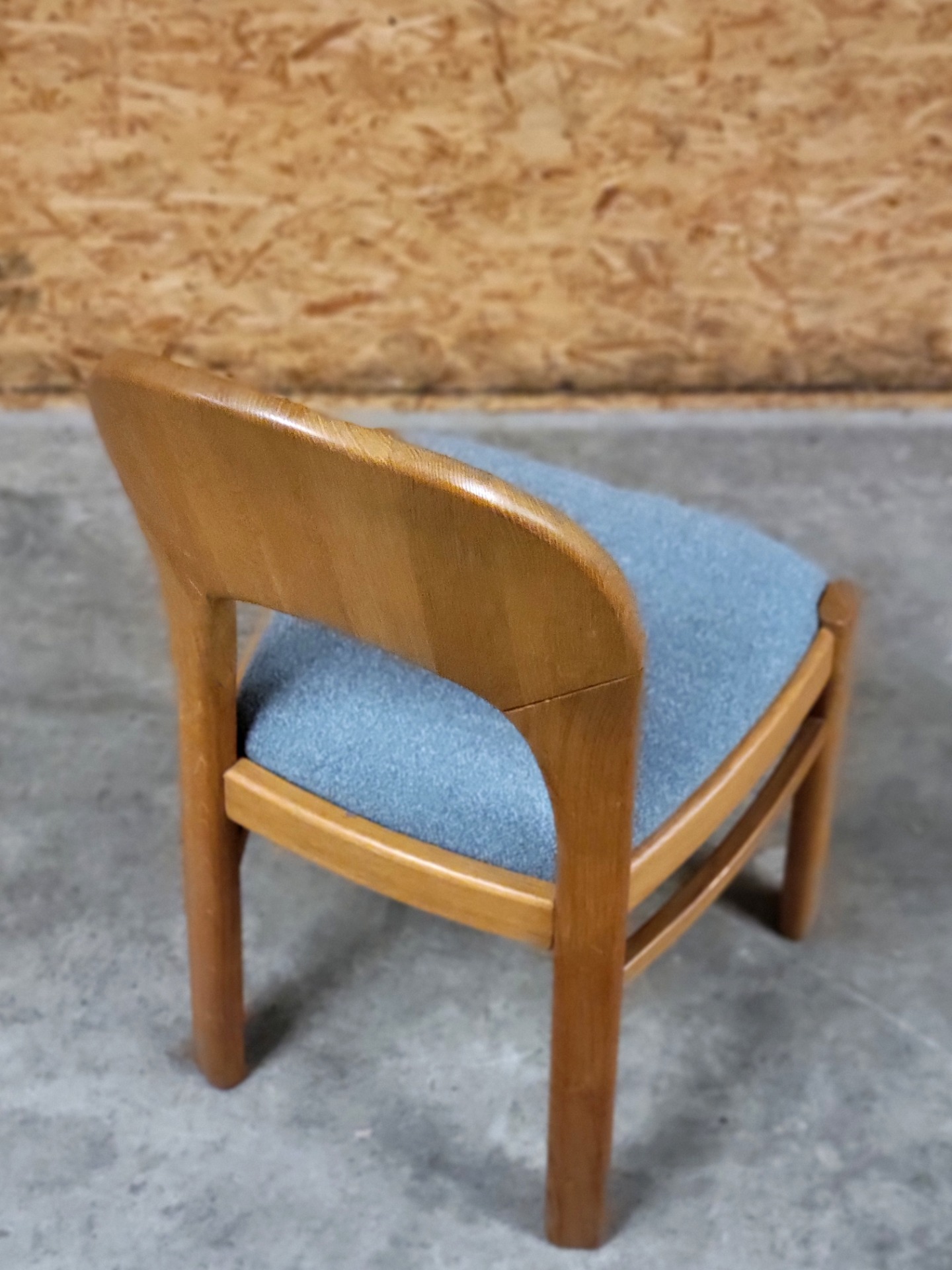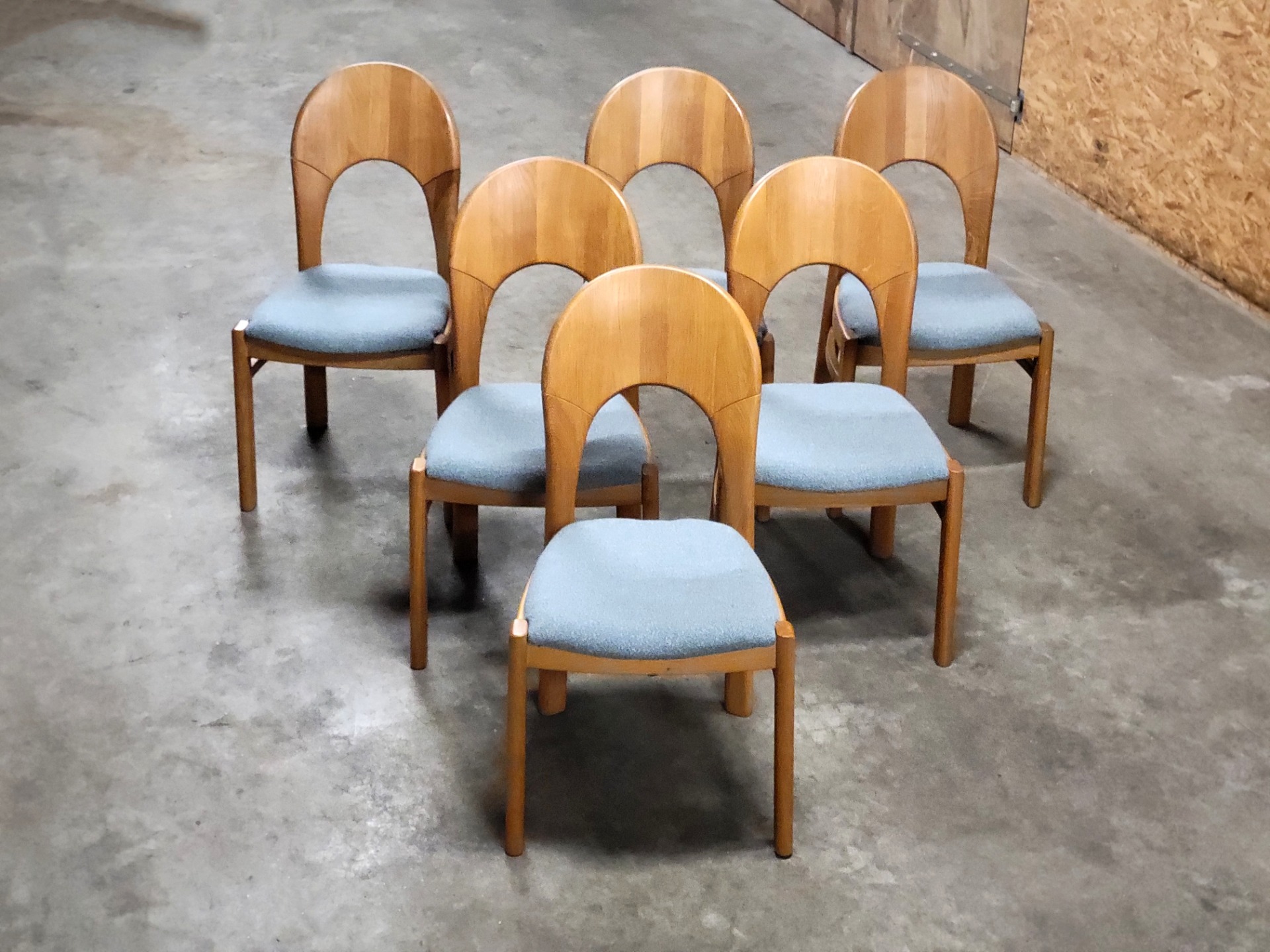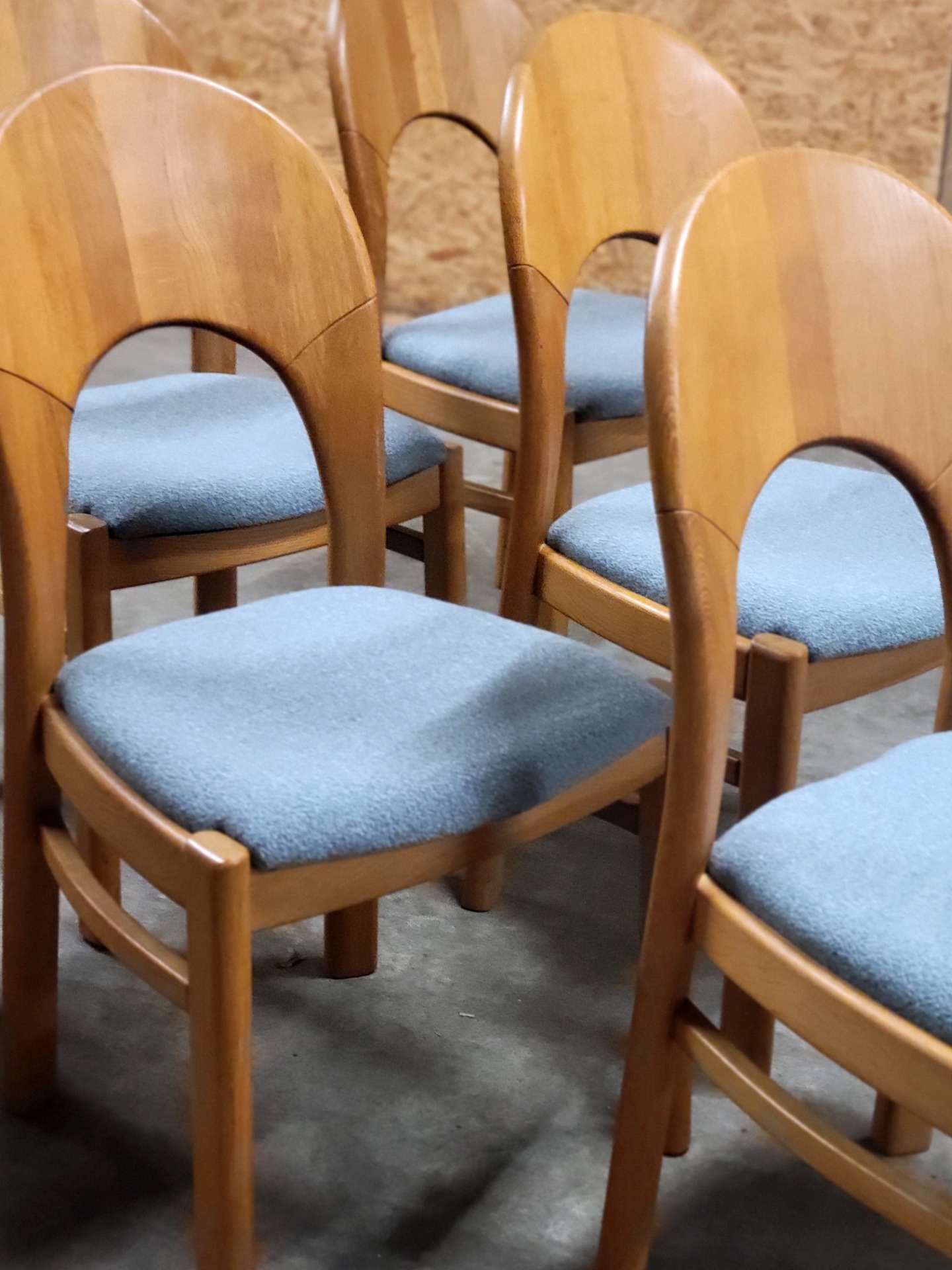Een bijzondere set van zes eetkamerstoelen uit de jaren '70 geproduceerd in Denemarken. De stoelen zijn vervaardigd uit organisch gevormd, massief eikenhout, waarbij de rugleuning de boog maakt en doorloopt in de achterpoten van de stoel. De stoelen zijn opnieuw bekleed met een hoogwaardige stoffering van Holland & Sherry, die mooi combineert bij de warme kleur van het eikenhout. Deze set kan gelijk in gebruik worden genomen in een Boho, Space Age of Memphis interieur.