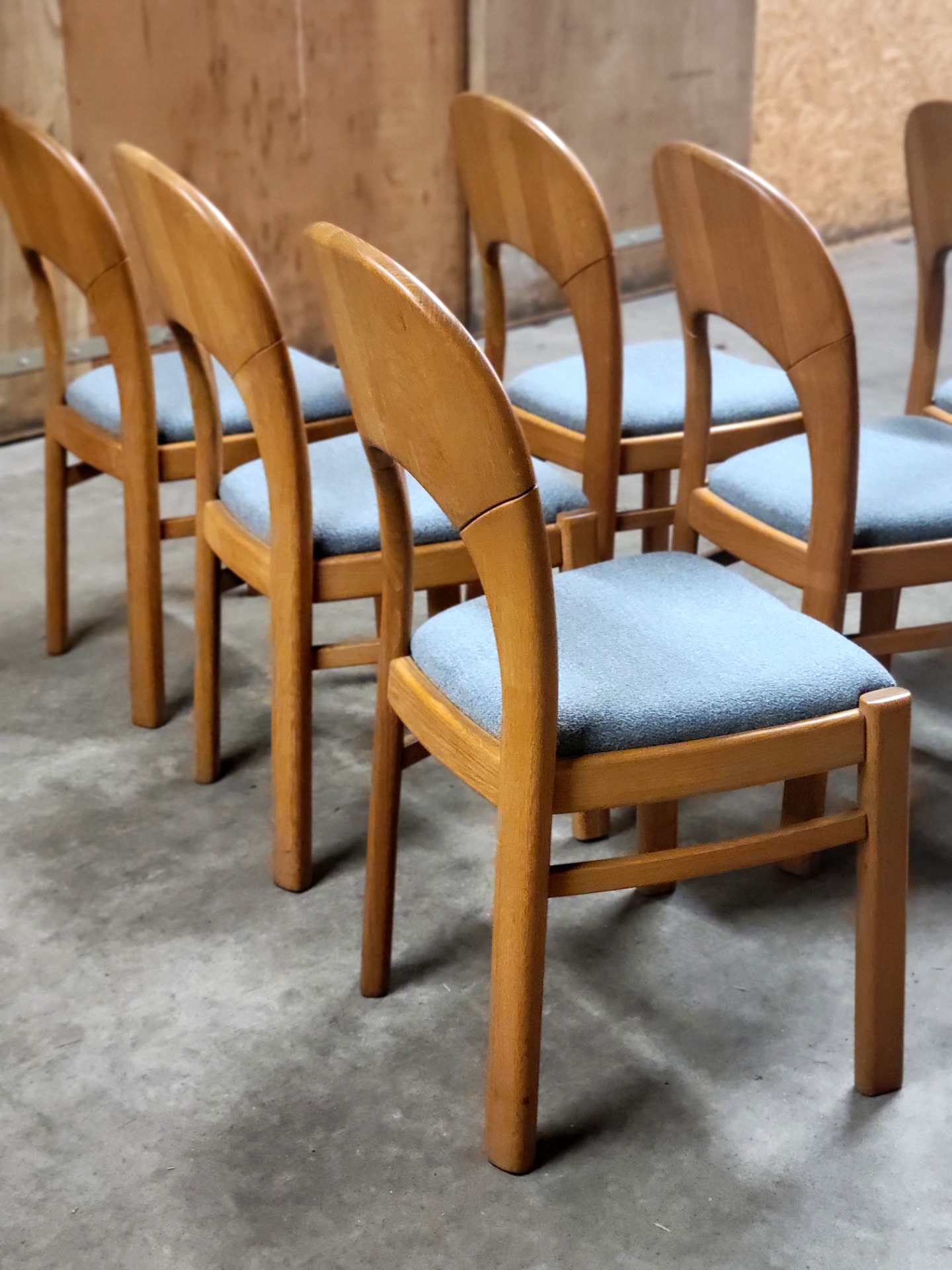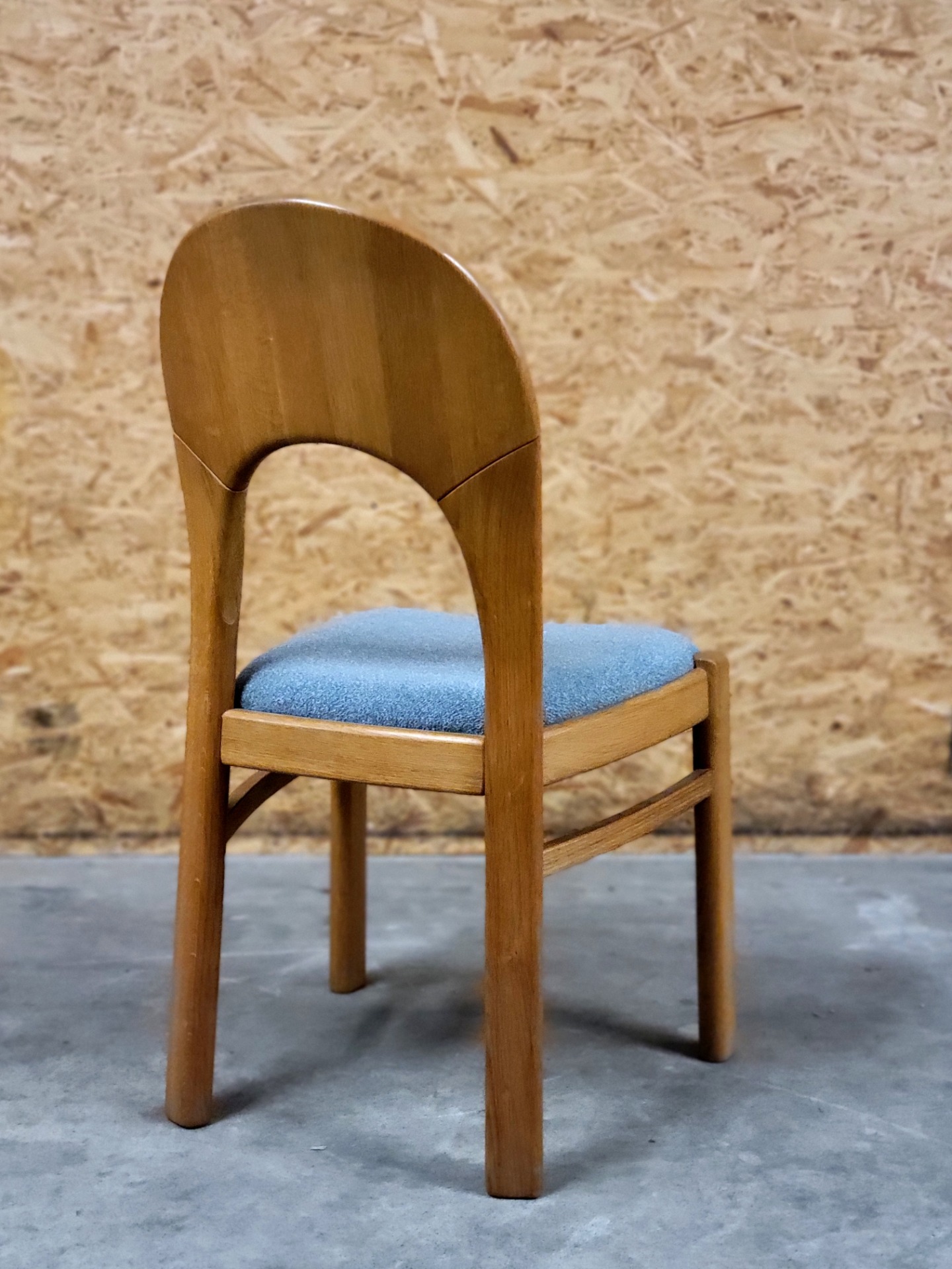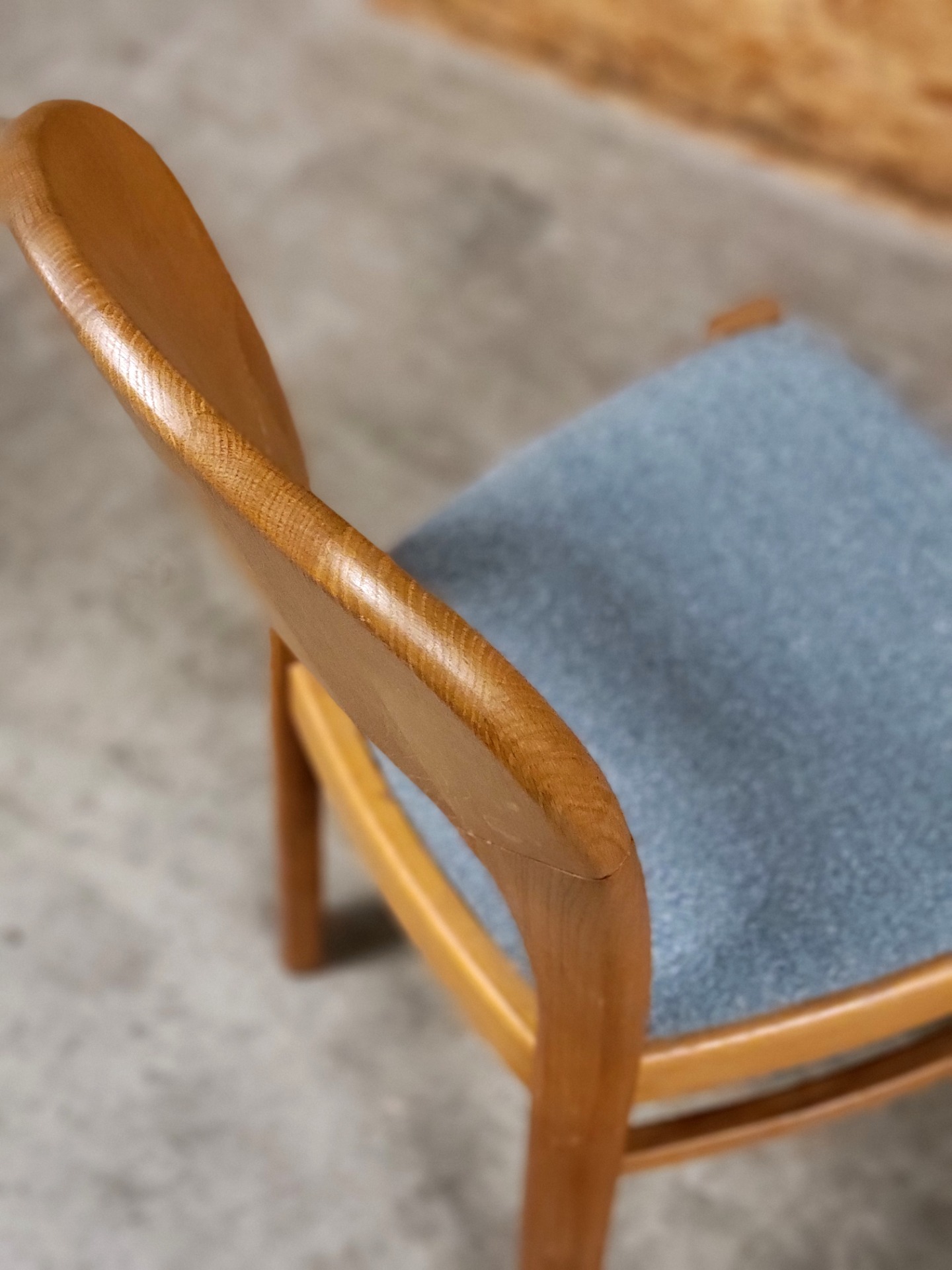 Een bijzondere set van zes eetkamerstoelen uit de jaren '70 geproduceerd in Denemarken. De stoelen zijn vervaardigd uit organisch gevormd, massief eikenhout, waarbij de rugleuning de boog maakt en doorloopt in de achterpoten van de stoel. De stoelen zijn opnieuw bekleed met een hoogwaardige stoffering van Holland & Sherry, die mooi combineert bij de warme kleur van het eikenhout. Deze set kan gelijk in gebruik worden genomen in een Boho, Space Age of Memphis interieur.