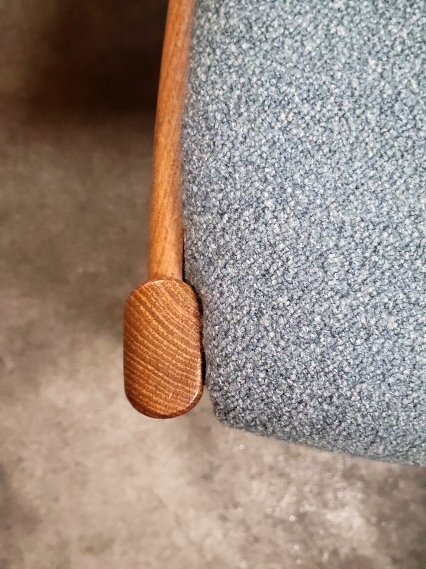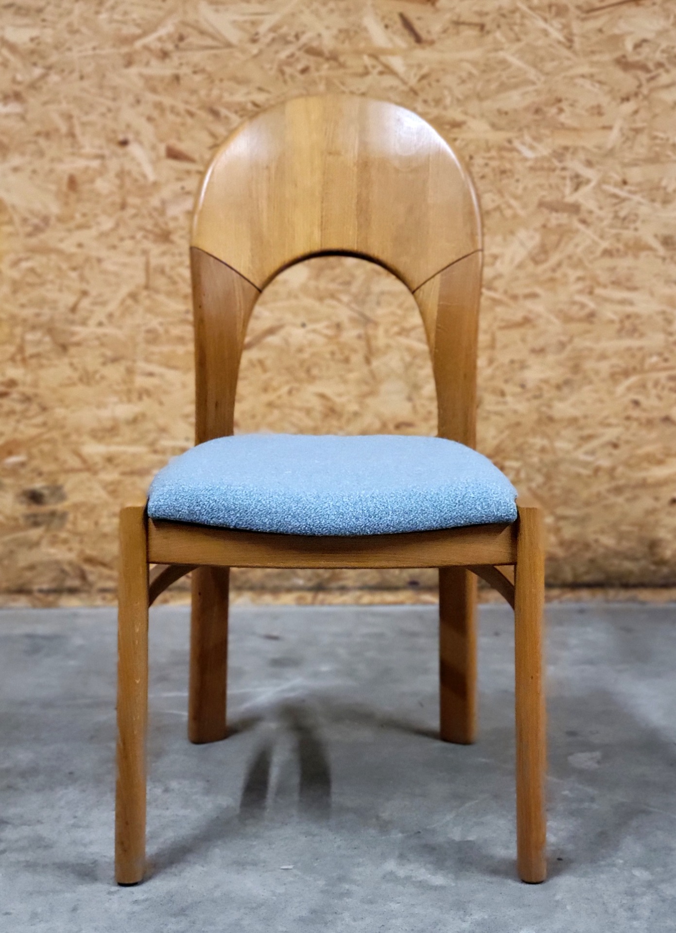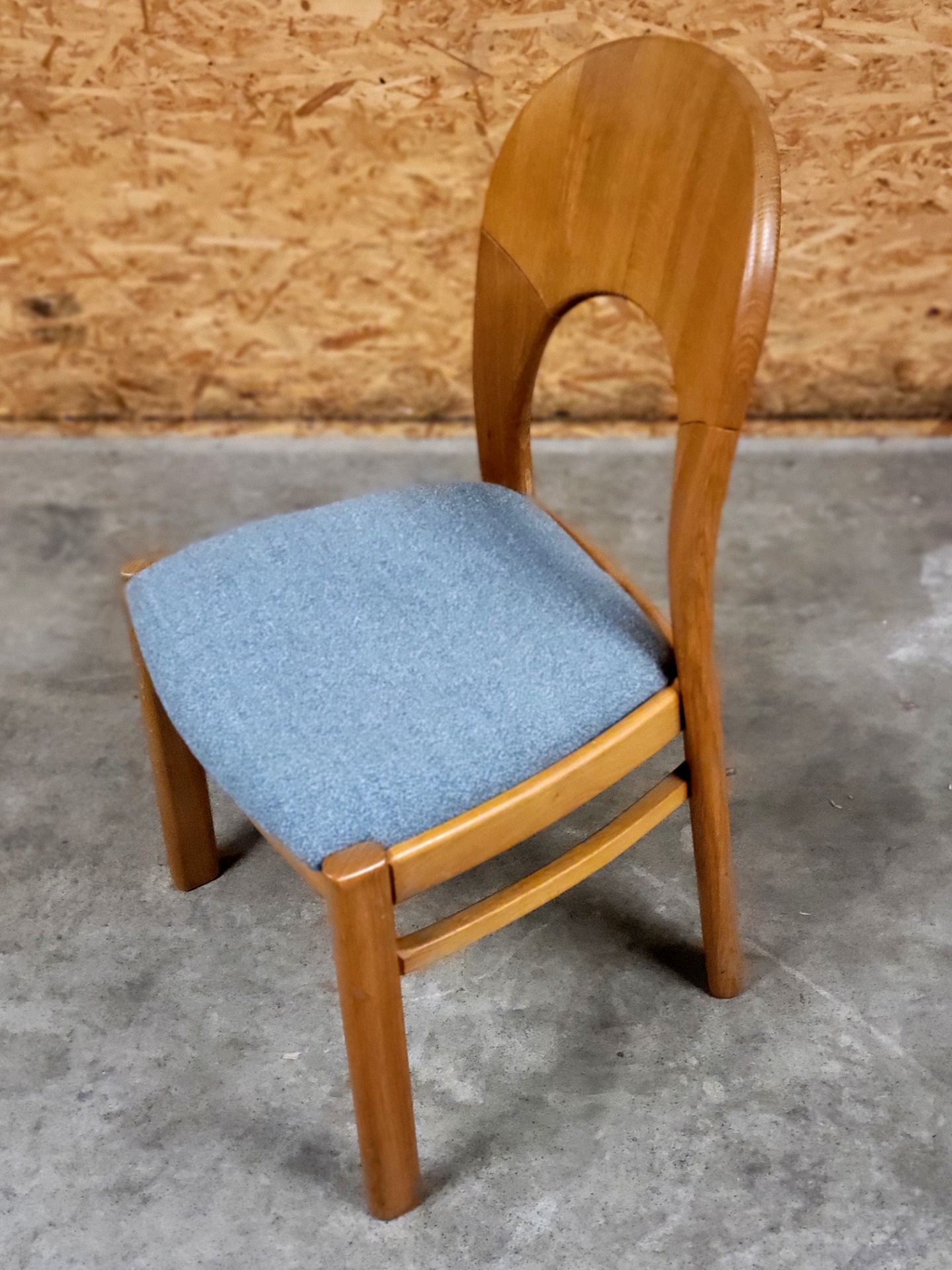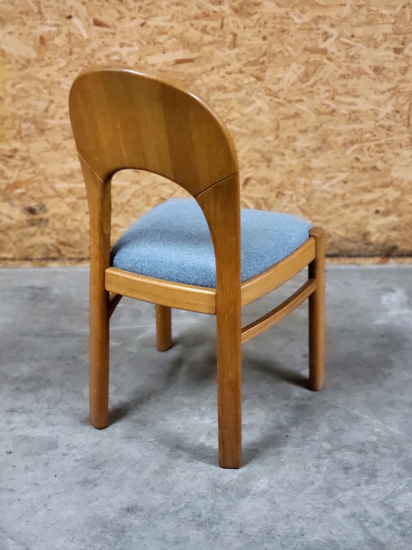 Een bijzondere set van zes eetkamerstoelen uit de jaren '70 geproduceerd in Denemarken. De stoelen zijn vervaardigd uit organisch gevormd, massief eikenhout, waarbij de rugleuning de boog maakt en doorloopt in de achterpoten van de stoel. De stoelen zijn opnieuw bekleed met een hoogwaardige stoffering van Holland & Sherry, die mooi combineert bij de warme kleur van het eikenhout. Deze set kan gelijk in gebruik worden genomen in een Boho, Space Age of Memphis interieur.