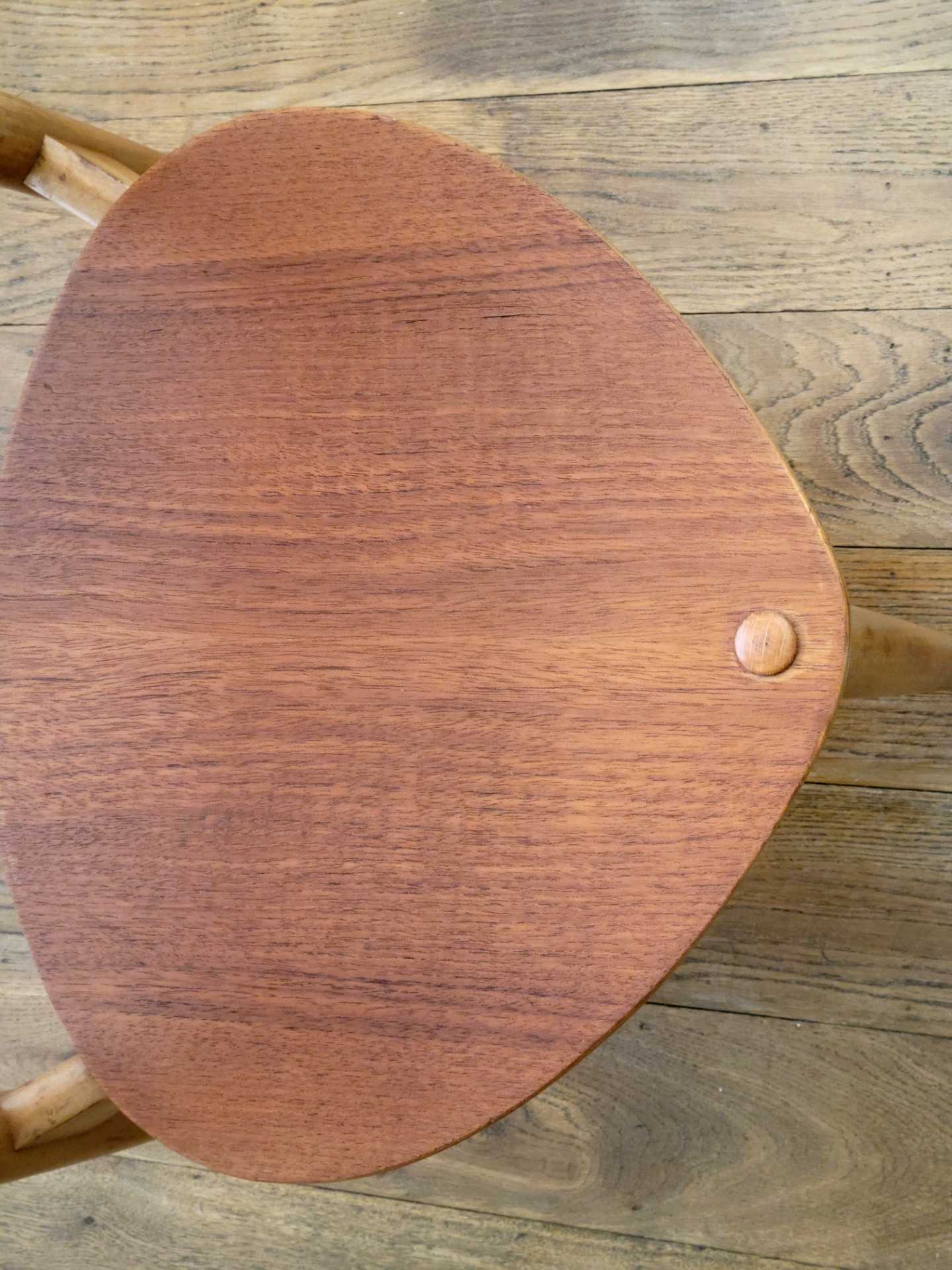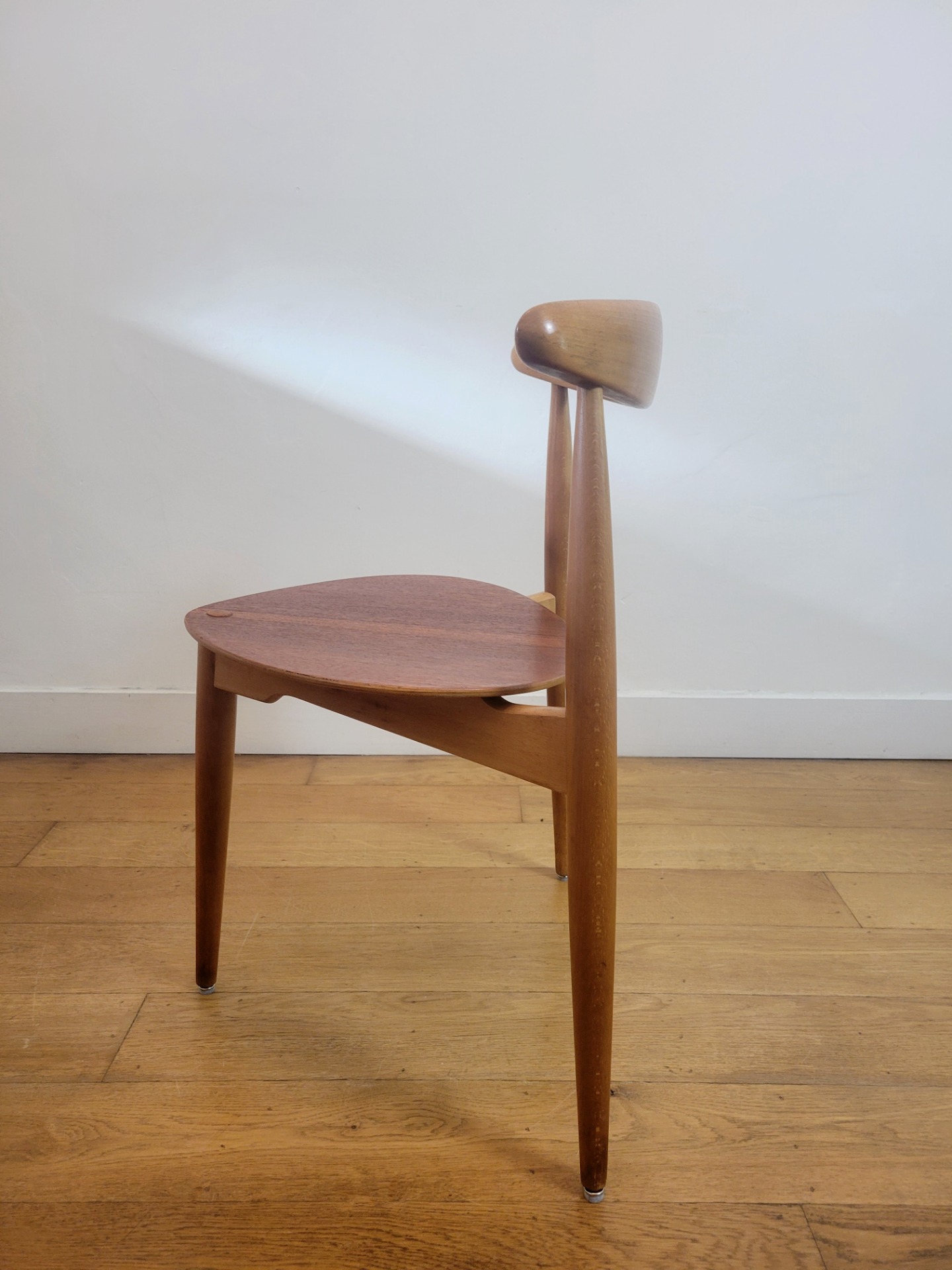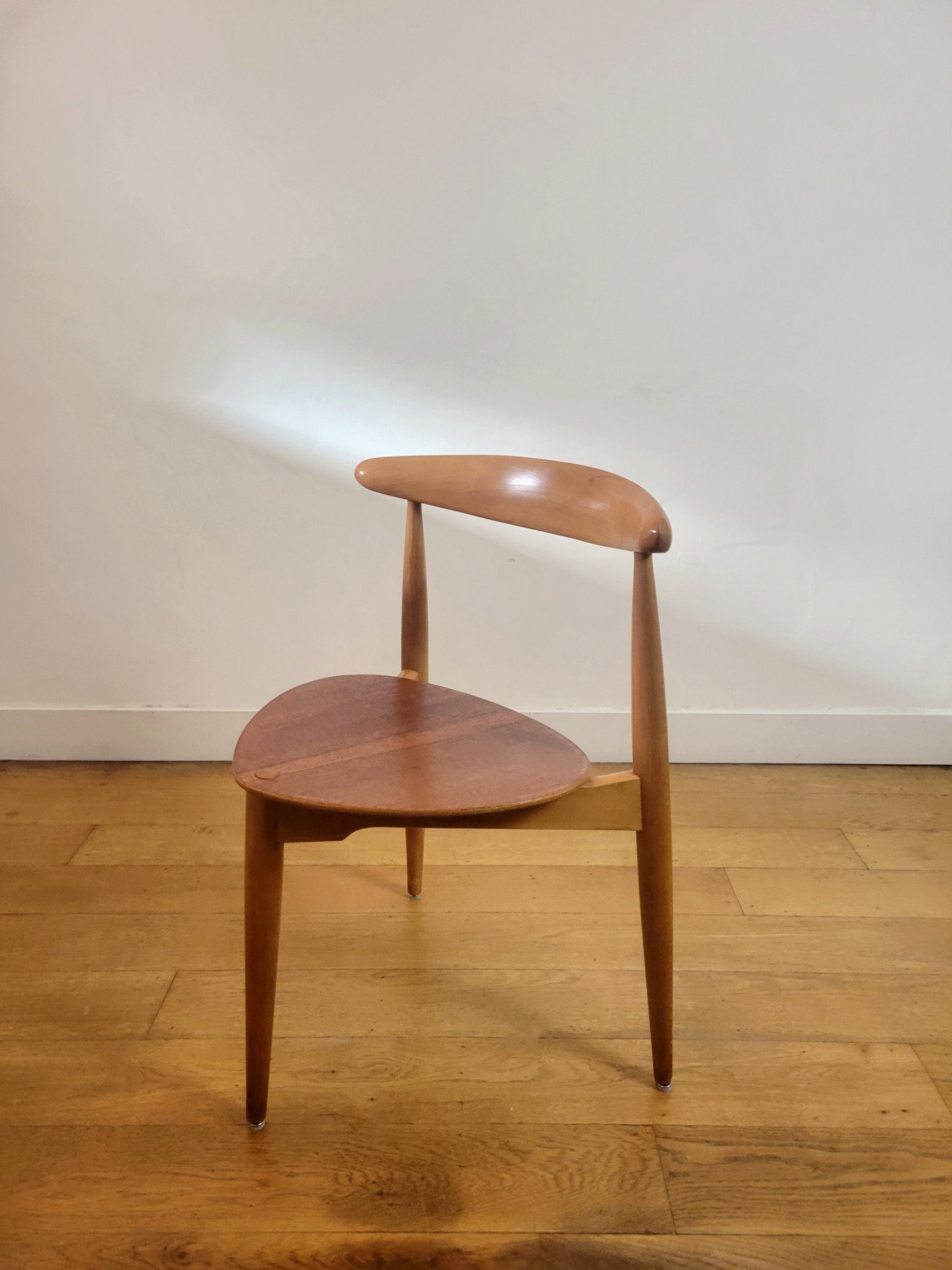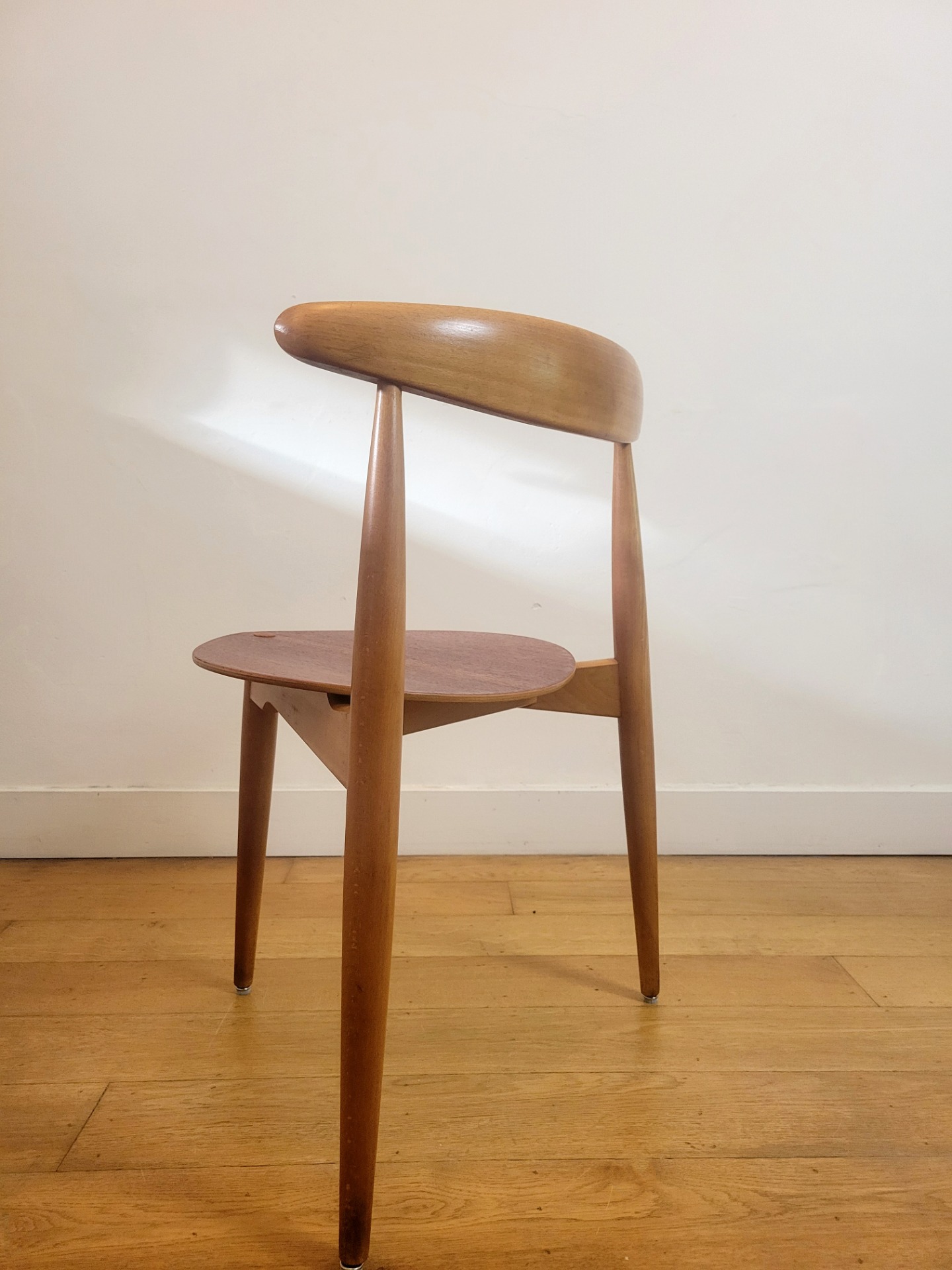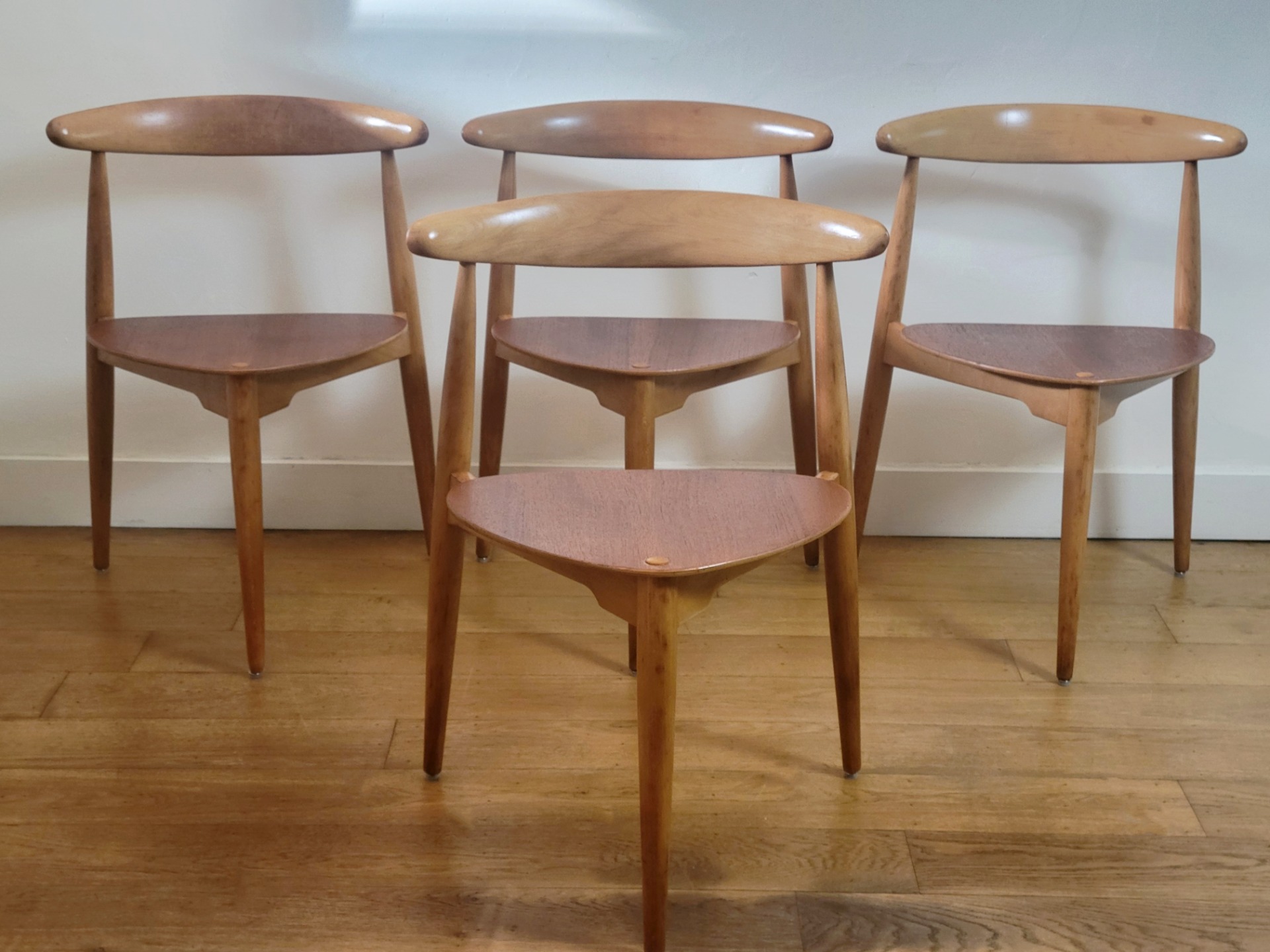 Prachtige set van vier originele "Heart Chairs" ,model FH4103, ontworpen door Hans J. Wegner en geproduceerd door Fritz Hansen in Denemarken. De stoelen hebben de kenmerkende hartvormige zitting en elegante gebogen rugleuning. Uitvoering in teak fineer zitting en een contrasterende licht kleurige beukenhouten frame. De stoelen verkeren in goede vintage staat. Constructief volledig stevig en stabiel. De zittingen zijn netjes, met normale gebruikssporen. Bij 3 van de 4 stoelen is er lichte fineerslijtage zichtbaar aan de rand van de zitting (zie detailfoto's). Dit is puur cosmetisch en doet niets af aan het gebruik of zitcomfort.