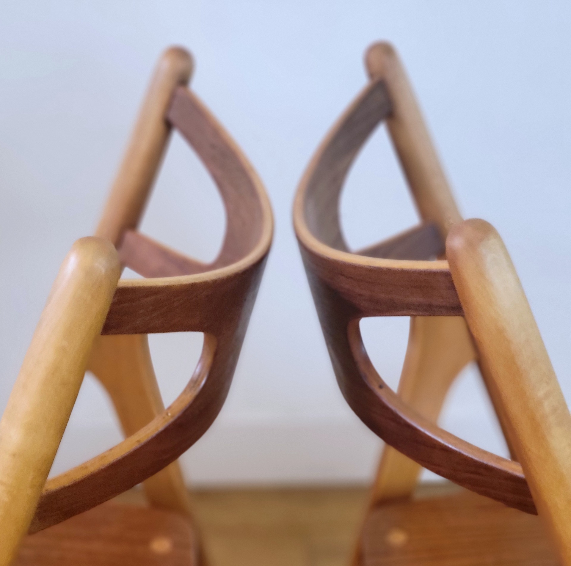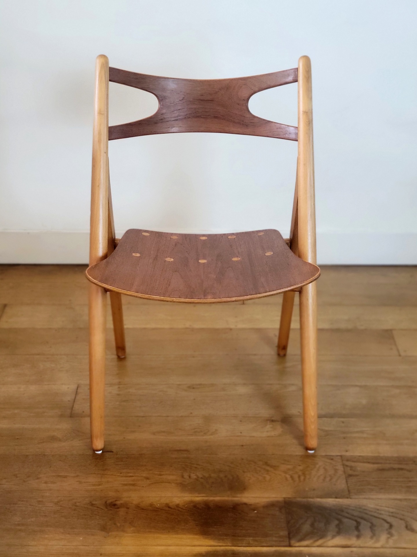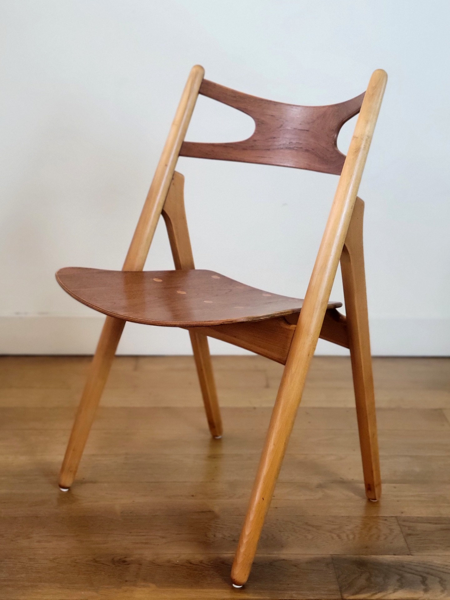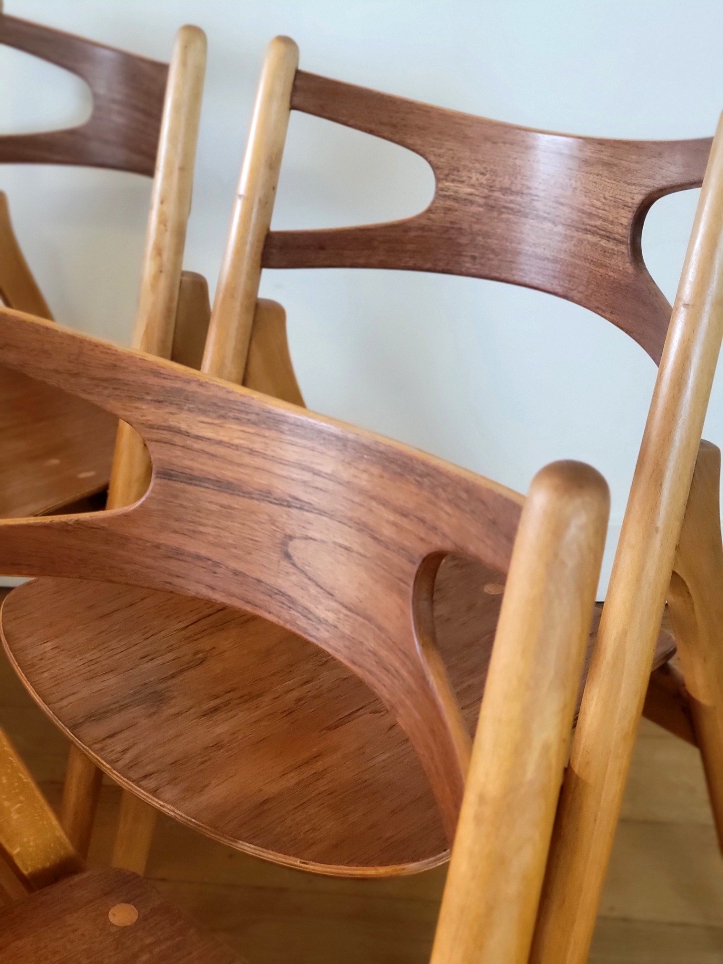 Mooie set van vijf vintage CH29 eetkamerstoel ontworpen door Hans J. Wegner en geproduceerd door Carl Hansen & Søn, Denemarken 1952. Deze designklassieker wordt ook wel "Sawbuck chair" genoemd. Zoals alle ontwerpen van Wegner is de CH29 vakkundig gemaakt en zeer comfortabel. Deze stoelen zijn uitgevoerd in beukenhouten frame en teakfineer rugleuning en zitting, Een mooie eetkamerstoel met karakter en zeer kenmerkend Scandinavische design. De stoelen verkeren in nette vintage staat met enkele sporen van gebruik.