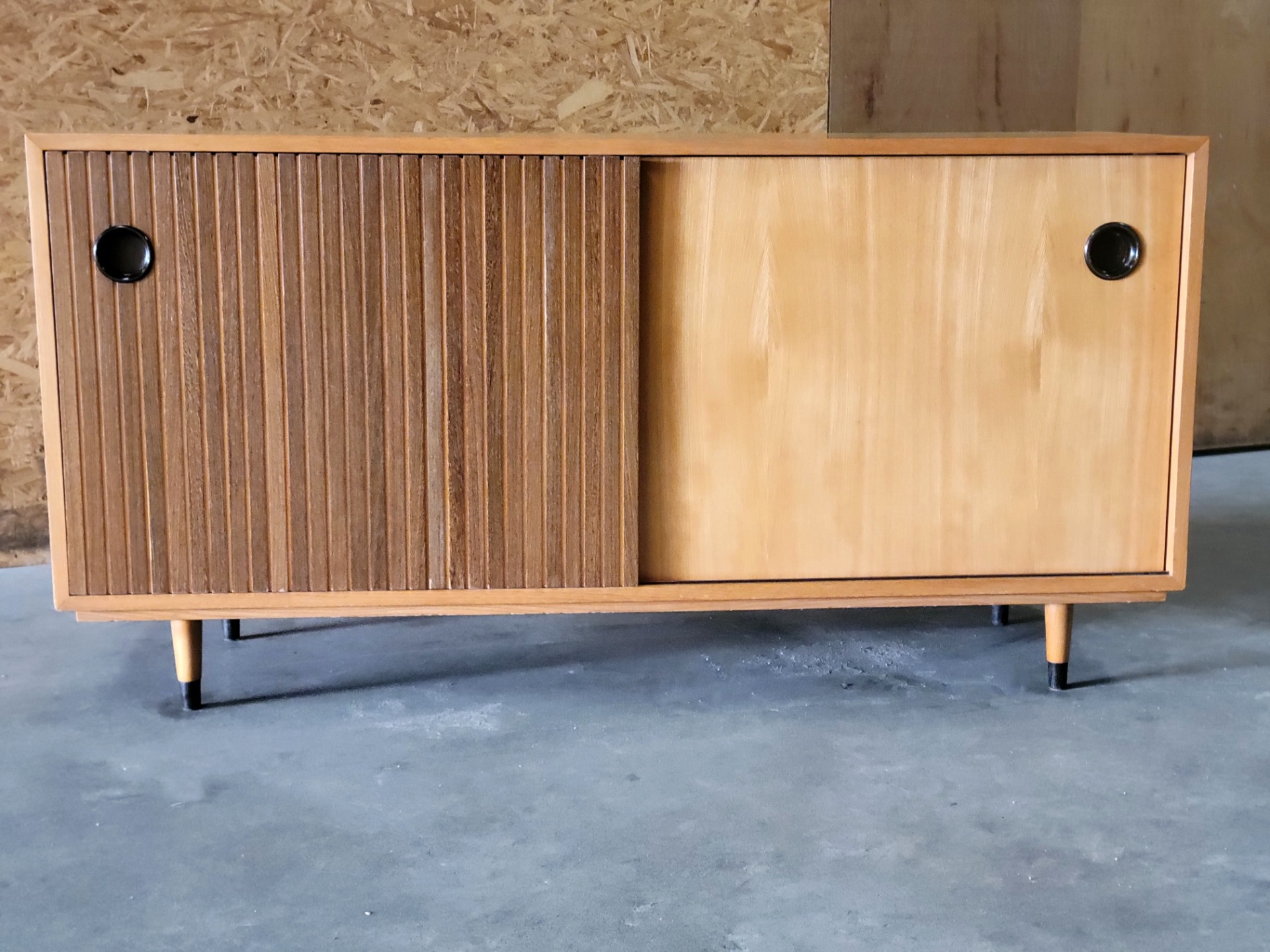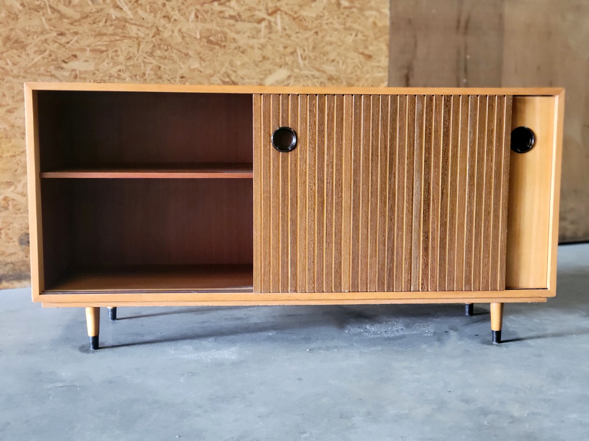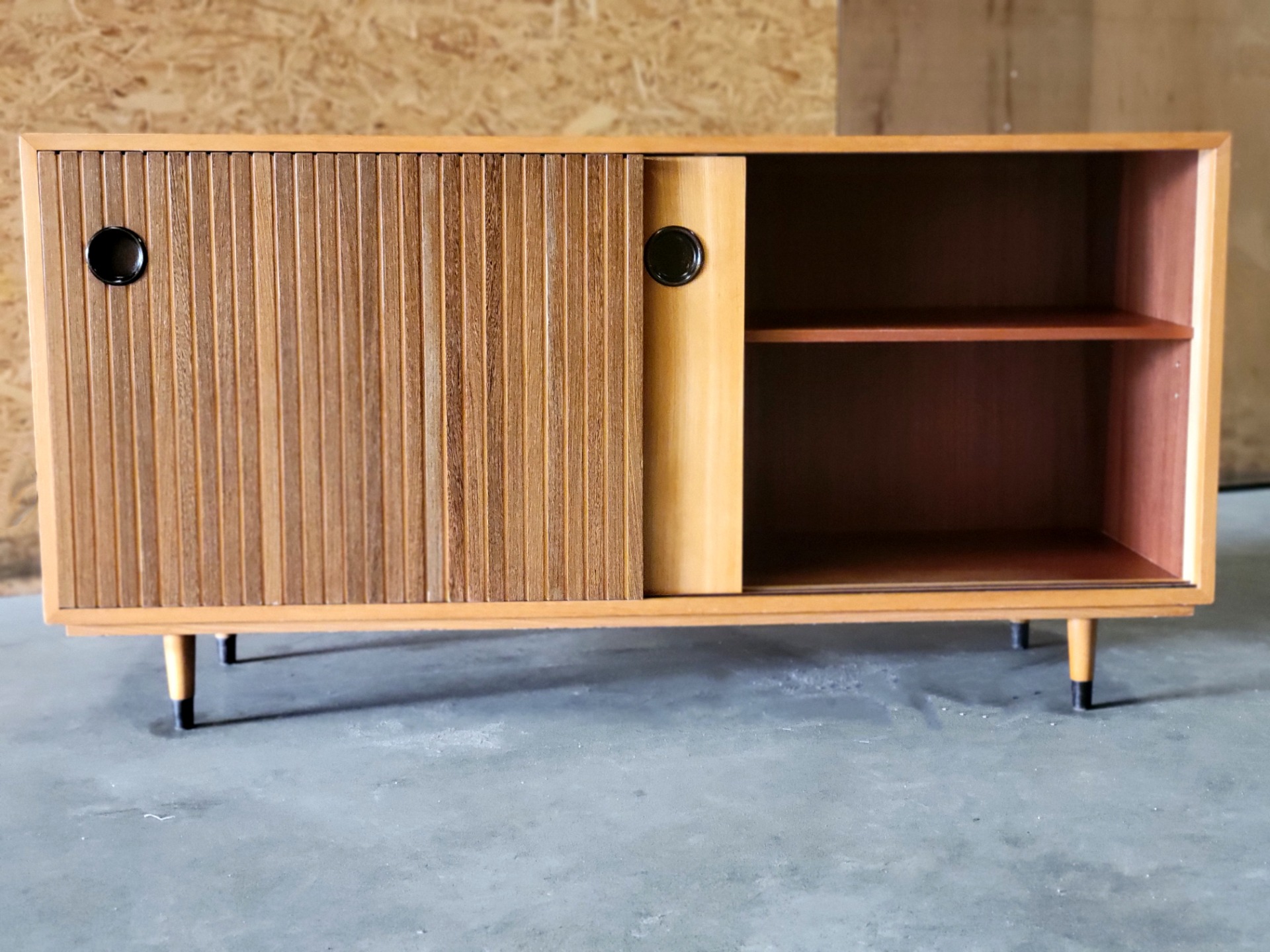 Vintage sideboard ontworpen door Erich Stratmann voor de Idee Möbel-lijn van Oldenburger Werkstätten in Duitsland in de jaren 50. Dit is een praktische meubelstuk, vervaardigd uit essenhout met een prachtige houttekening. Het heeft twee schuifdeuren en waarvan één met is voorzien van massief hardhouten latten. Het meubel heeft een hoogwaardige constructie met veel oog voor detail: de schuifdeuren zijn voorzien van een verzonken zwarte handgreep en de poten hebben eveneens aantrekkelijke zwarte accenten. Binnenin bevinden zich twee in hoogte verstelbare planken. Enkele gebruikssporen, , maar over het algemeen in zeer goede staat.