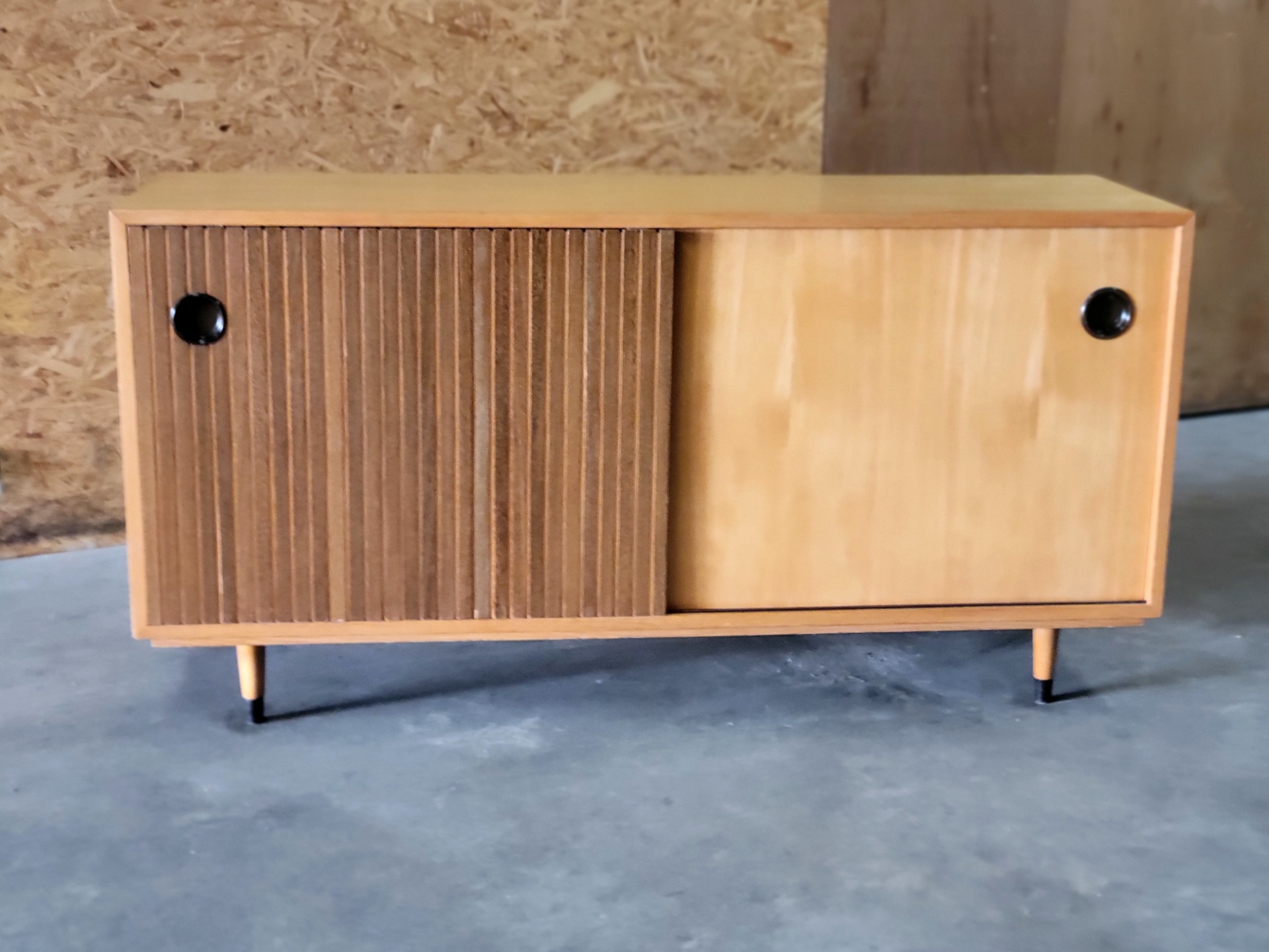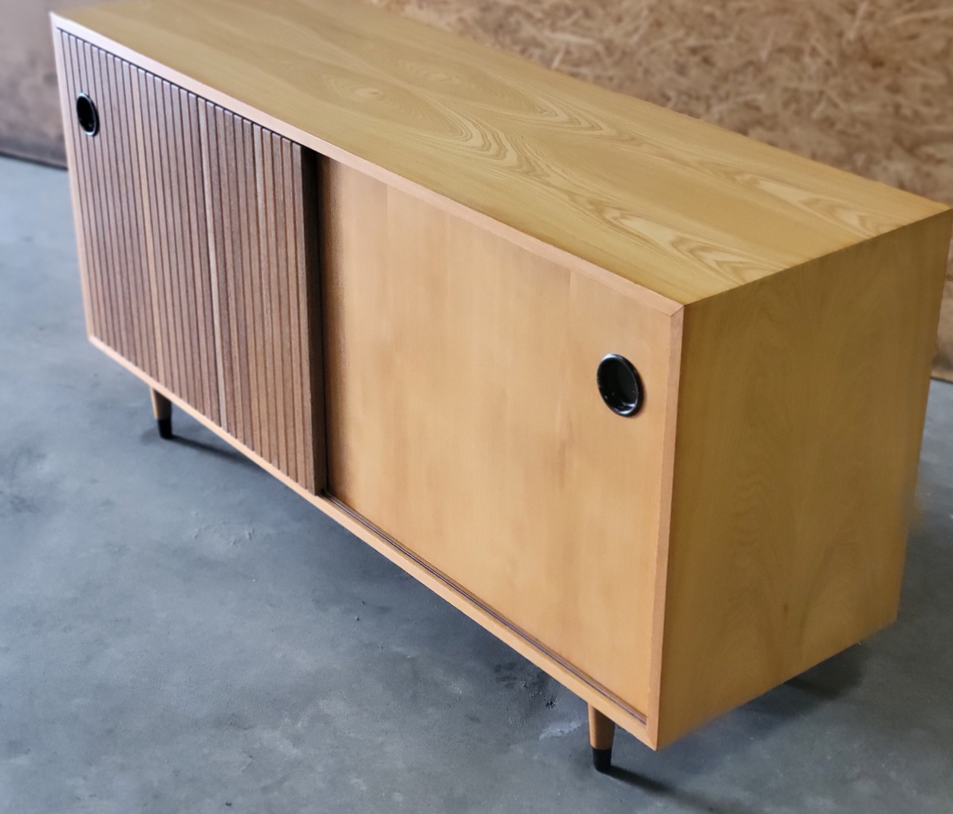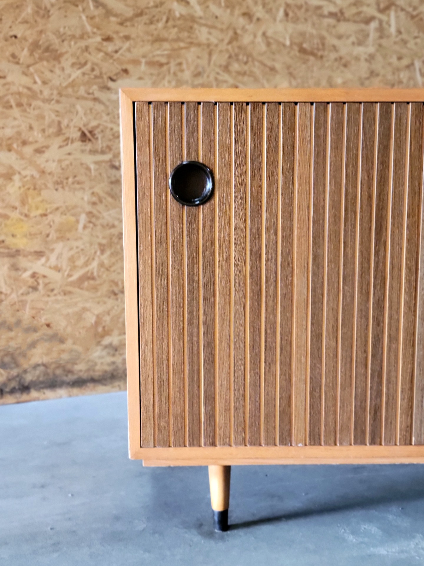 Vintage sideboard ontworpen door Erich Stratmann voor de Idee Möbel-lijn van Oldenburger Werkstätten in Duitsland in de jaren 50. Dit is een praktische meubelstuk, vervaardigd uit essenhout met een prachtige houttekening. Het heeft twee schuifdeuren en waarvan één met is voorzien van massief hardhouten latten. Het meubel heeft een hoogwaardige constructie met veel oog voor detail: de schuifdeuren zijn voorzien van een verzonken zwarte handgreep en de poten hebben eveneens aantrekkelijke zwarte accenten. Binnenin bevinden zich twee in hoogte verstelbare planken. Enkele gebruikssporen, , maar over het algemeen in zeer goede staat.