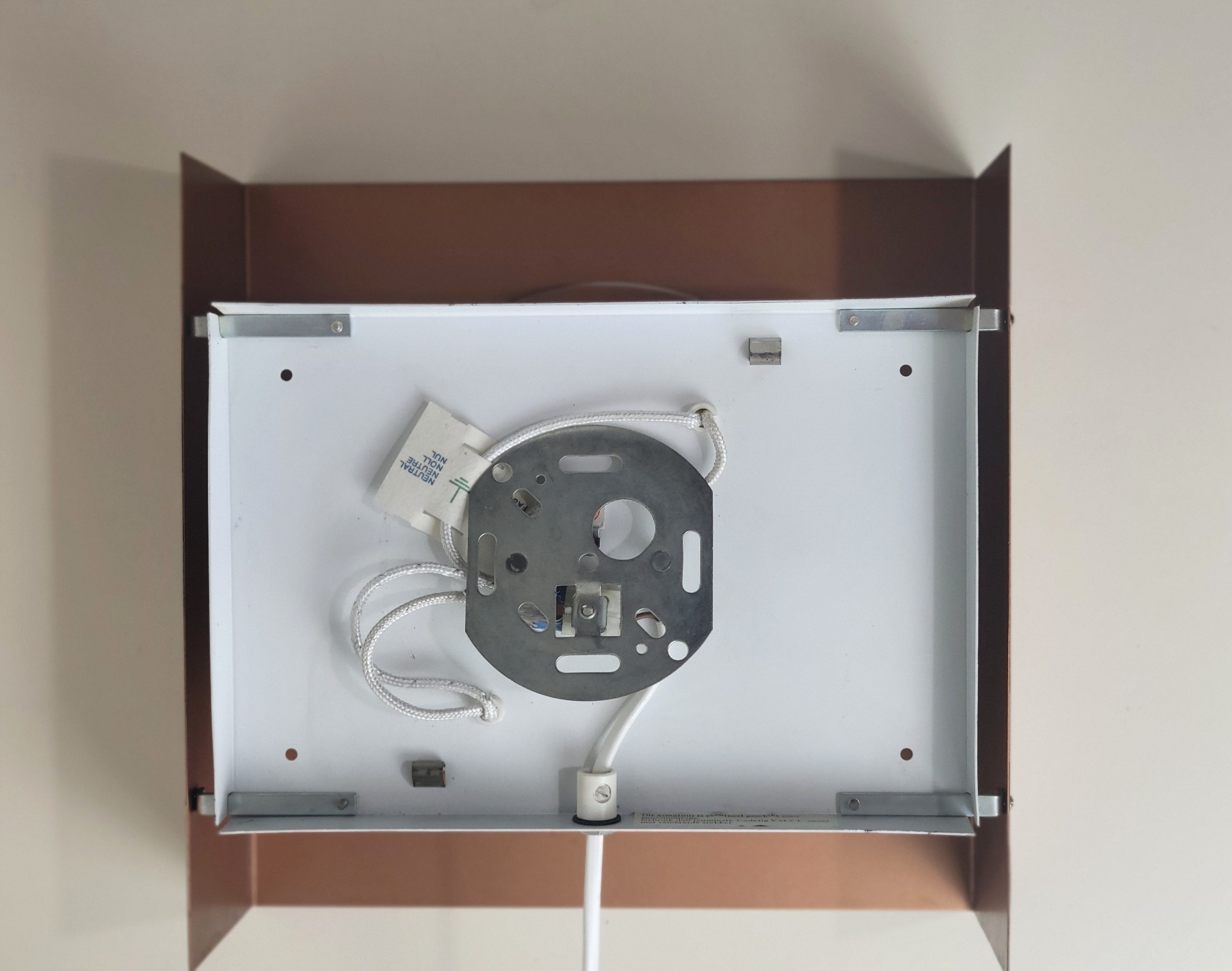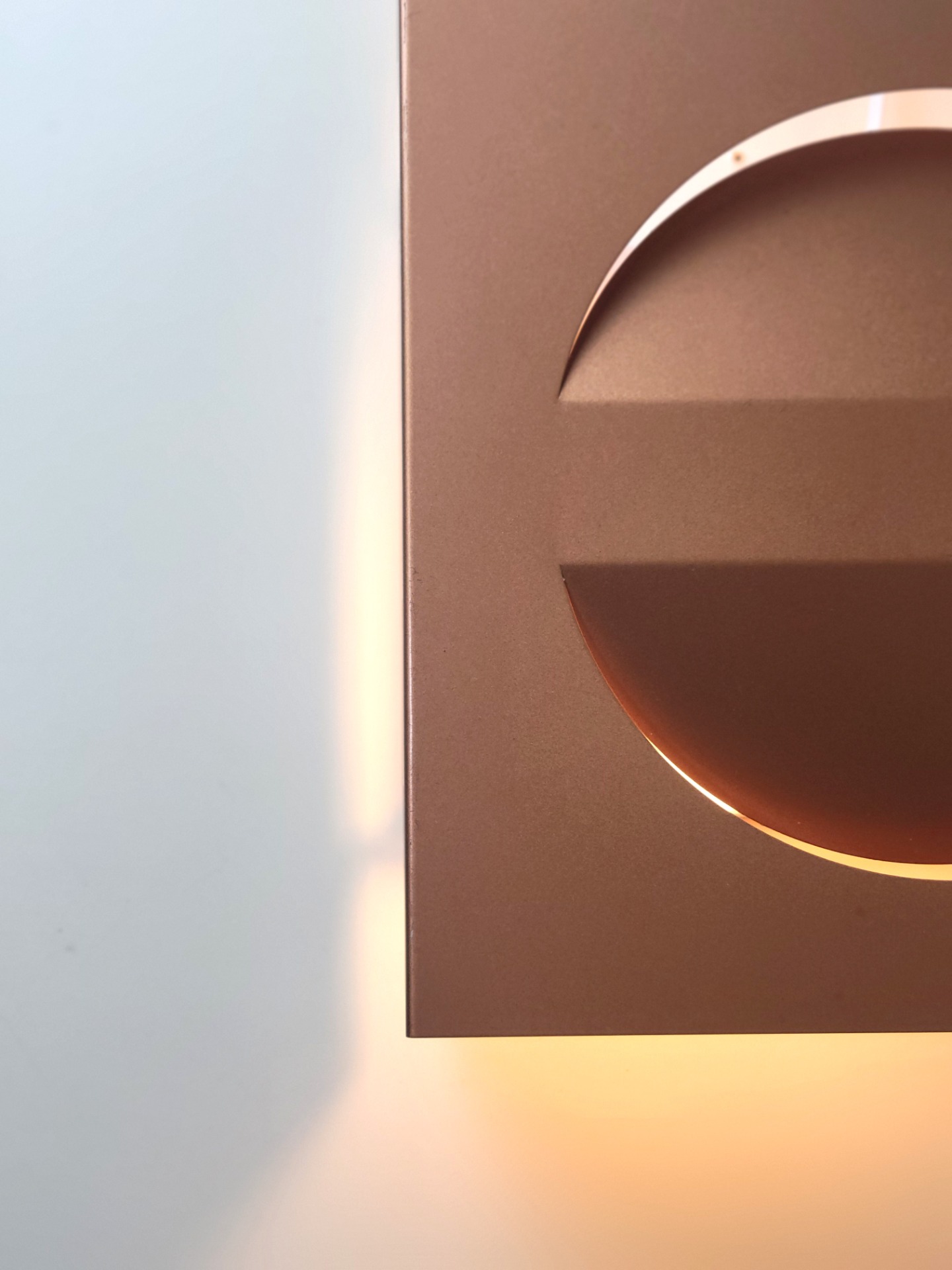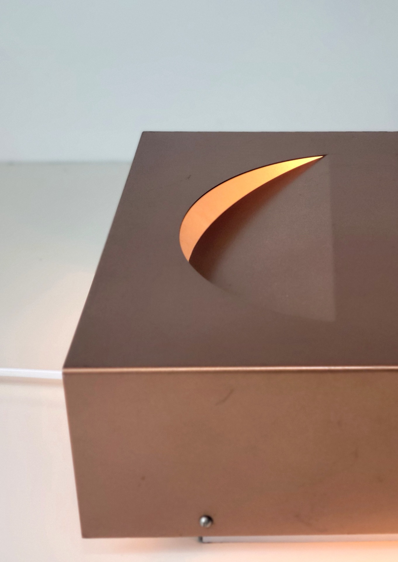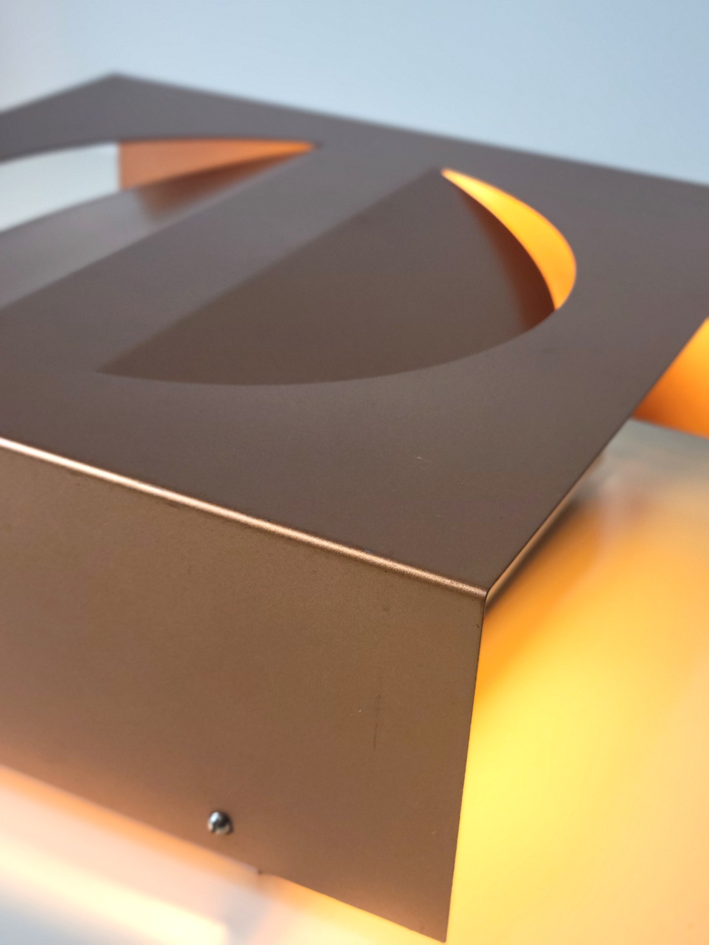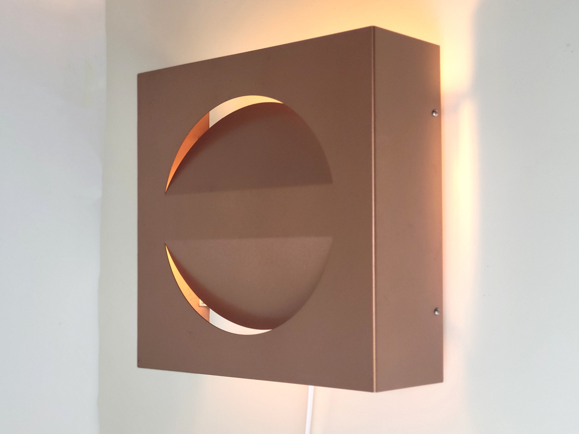 Wandlamp, model C-1603, ook bekend als 'Signaal' van Raak Amsterdam, is voorzien van twee lampen en werd in de jaren 70 ontworpen door het Raak Design Team. Deze vintage wandlamp heeft een opvallend kabbalistisch symbolisch ontwerp, vervaardigd uit licht metaal en gevormd tot een primair symbool van licht. Het koperkleurig gecoate metaal creëert een uniek lichteffect, versterkt door de open kap. De lamp verkeert in nette vintage staat, met normale gebruikssporen en ouderdomsverschijnselen die alleen maar bijdragen aan de charme.