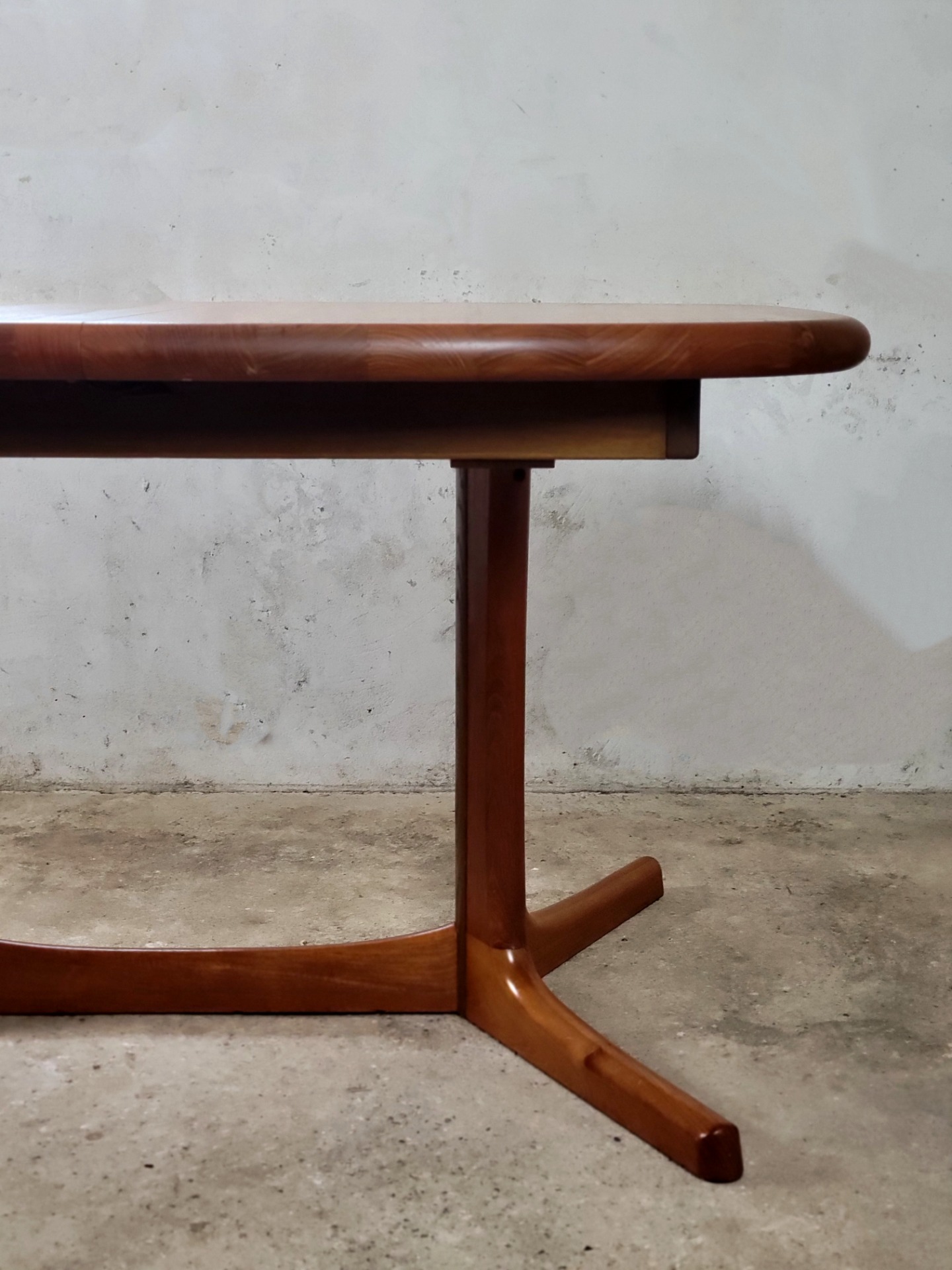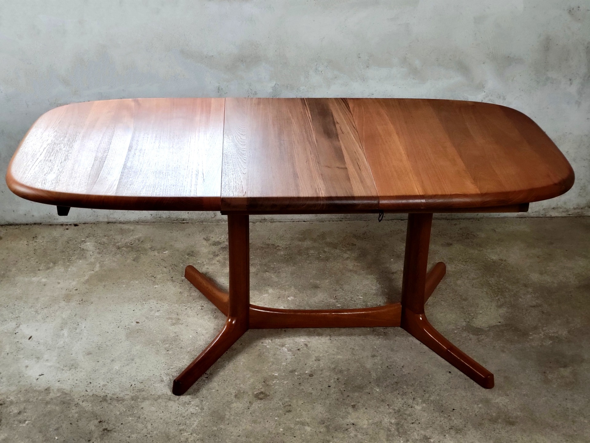 Een tijdloos ontwerp van Dyrlund, Denemarken 1960. Uitgevoerd in massief teakhout is deze tafel een voorbeeld van Deens vakmanschap. De tafel heeft fraaie zichtbare verbindingen. Het afgeronde blad en tussenblad is 4,5 cm dik en in zeer goede staat. De tafel verkeert in zeer goede staat met minimale sporen van gebruik.