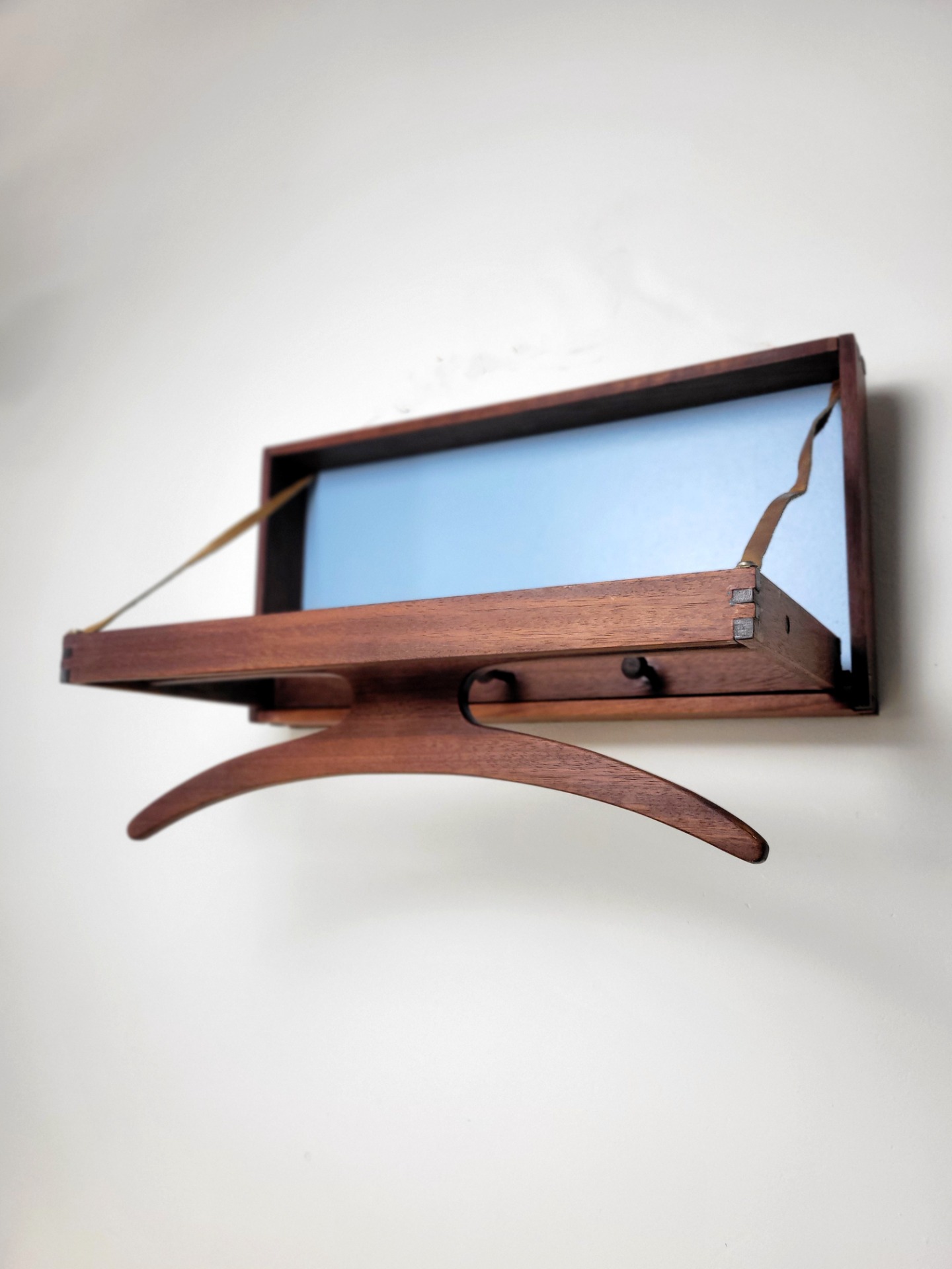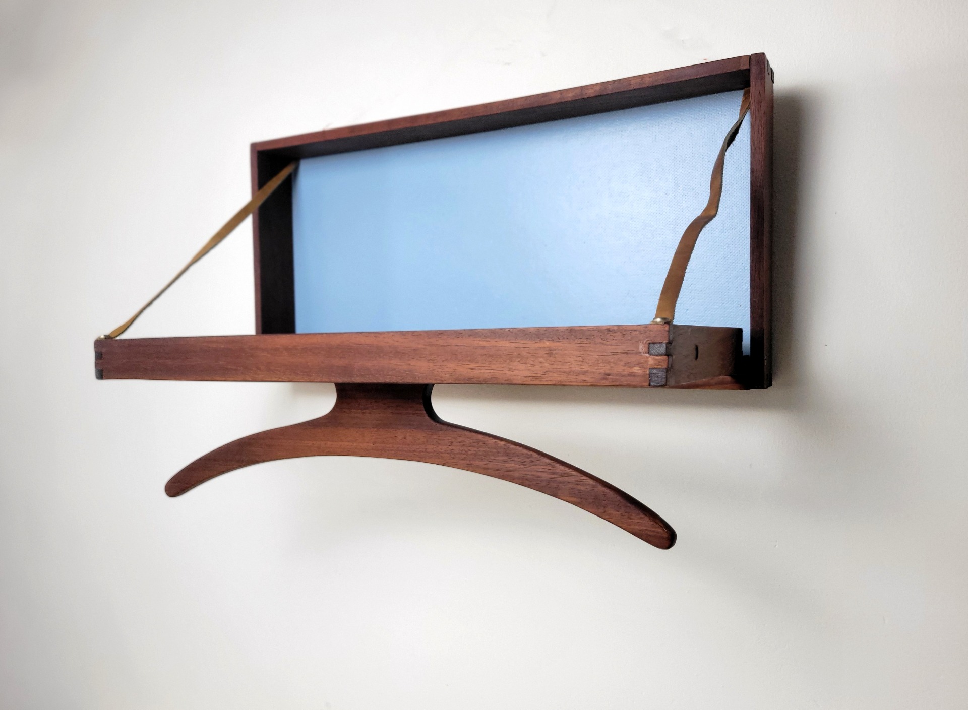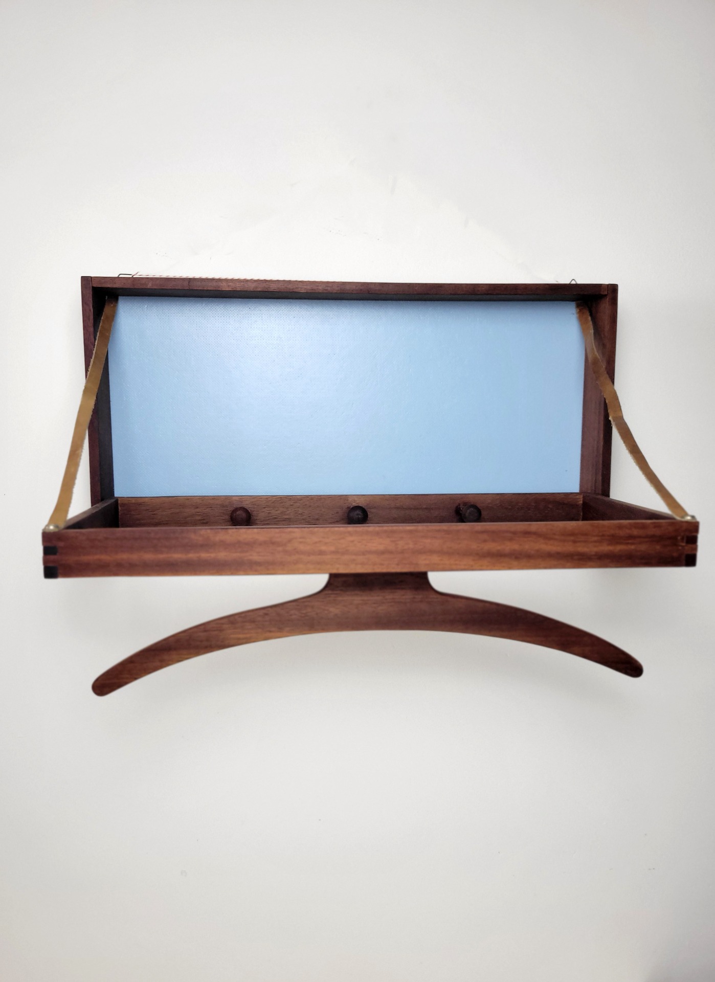 Bijzonder fraai vormgegeven inklapbare wandkapstok ontworpen door Adam Hoff & Poul Østergaard voor Virum Møbelsnedkeri, Denemarken 1950s. Het rek is gemaakt van massief teakhout de licht blauwgrijze achterzijde is ooit vervangen. De uitvouwbare kledinghanger hangt aan twee leren riempjes. De kapstok verkeert in nette vintage staat en functioneert naar behoren. Eén zijpaneel heeft bij de verbinding een barst in het hout.