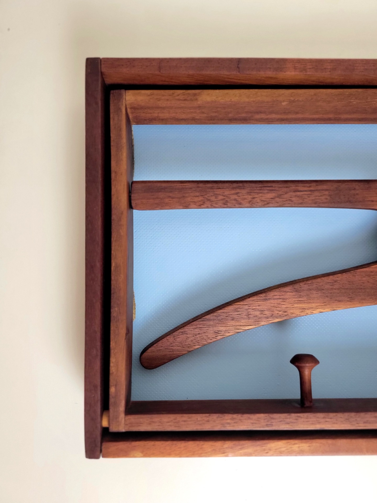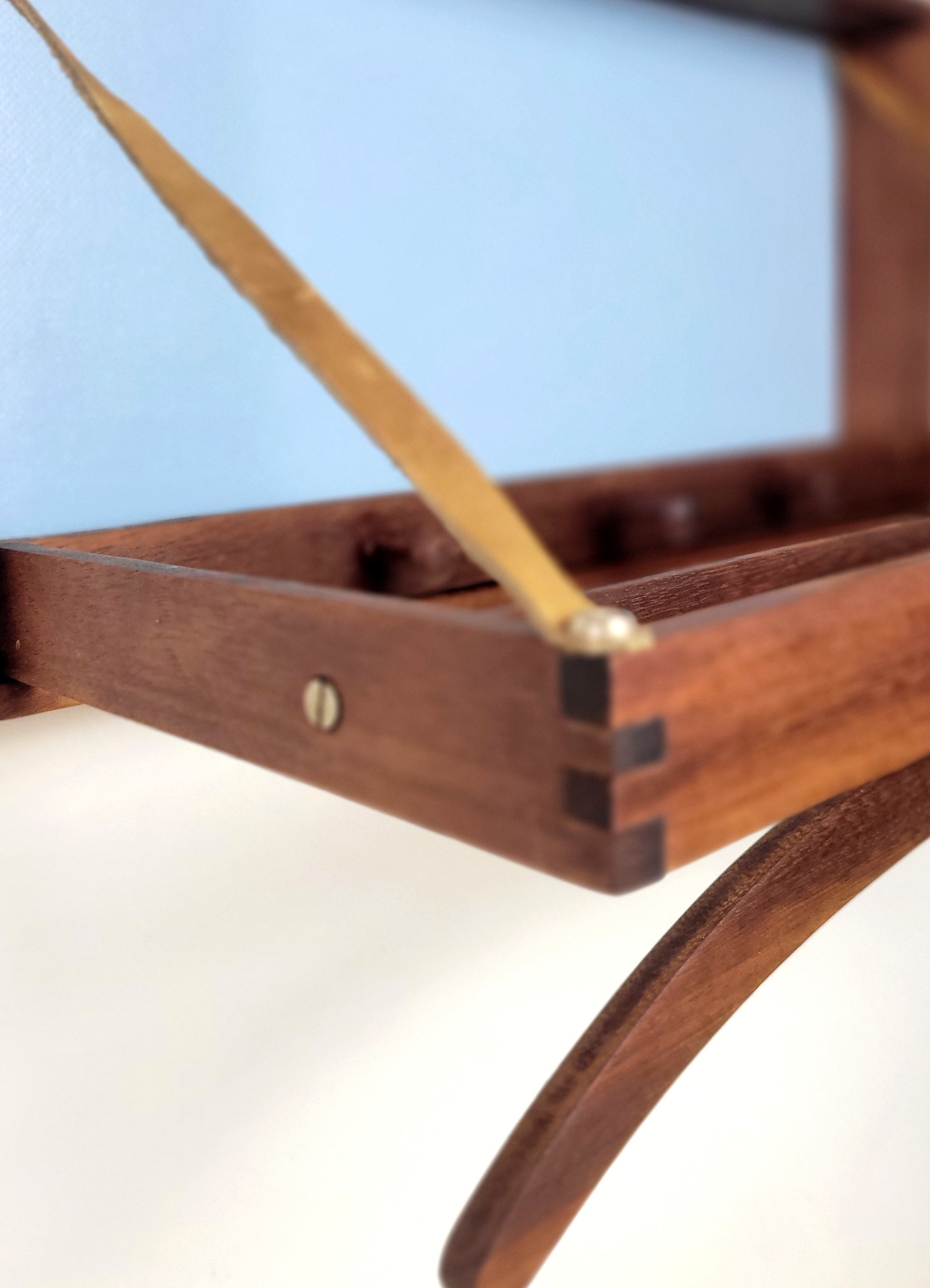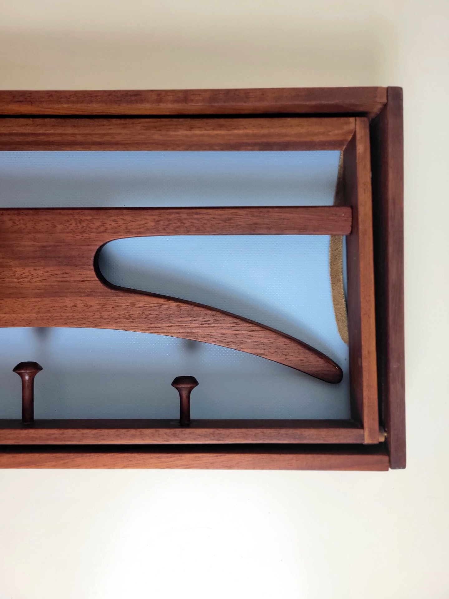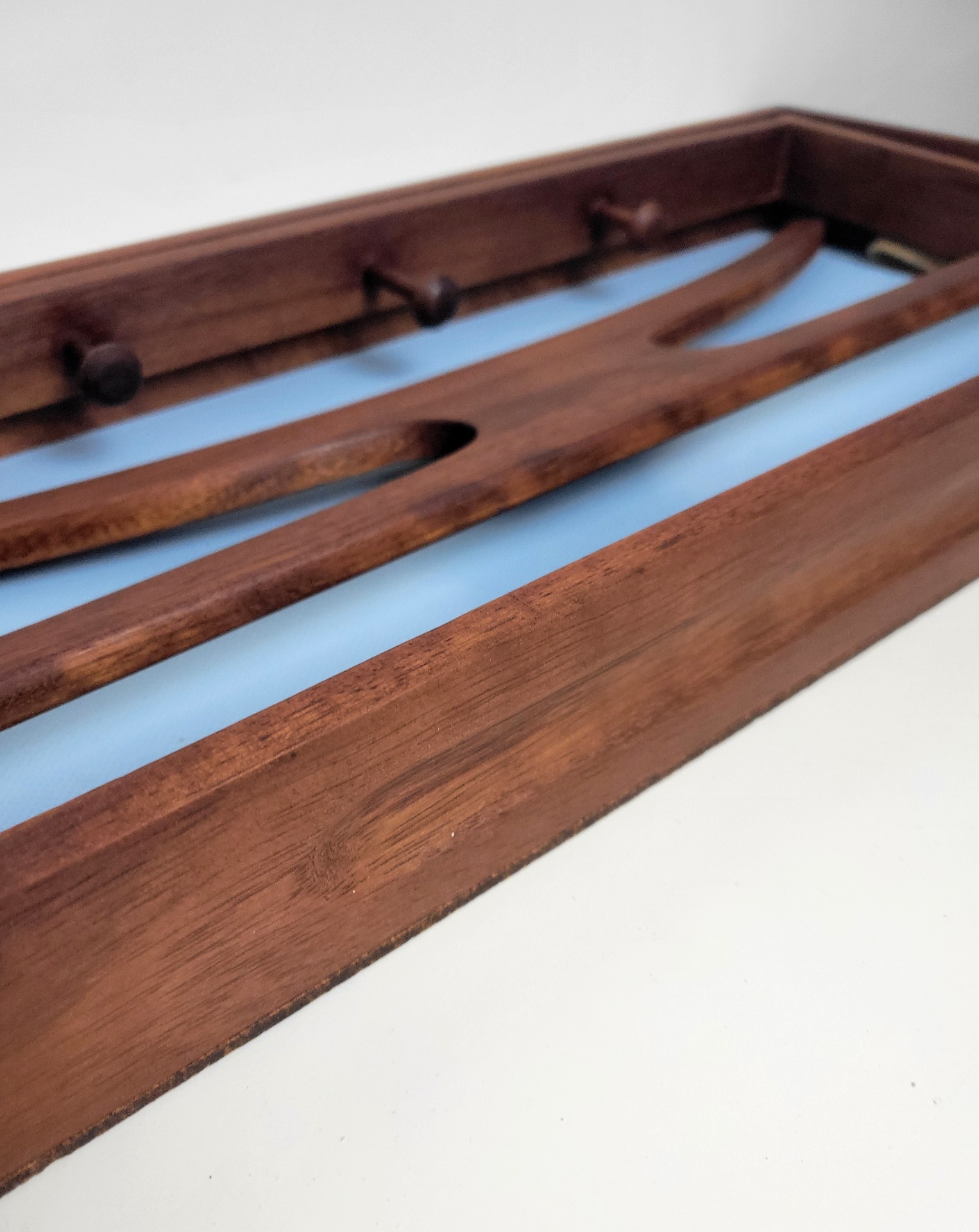 Bijzonder fraai vormgegeven inklapbare wandkapstok ontworpen door Adam Hoff & Poul Østergaard voor Virum Møbelsnedkeri, Denemarken 1950s. Het rek is gemaakt van massief teakhout de licht blauwgrijze achterzijde is ooit vervangen. De uitvouwbare kledinghanger hangt aan twee leren riempjes. De kapstok verkeert in nette vintage staat en functioneert naar behoren. Eén zijpaneel heeft bij de verbinding een barst in het hout.