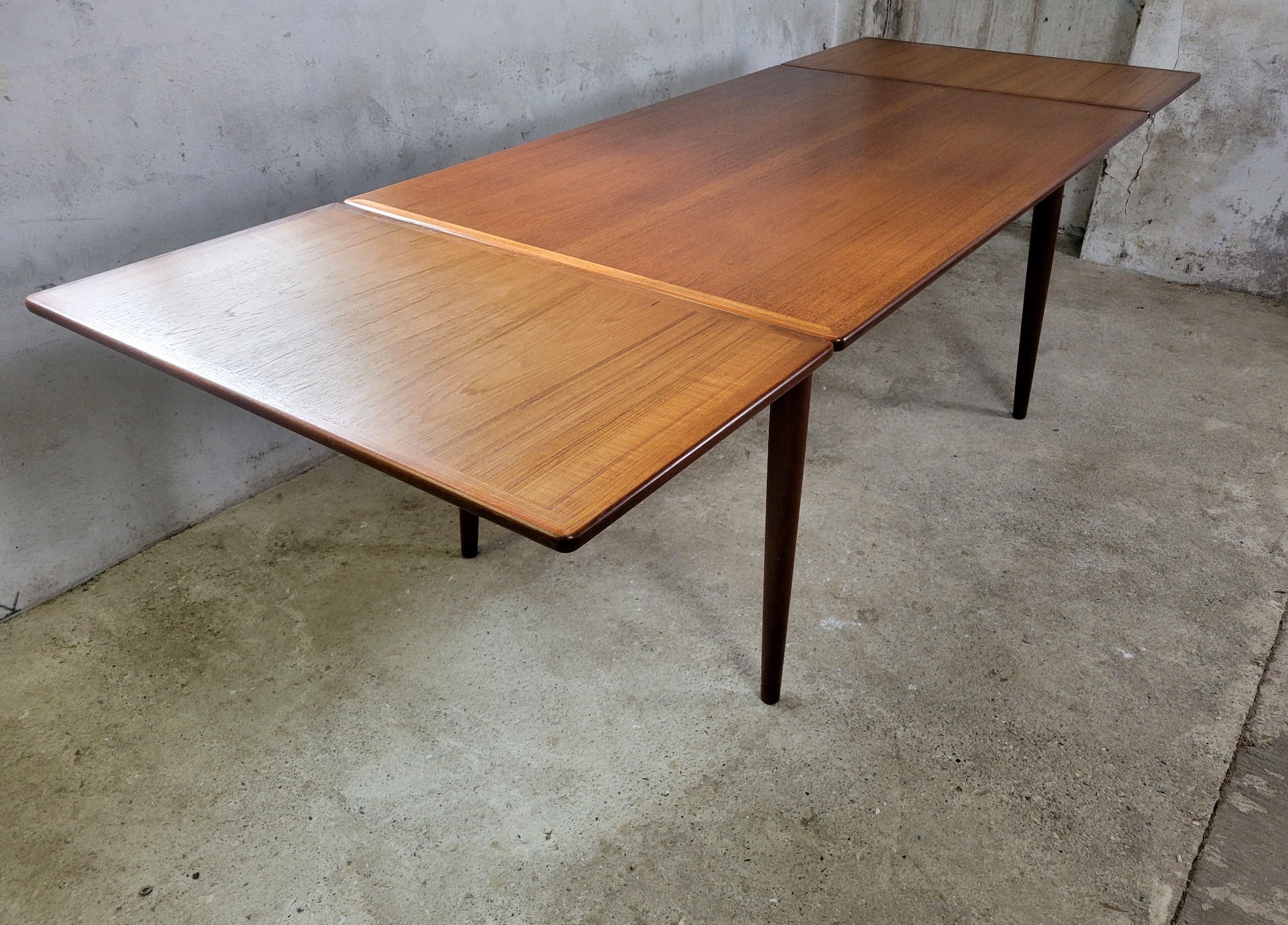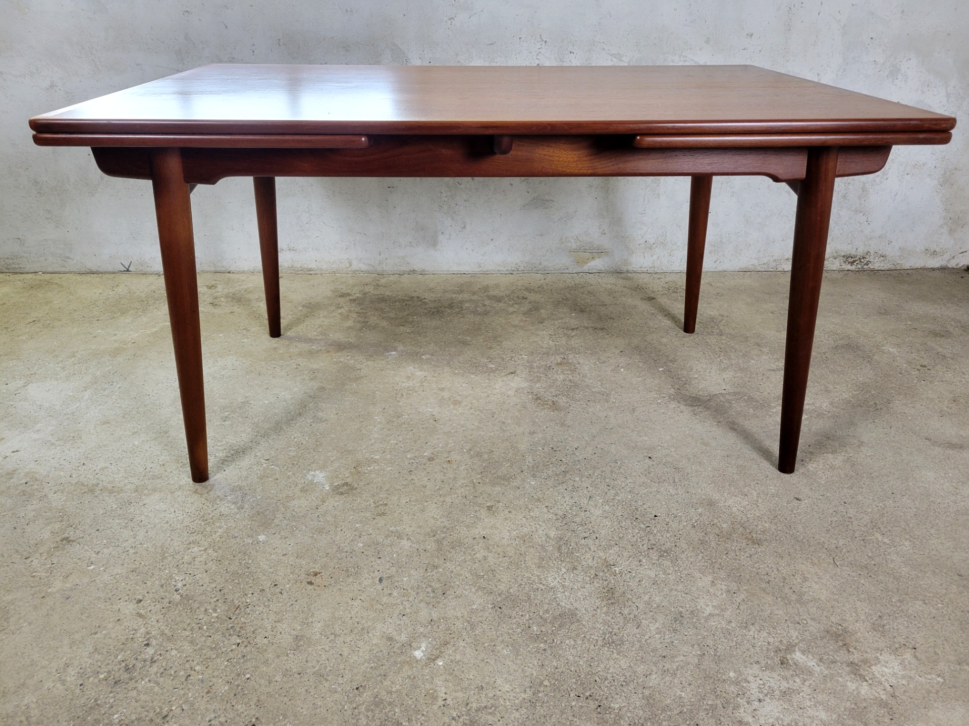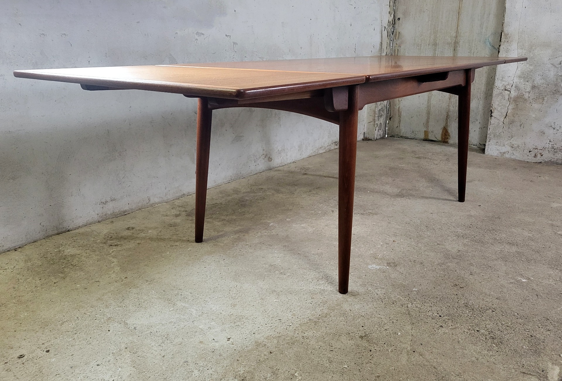 Bijzonder fraai vormgegeven eettafel van Hans J. Wegner, model AT-312 uitgebracht door Andreas Tuck, Denemarken, eind jaren 50. De tafel is volledig uitgevoerd in teak, met een massief teakhouten onderstel en een gefineerd bovenblad in teak. De tafel is een zeldzaam en tijdloos Scandinavisch designstuk van één van de meest invloedrijke ontwerpers van de 20e eeuw.