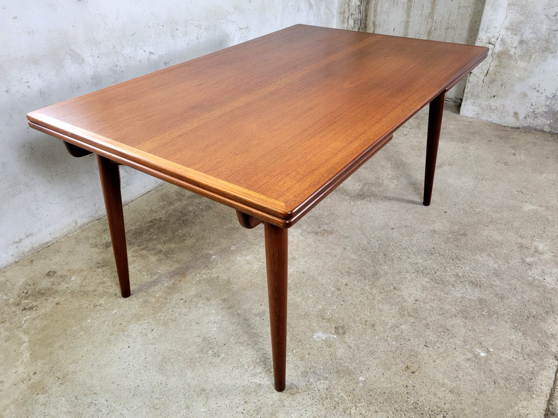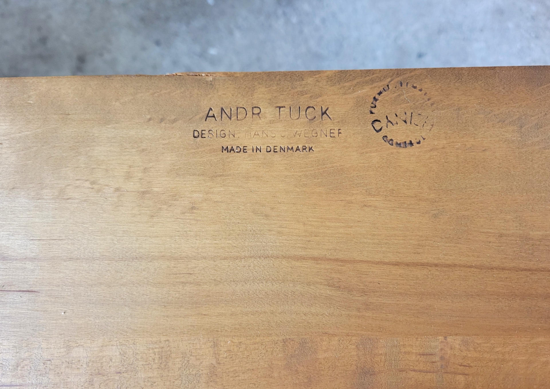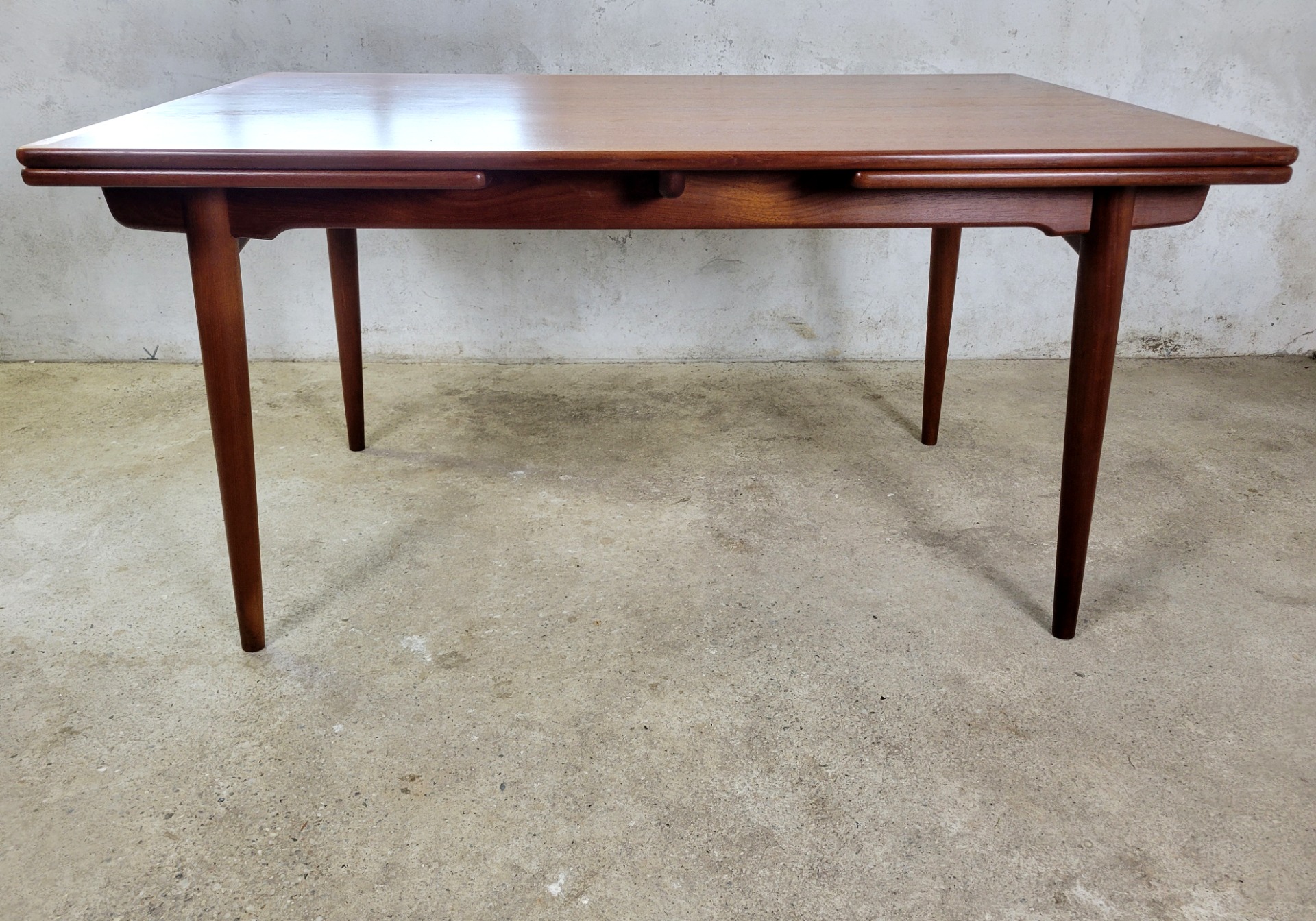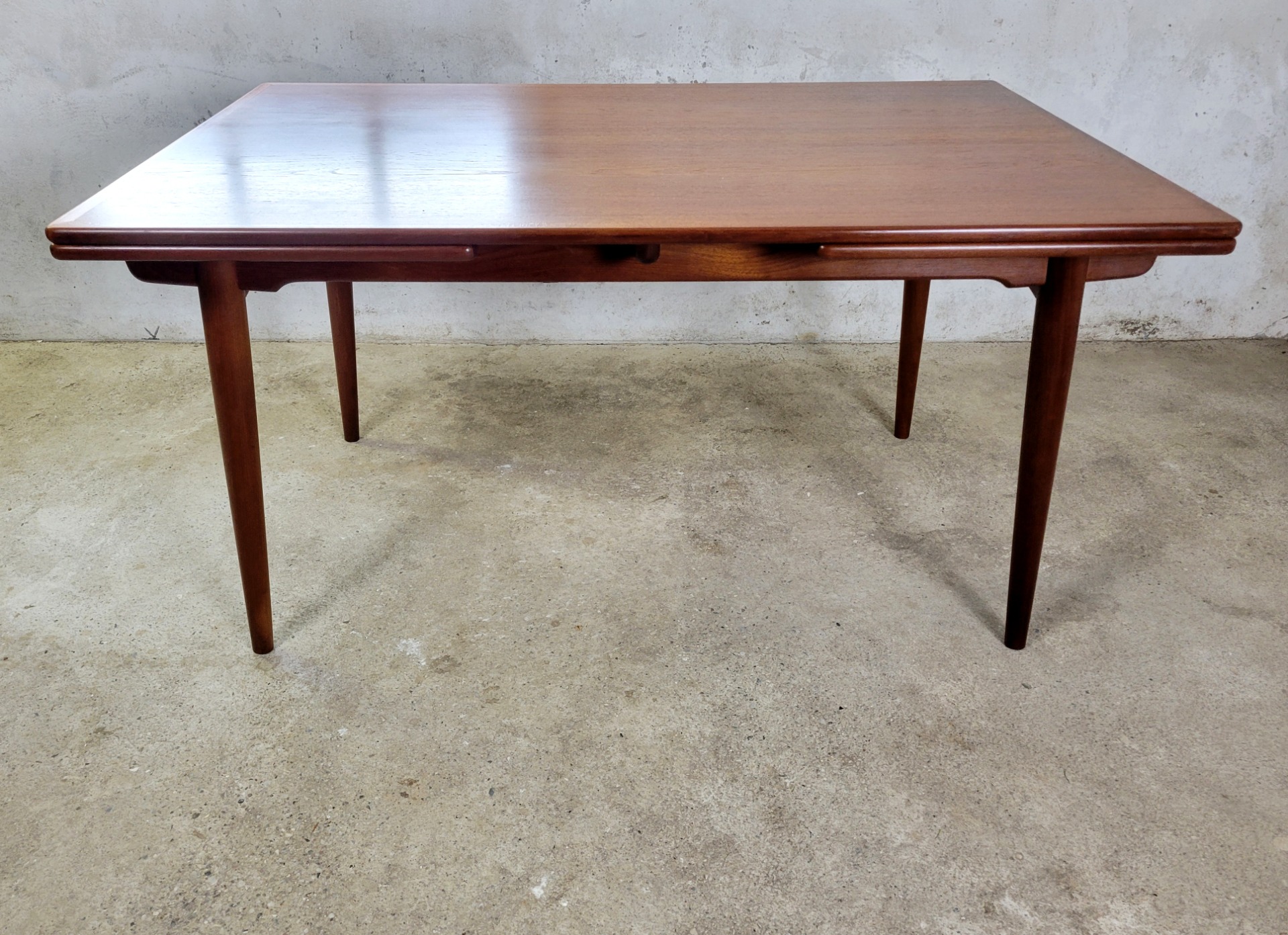Bijzonder fraai vormgegeven eettafel van Hans J. Wegner, model AT-312 uitgebracht door Andreas Tuck, Denemarken, eind jaren 50. De tafel is volledig uitgevoerd in teak, met een massief teakhouten onderstel en een gefineerd bovenblad in teak. De tafel is een zeldzaam en tijdloos Scandinavisch designstuk van één van de meest invloedrijke ontwerpers van de 20e eeuw.