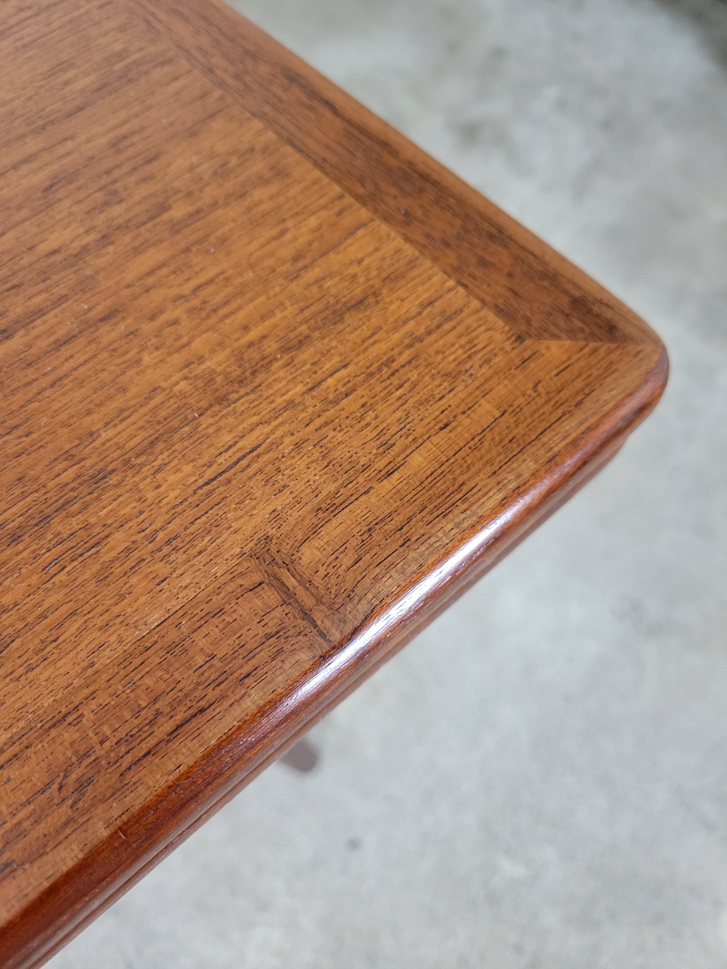 Deze tafel verkeert in uitstekende tot bijna nieuwe staat. Het blad heeft recent een professionele refinish gekregen, waardoor de kleur, tekening en diepte van het teak schitterend naar voren komen. De tafel is in het verleden zorgvuldig onderhouden en vertoont vrijwel geen gebruikssporen.