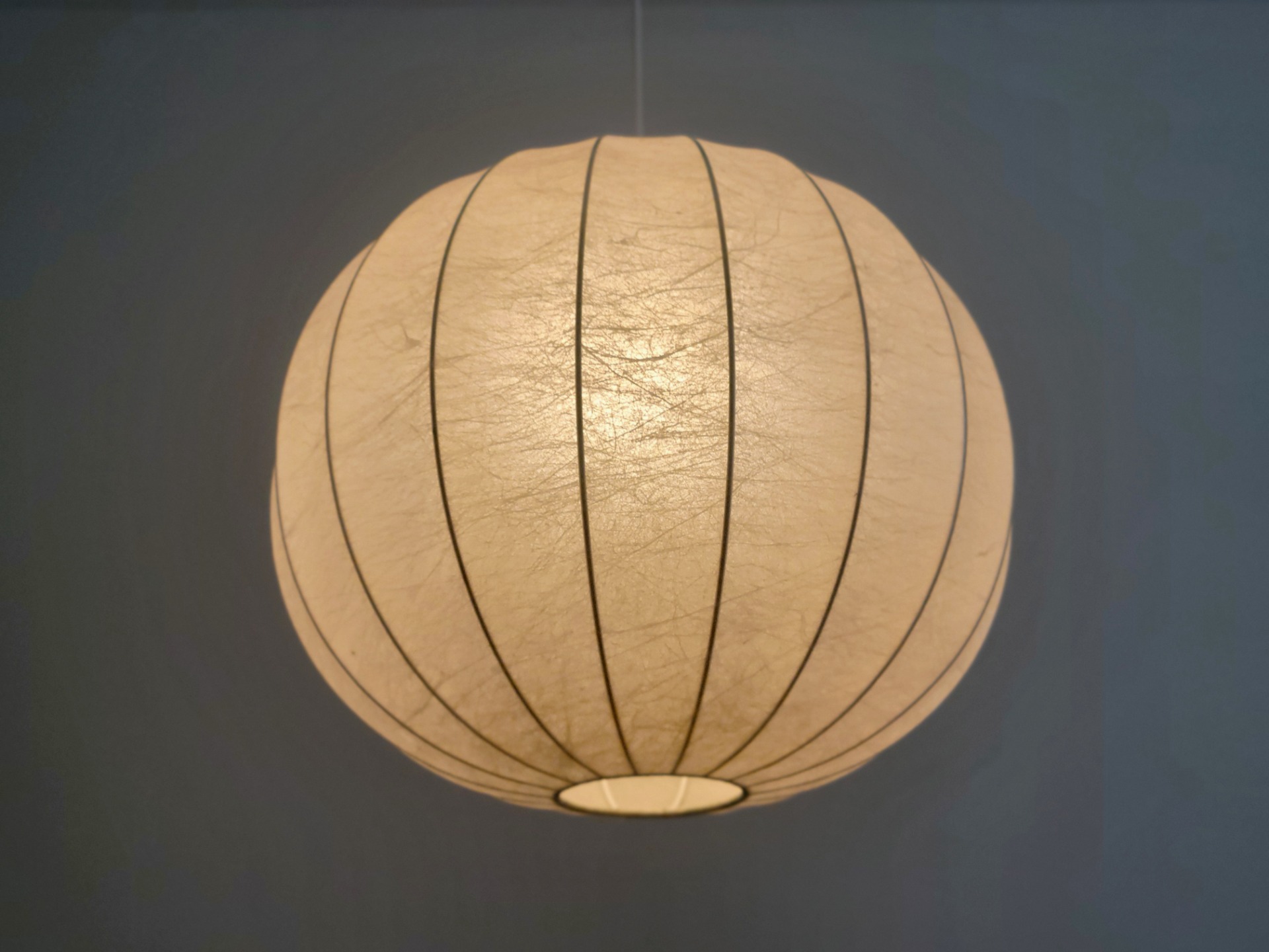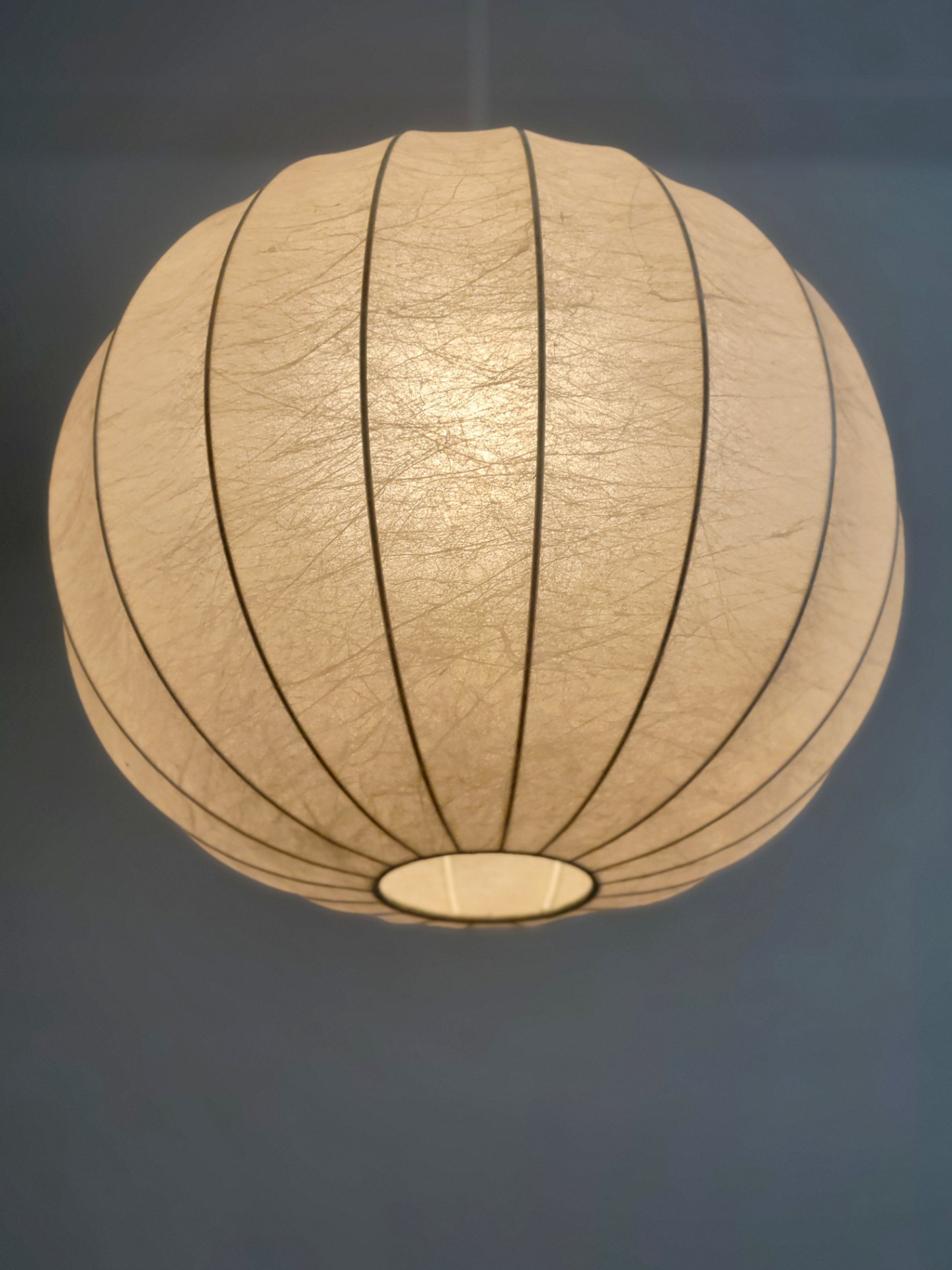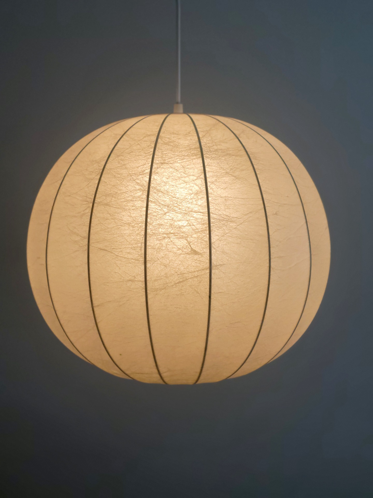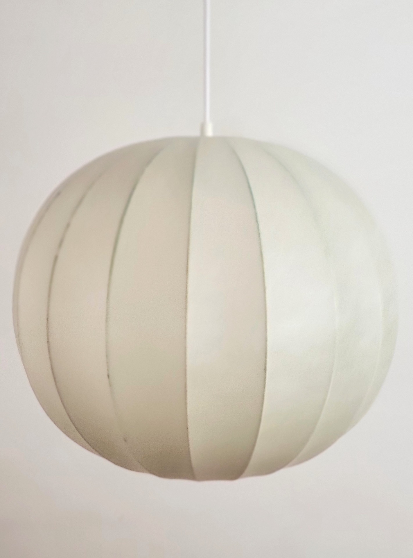 Deze bolvormige hanglamp is voorzien van kunstharsmateriaal dat over een stalen draadframe is gespoten om een lichtgewicht maar toch duurzame structuur te creëren. Het materiaal hardt uit tot een zachte, sfeervolle vorm en straalt een warme, uitnodigende gloed uit. Lamp verkeert in zeer goede staat.