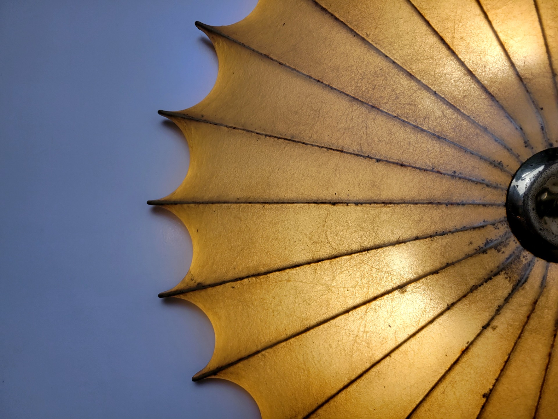 Vintage Cocoon plafondlamp, ontworpen door Friedel Wauer en geproduceerd door Goldkant Leuchten, Duitsland in de jaren 60. De lamp heeft een dun metalen frame bedekt met gespoten hars. De doorschijnende hars zorgt voor een prachtig zacht lichteffect. De lamp heeft nog de originele koperen fittingen. De bedrading is vervangen. De lamp verkeert in vintage conditie. Heeft geen beschadihingen, maar wel een patina. Het metalen frame is geoxideerd.