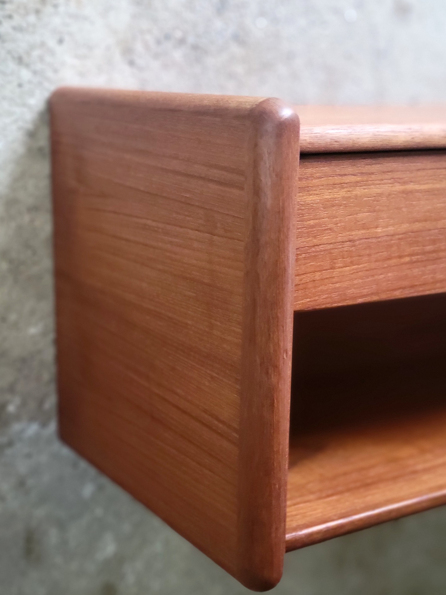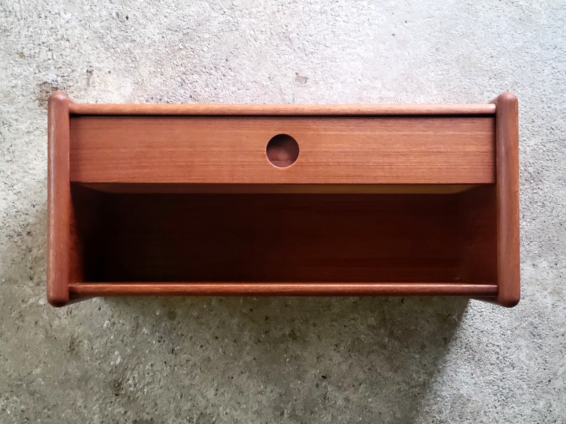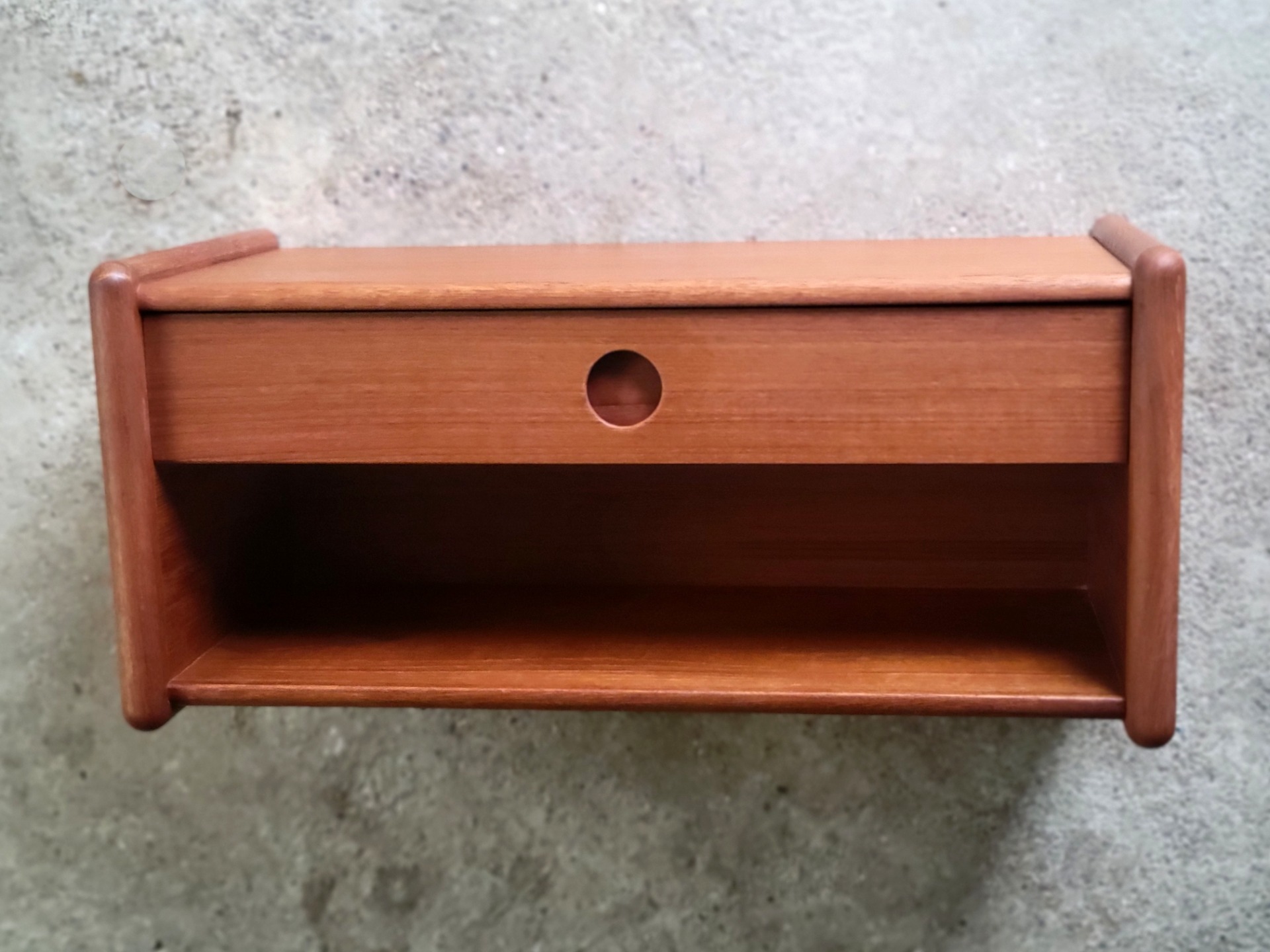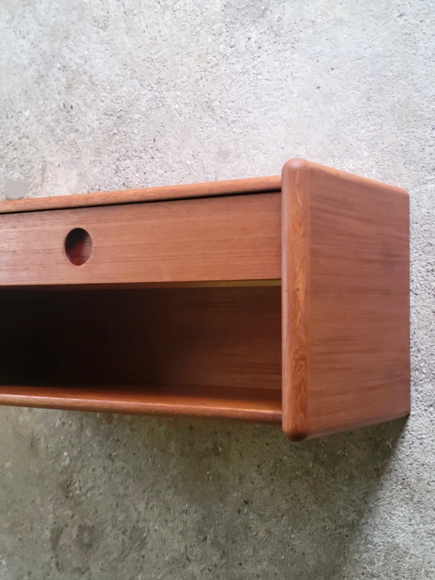Bijzonder fraaie floating wandkastje ontworpen door Kai Kristiansen en vervaardigd door Vildbjerg, Denemarken 1960. Gemaakt van hoogwaardig teak, biedt het kastje een warme, natuurlijke uitstraling. De lade, voorzien van geïntegreerde greep, geeft het meubel een elegante uitstraling.
