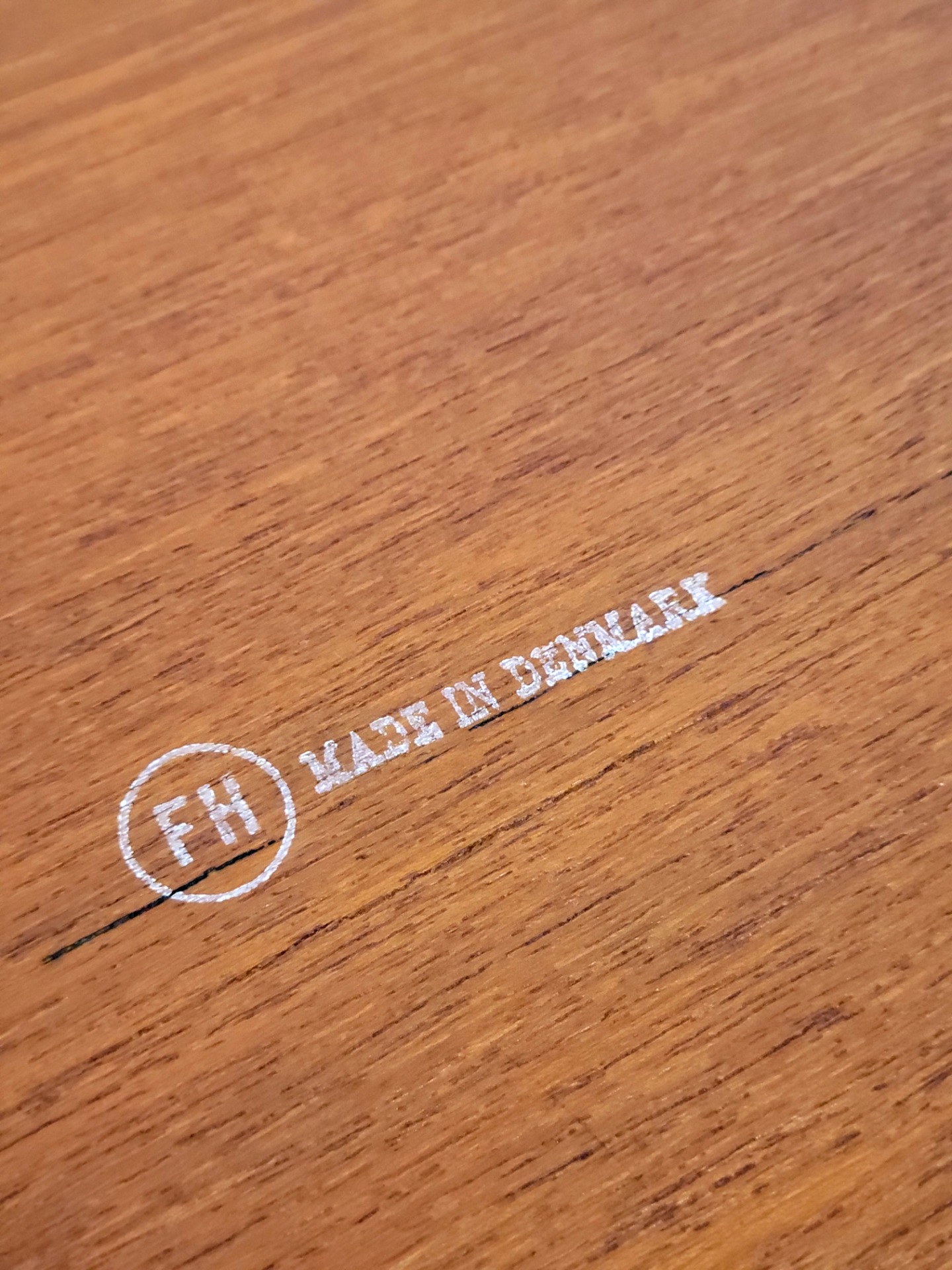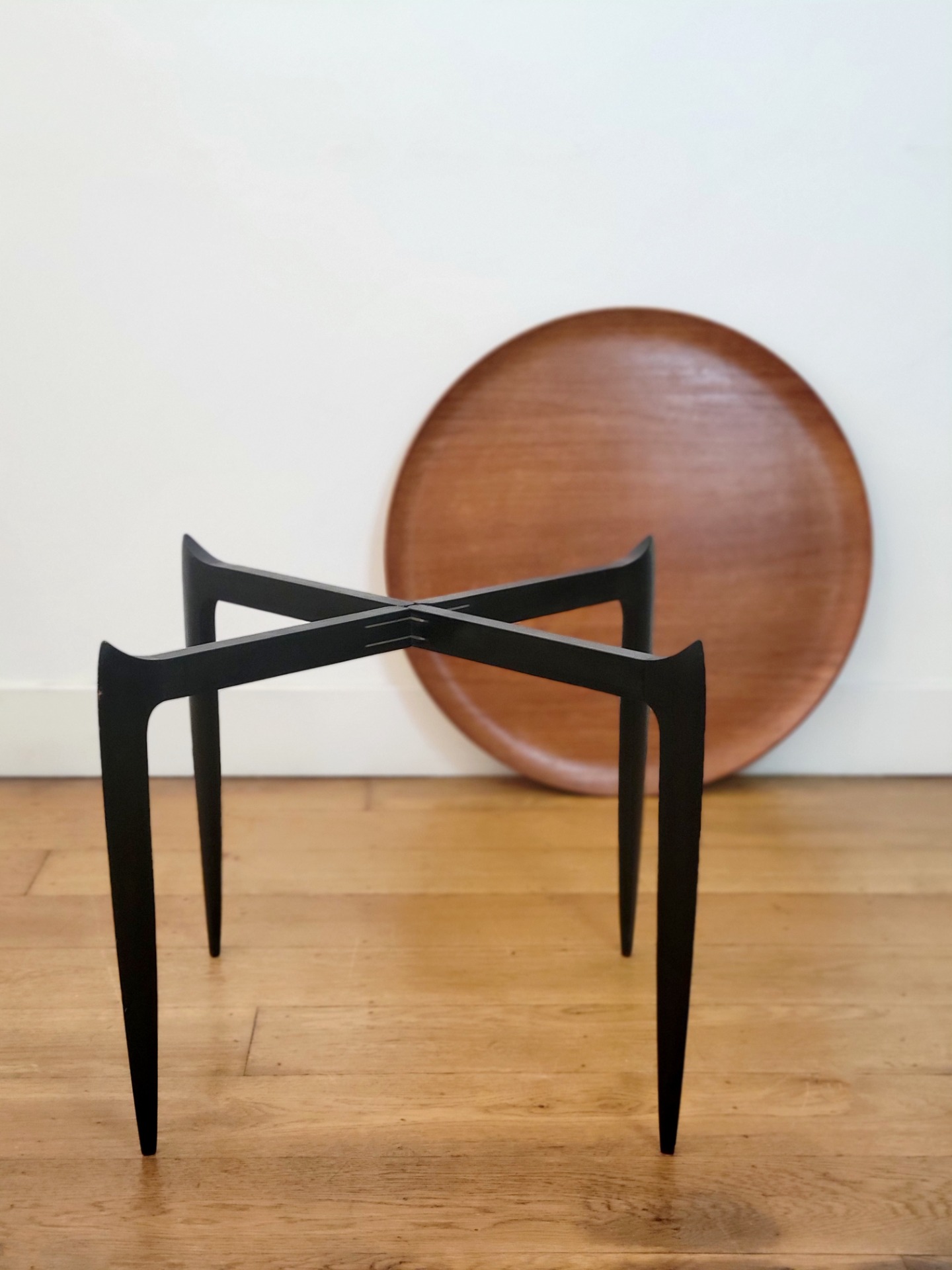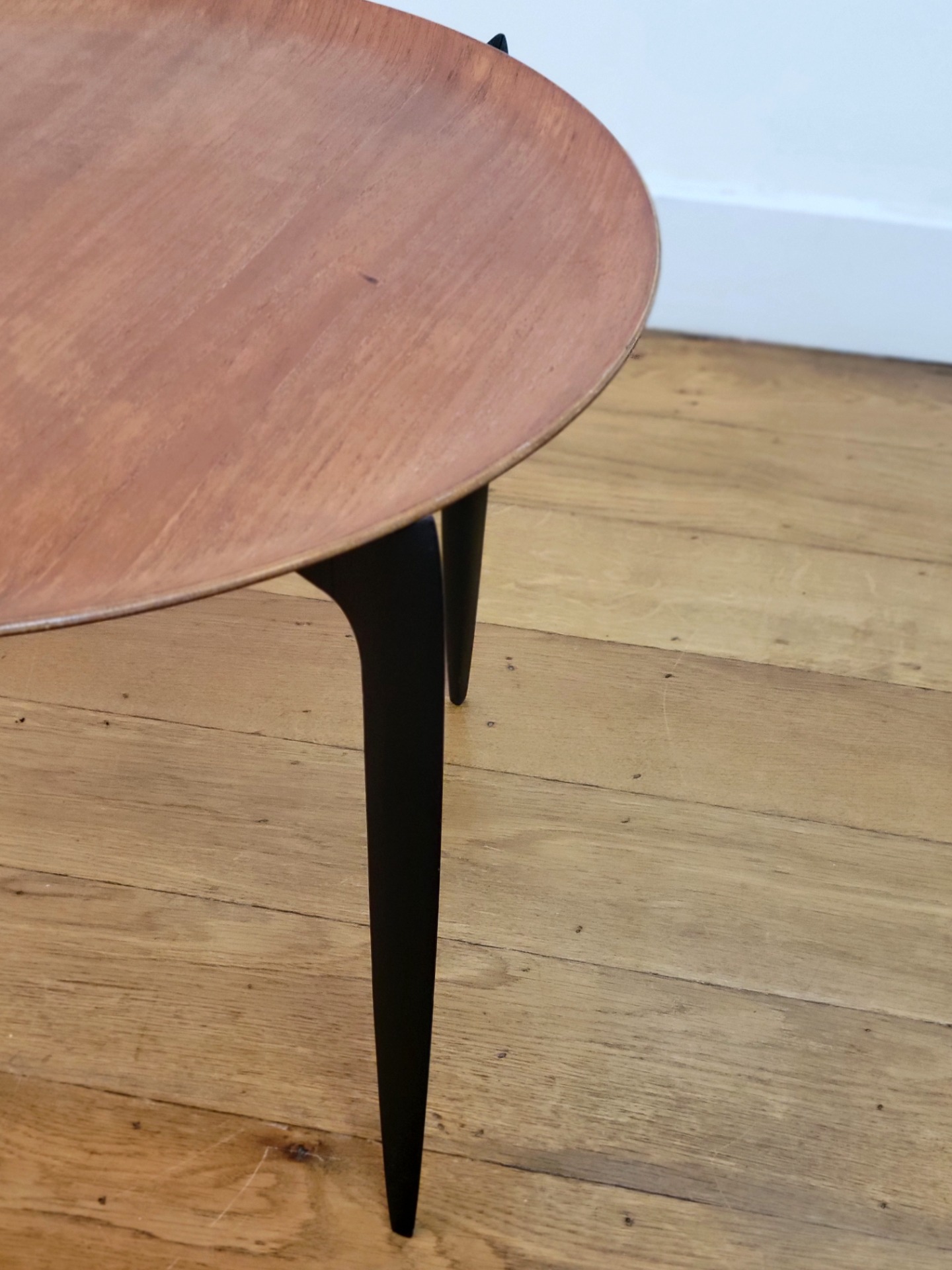 Een zeldzaam dienbladtafeltje, model '4508', ontworpen door H. Engholm en Svend Aage Willumsen voor Fritz Hansen in 1958. Prachtige vroege versie met zwarte inklapbare voet en rond teakhouten blad, geproduceerd in Denemarken. Dit ontwerp is zeer verfijnd met veel oog voor detail en het ronde tafelblad kan eenvoudig worden verwijderd om als dienblad te gebruiken. De elegante voet kan worden ingeklapt voor gemakkelijk opbergen. Een collectorsitem in goede vintage staat. Het bovenblad heeft enkele lichte plekken in het fineer. Blad en voet hebben zijn gemerkt.