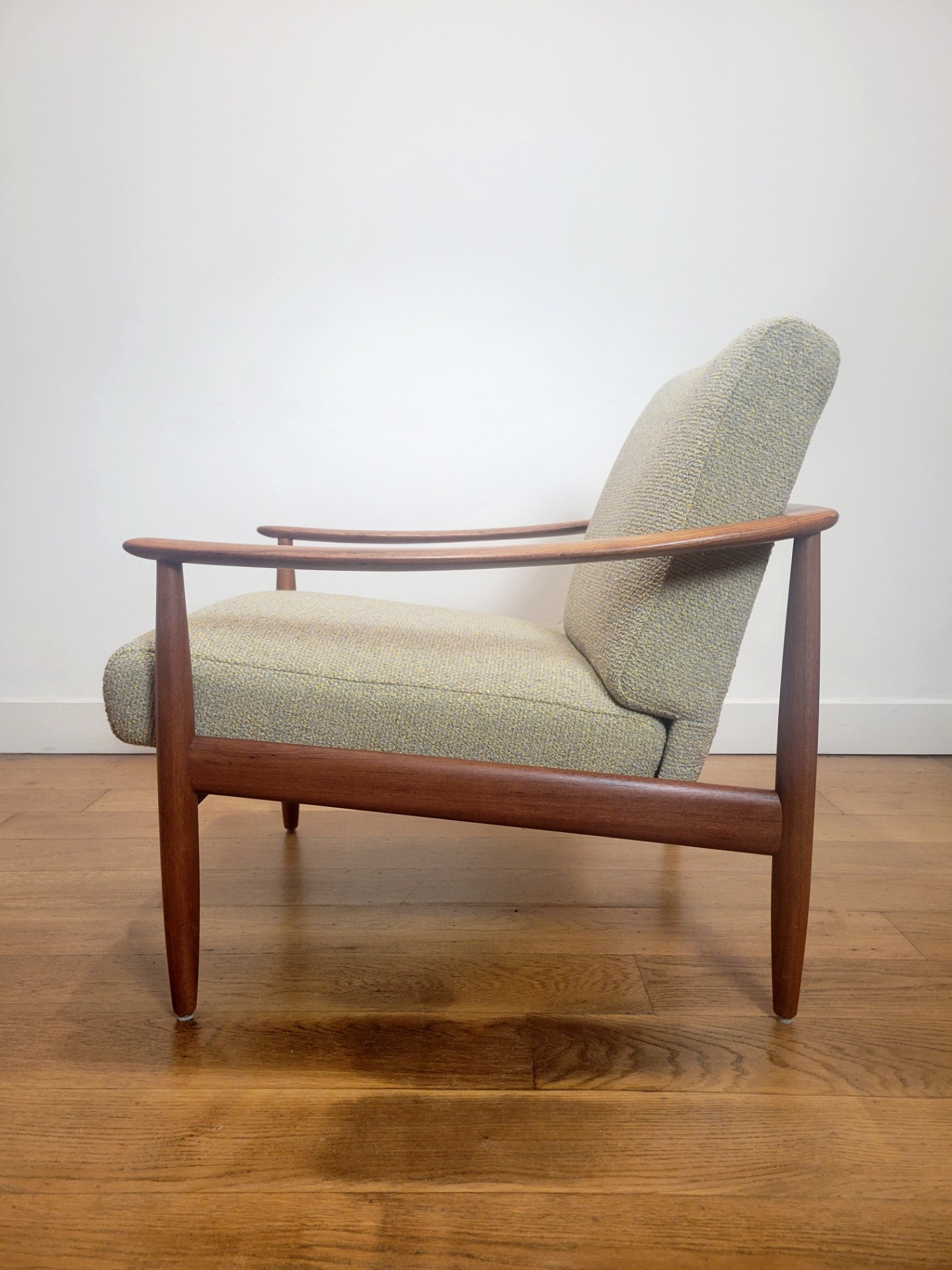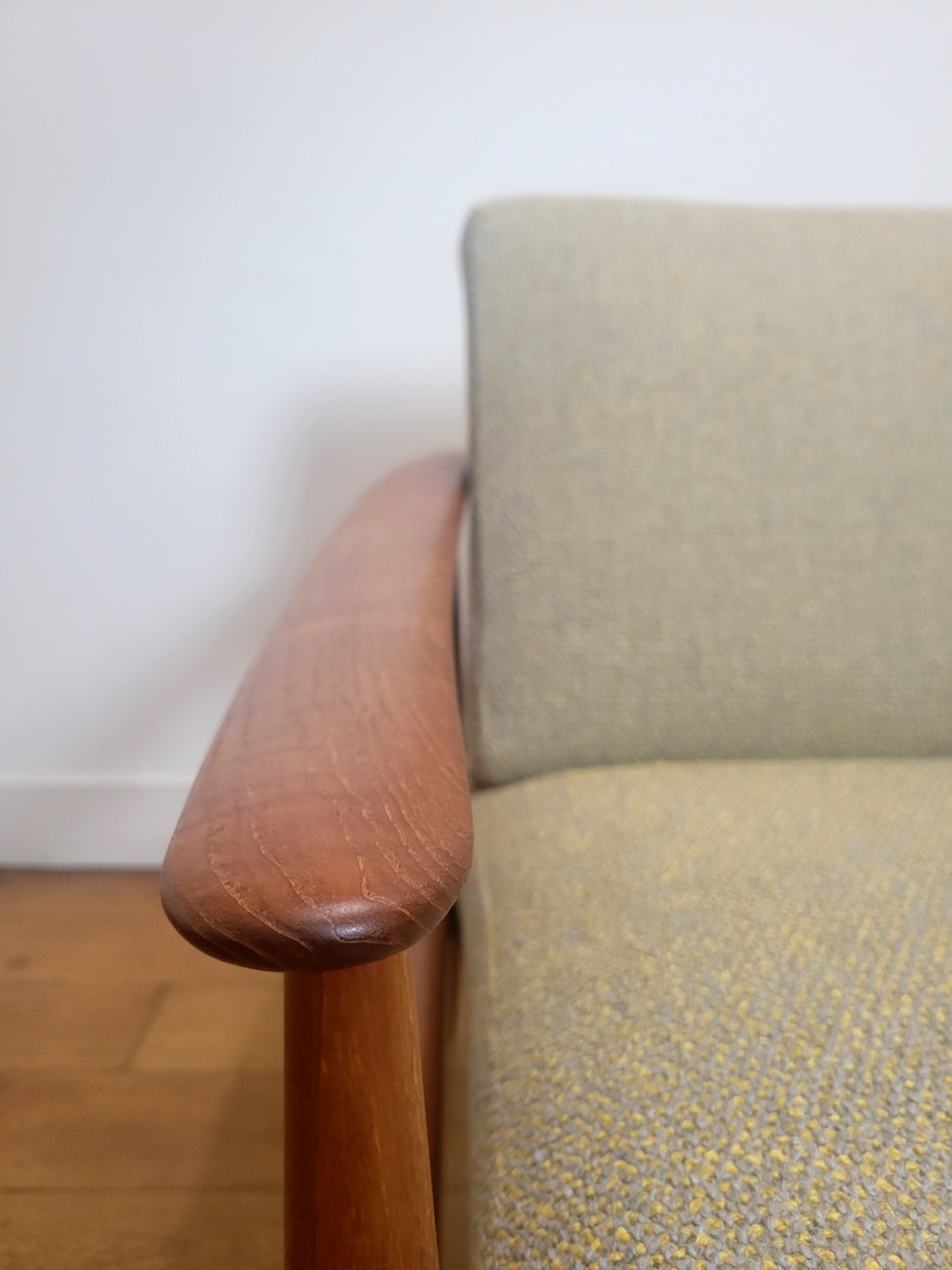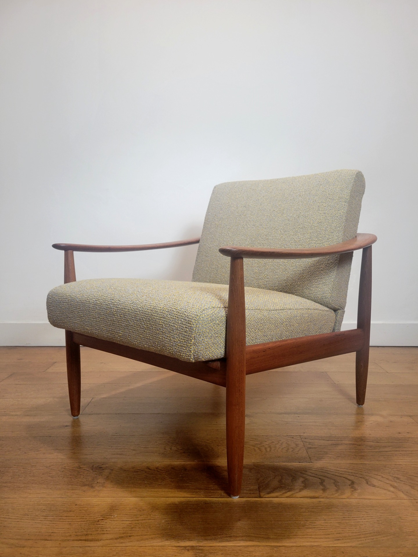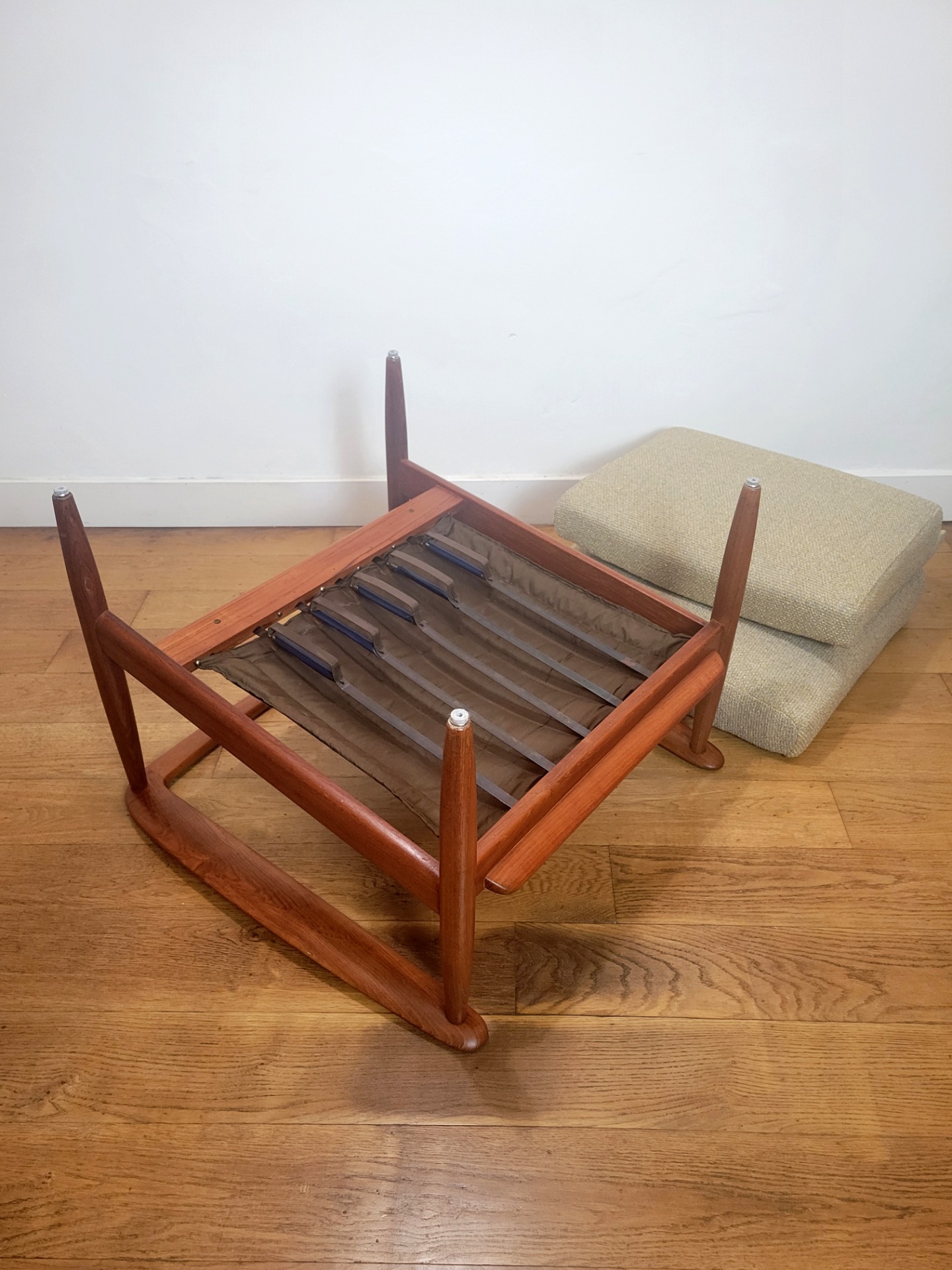 Vintage fauteuil in Scandinavische stijl van Carl Straub, Duitsland, 1960. Een bijzonder fraai en minimalistisch vormgegeven meubel van hoge kwaliteit. De open structuur van het teakhouten frame geeft de stoel een licht karakter. De kussens zijn opnieuw gestoffeerd met meubelstof van De Ploeg. Het binnenwerk van de kussens is geveerd en geven een aangenaam zitcomfort. De stoel verkeert in zeer nette staat.