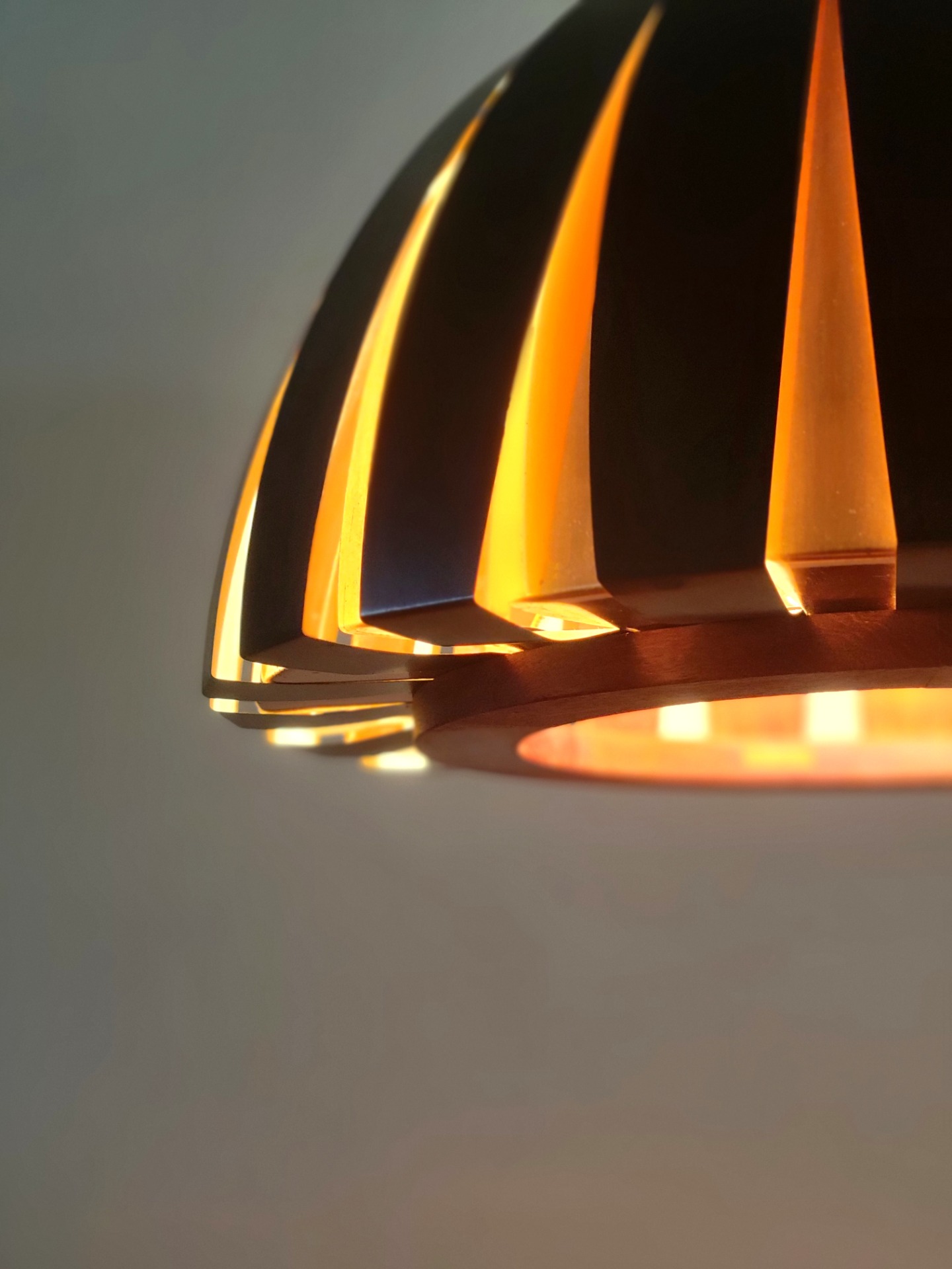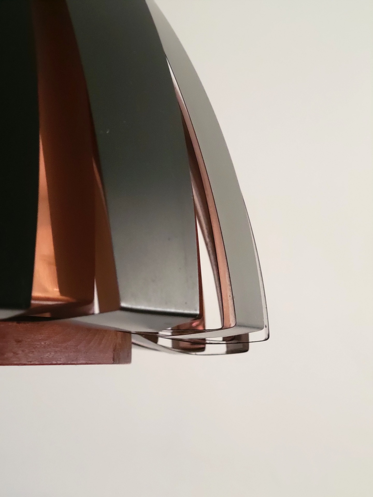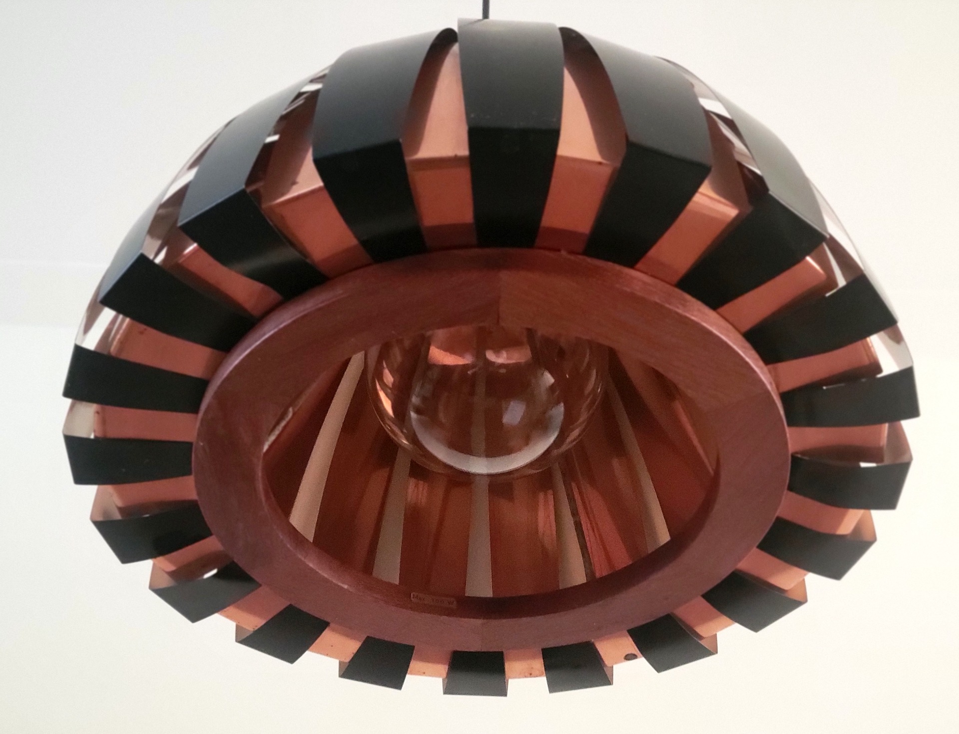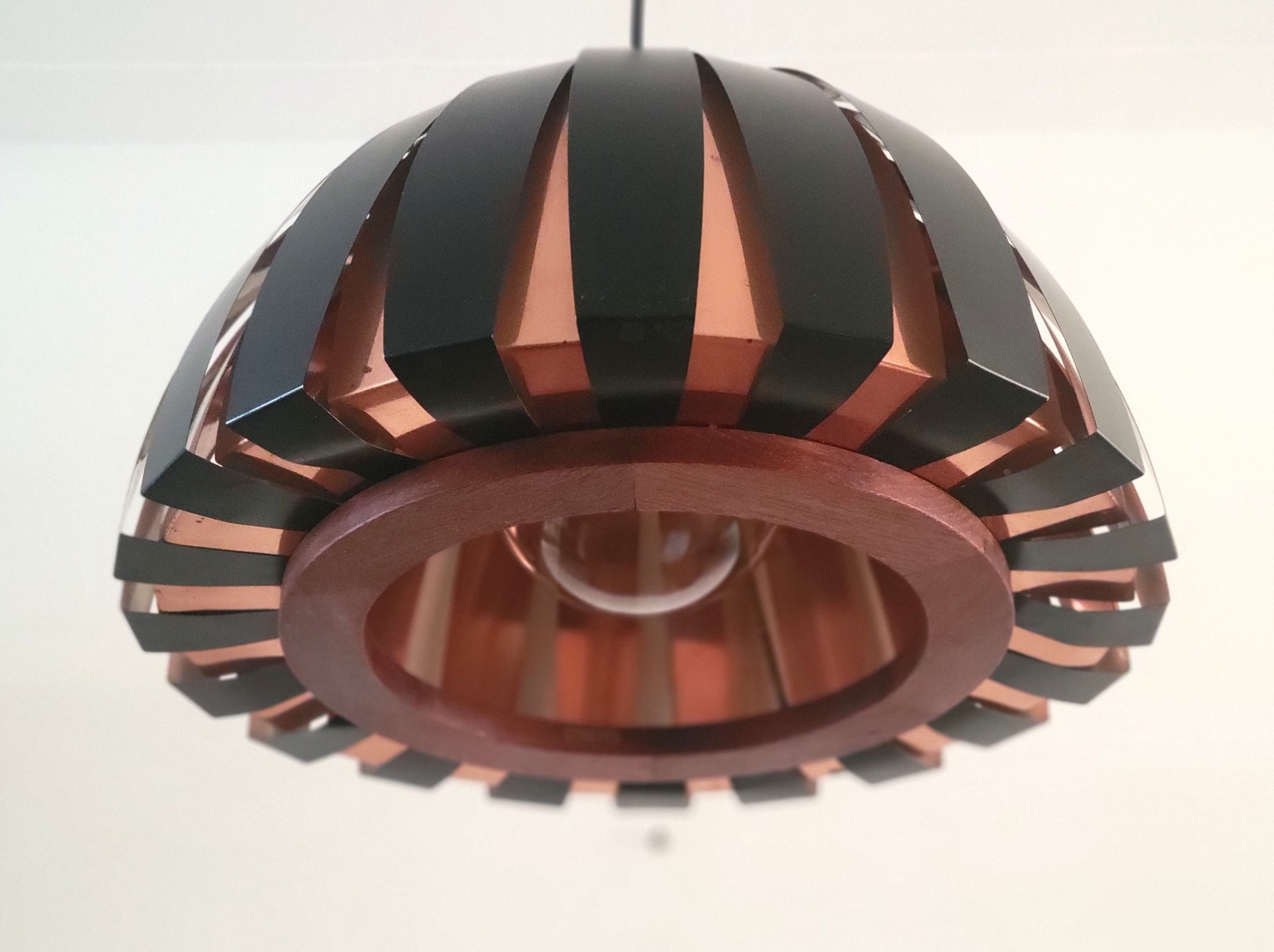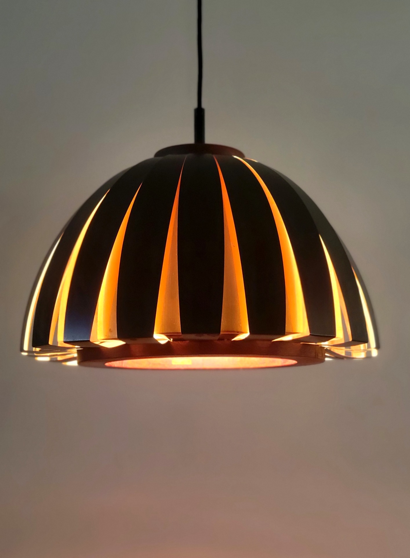 Bijzonder fraai vormgegeven hanglamp van Svend Age Holm Sørensen uitgebracht door Holm Sørensen & Co Denmark. De lamp is opgebouwd uit twee teakhouten ringen waaraan koperen en zwart metalen lamellen zijn bevestigd. Door de ruimte tussen de lamellen weerkaatst het licht zich. Dit geeft een bijzonder warm effect. De lamp verkeert in zeer nette staat, met enkele lichte sporen van ouderdom.
