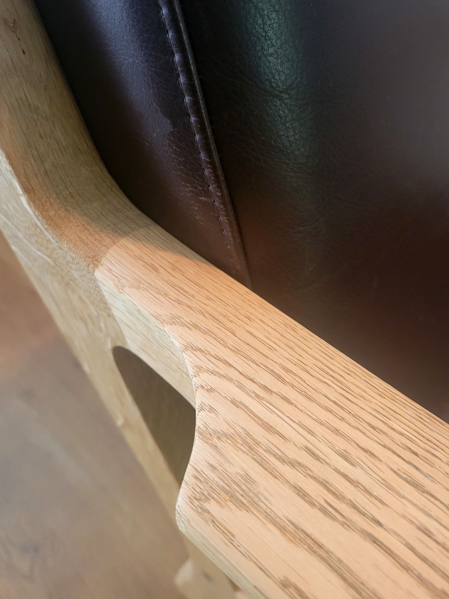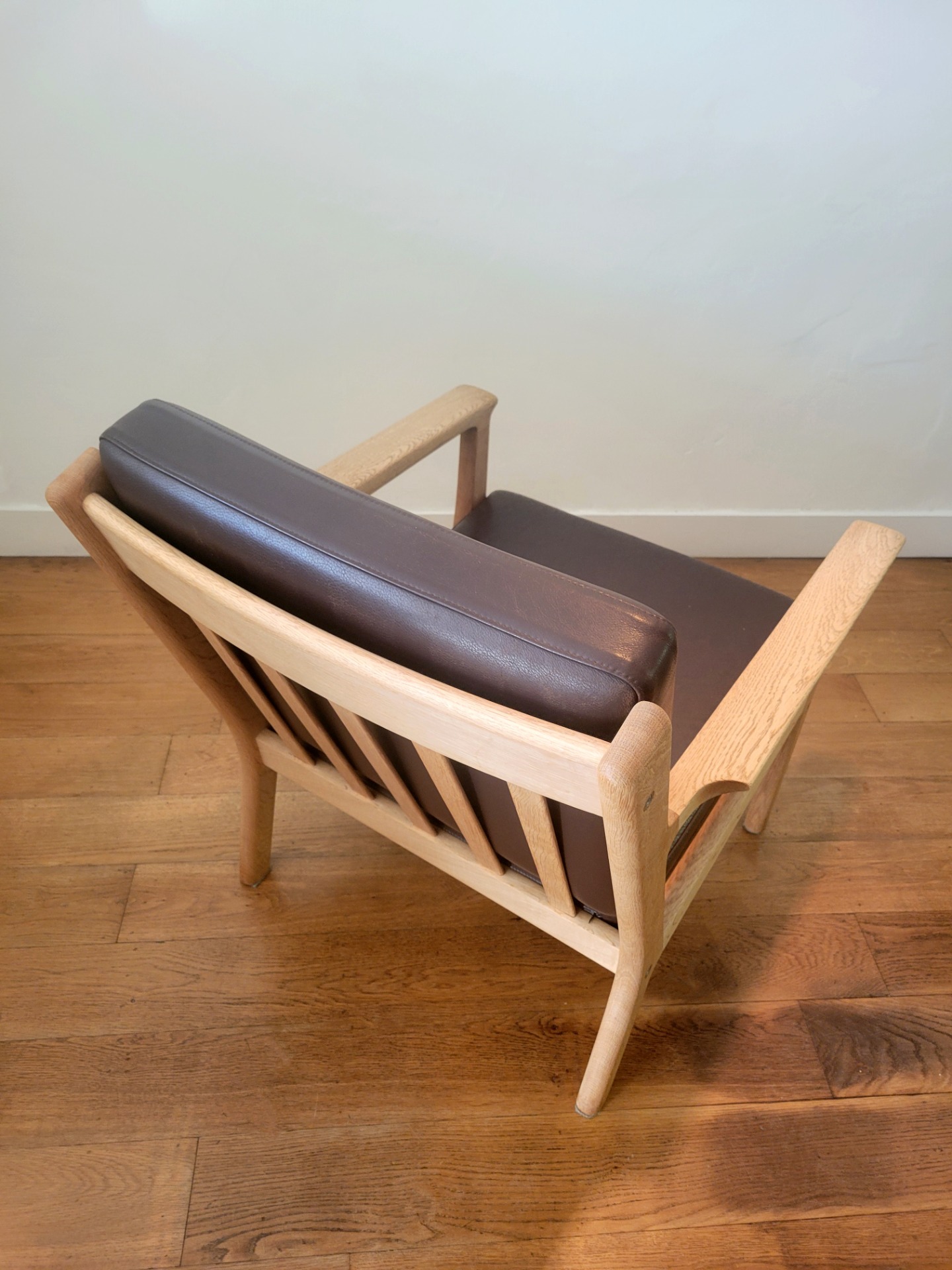 Mooi vormgegeven fauteuil van Hans J. Wegner uitgebracht door Getama, Denemarken, Model 265 in eikenhout en leer. Deze stoel is robuust en comfortabel, uitgevoerd in gezeept eiken en voorzien van bruin leren kussens met een mooie patina. De originele Getama stempel is  aan de onderzijde van de stoel zichtbaar. De stoel is in nette vintage staat.