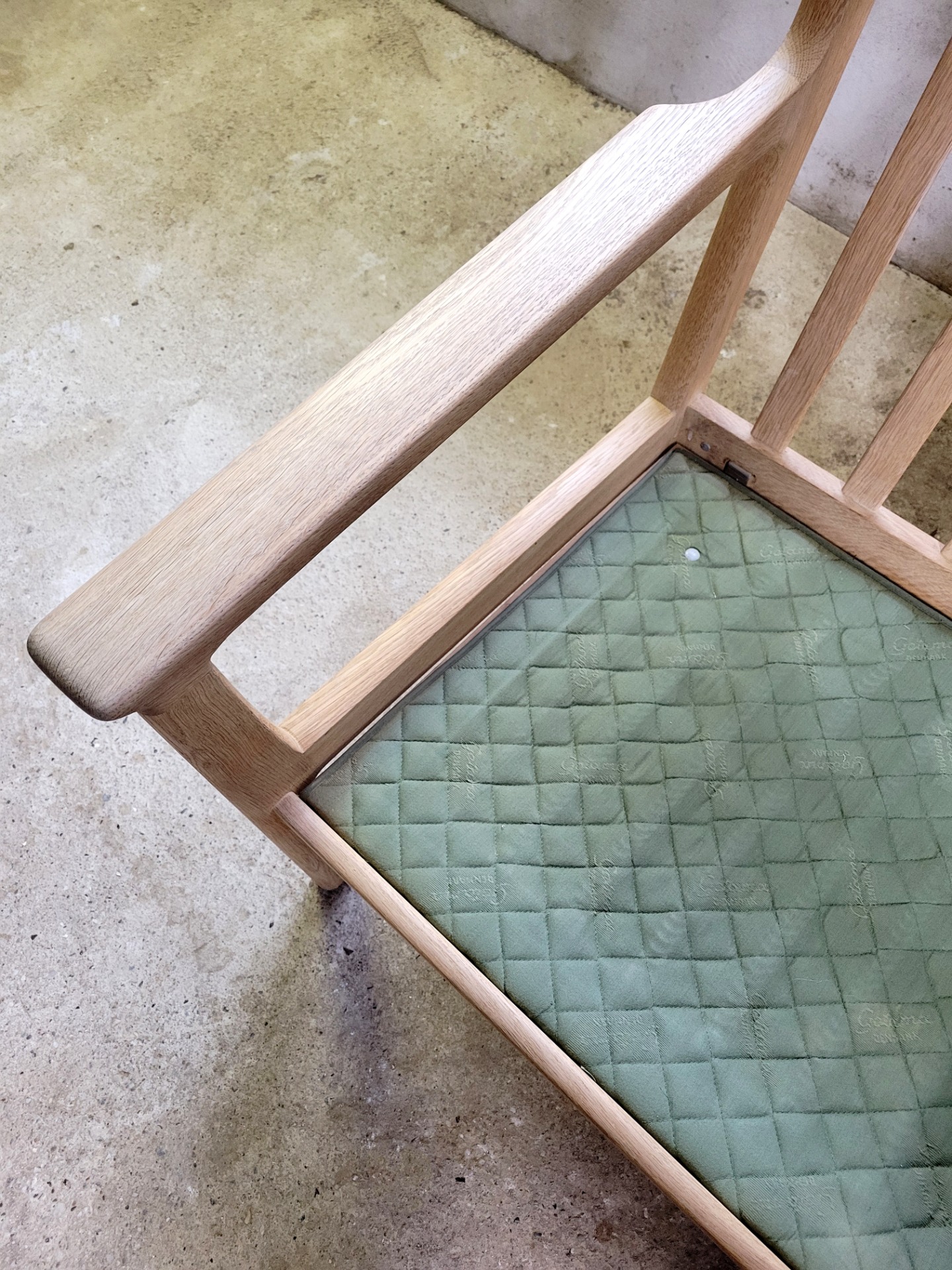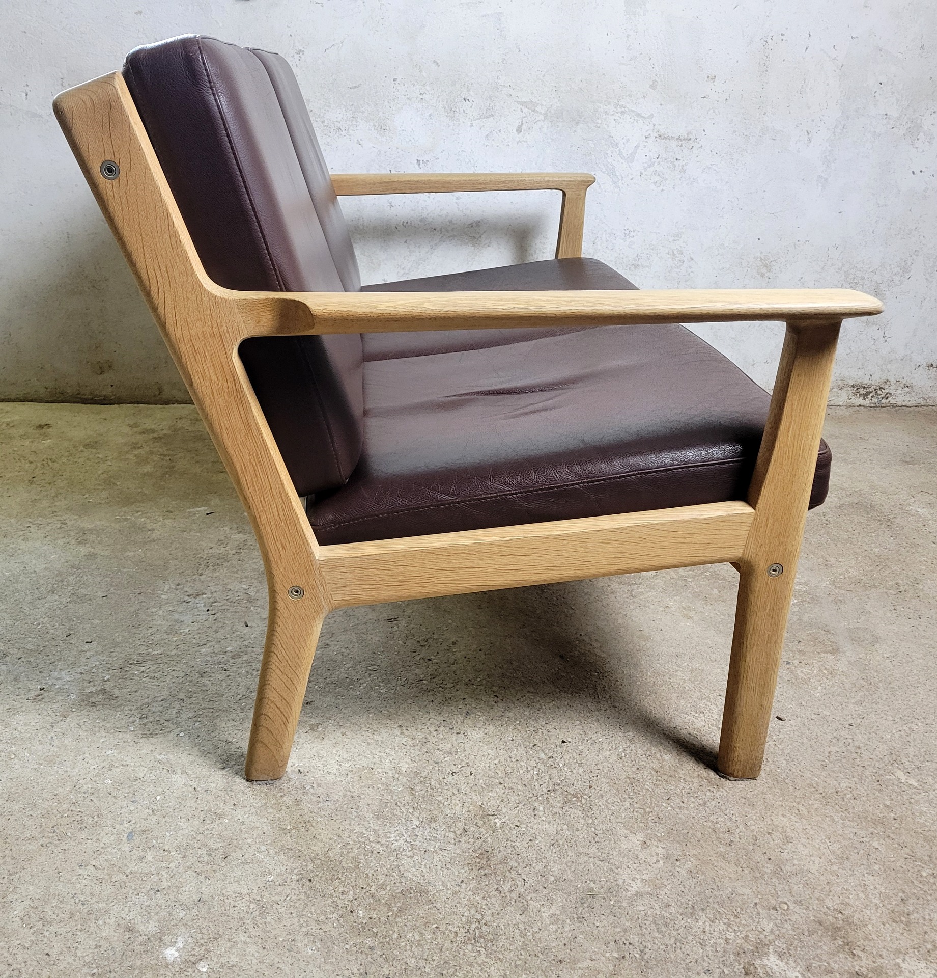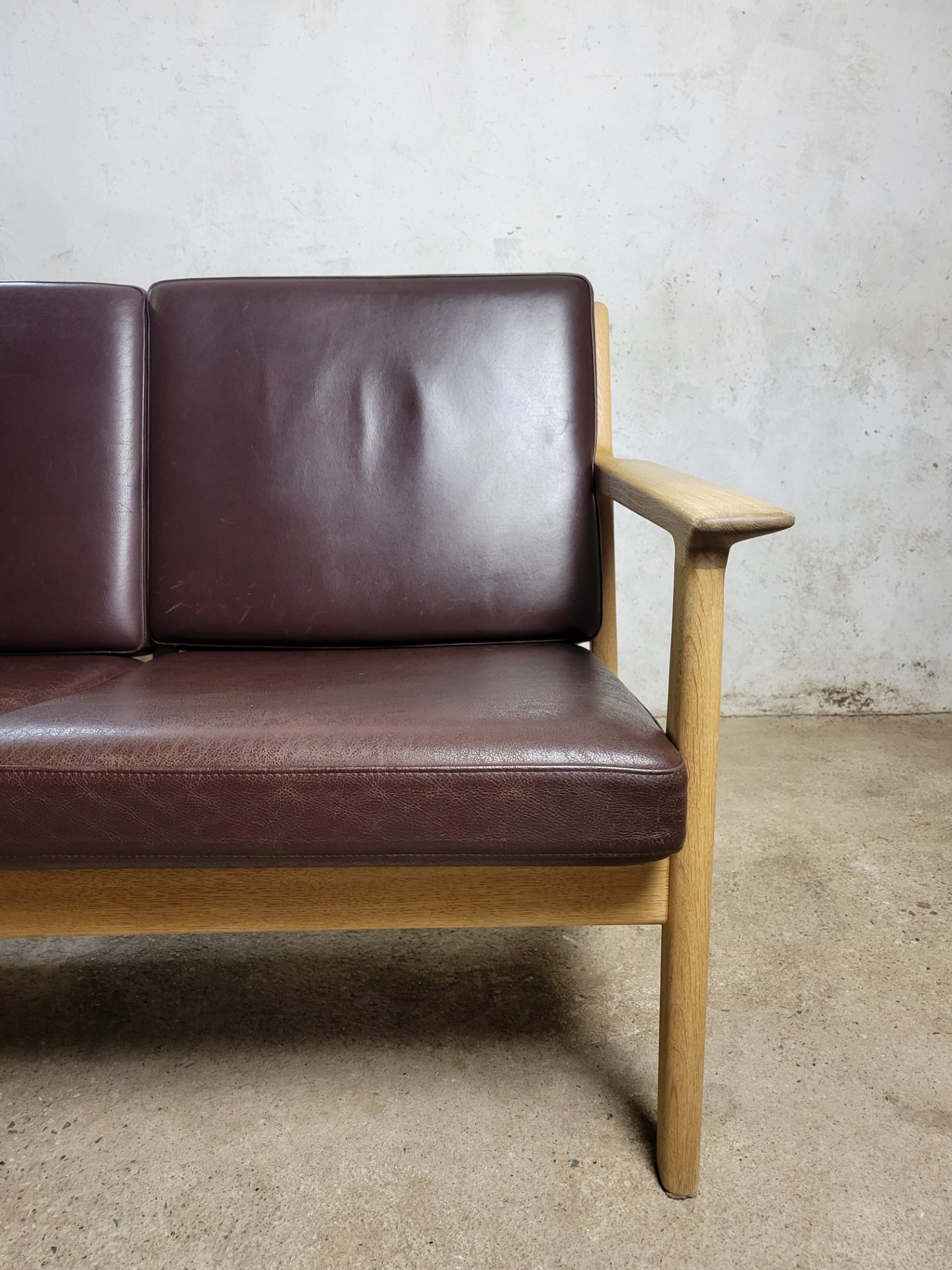 Mooi vormgegeven tweezits bank van Hans J. Wegner uitgebracht door Getama, Denemarken, Model 265 in eikenhout en bruin leer. Deze bank is robuust en comfortabel, uitgevoerd in gezeept eiken en voorzien van bruin leren kussens met een mooie patina. De originele Getama stempel is aan de onderzijde van de stoel zichtbaar. De stoel is in nette vintage staat.