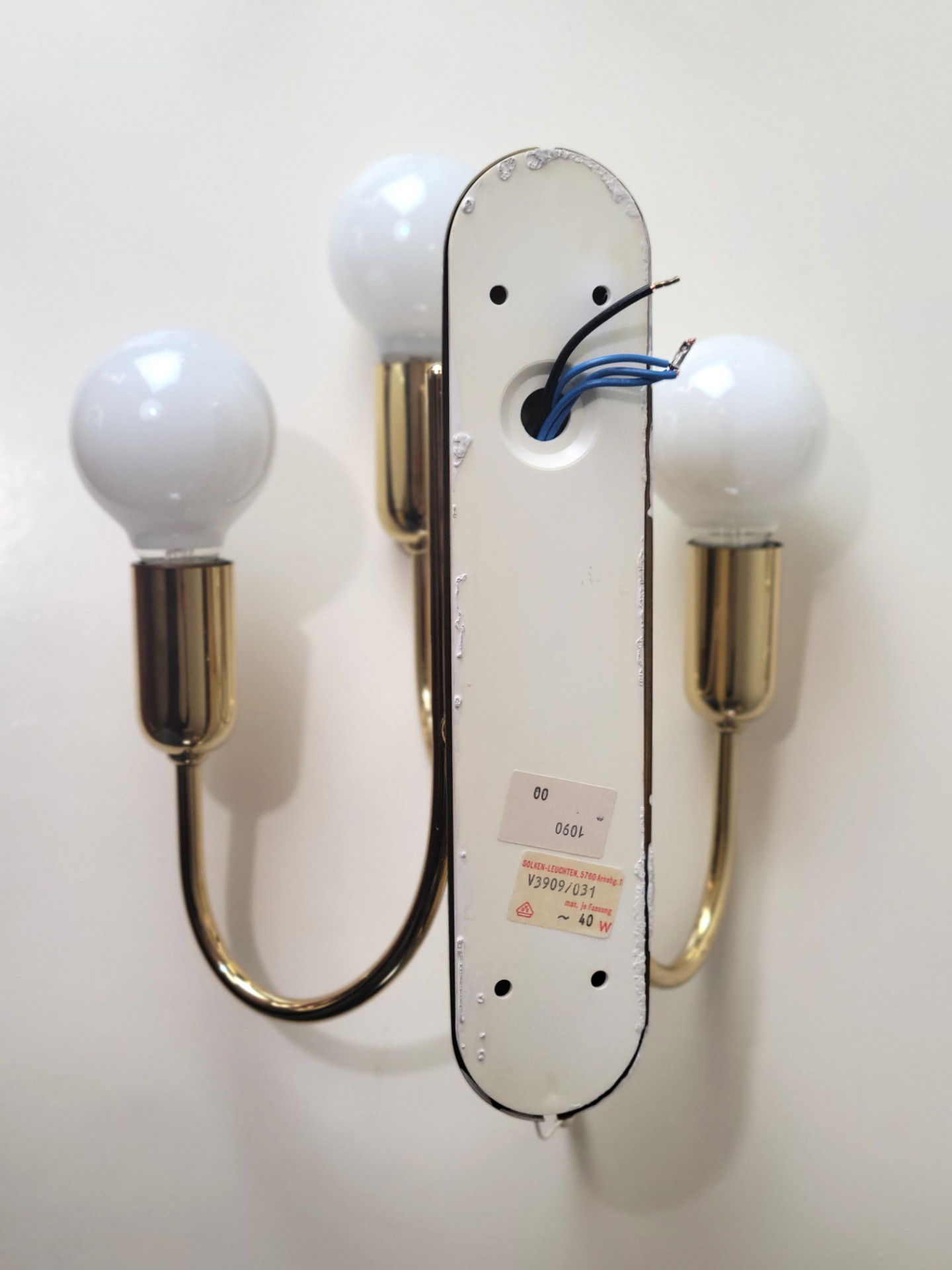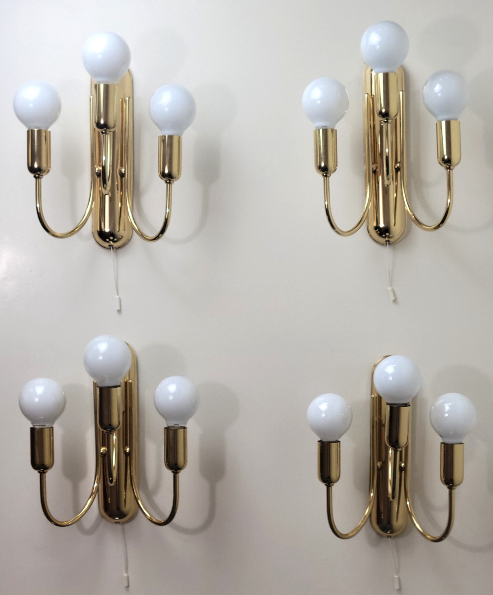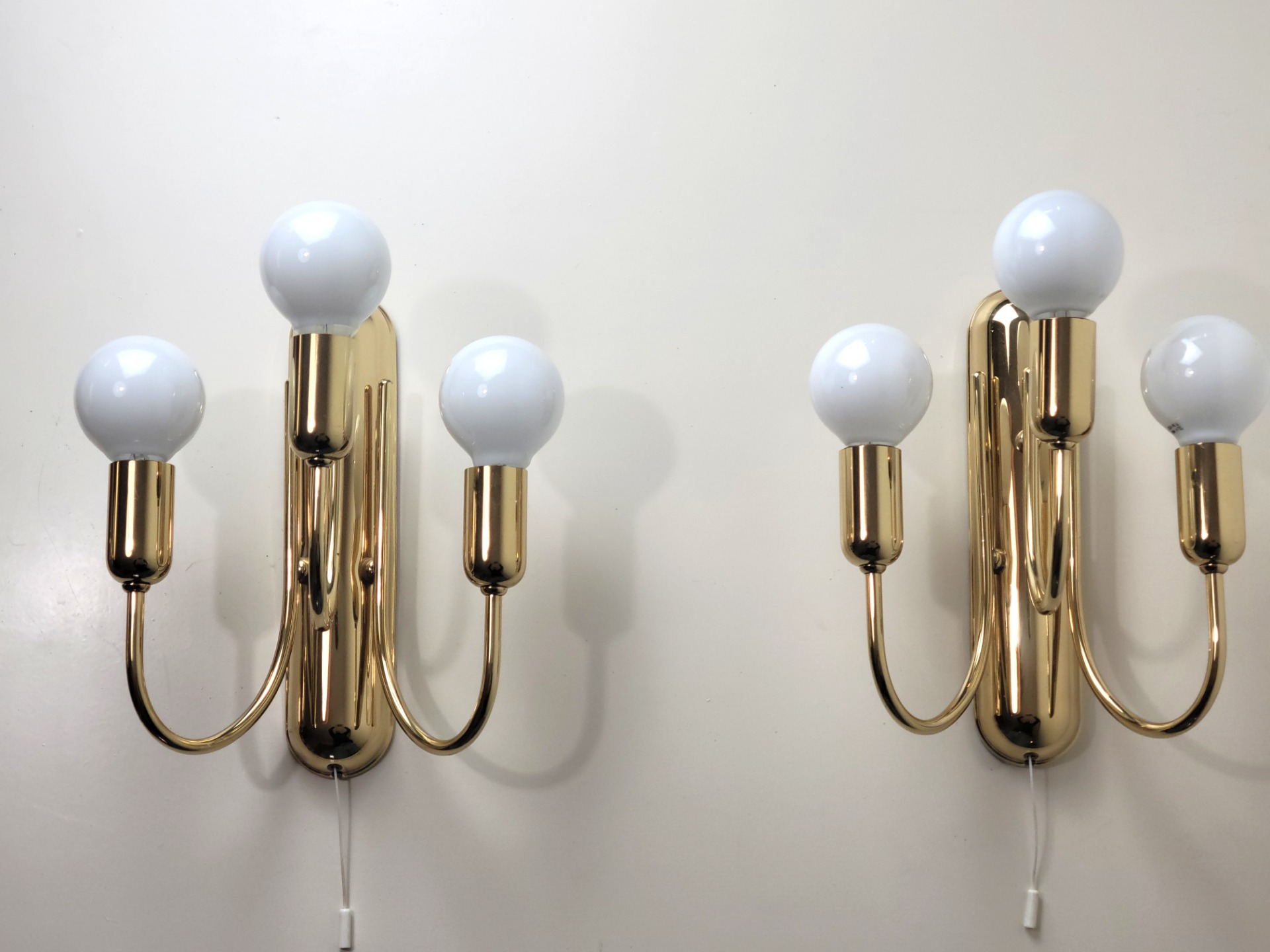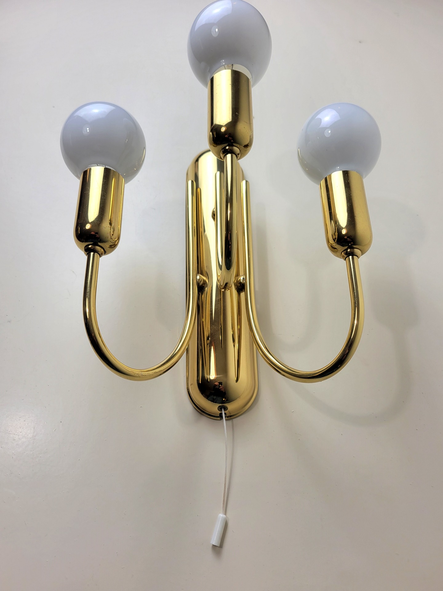 Een helder ontwerp; drie naar boven gerichte glazen bollen, elk ondersteund door een gebogen messing arm. De drie lichtbronnen zijn op verschillende hoogtes geplaatst, waardoor er een mooi golvend ontwerp ontstaat. De lampen verkeren in hele goede staat met niet of nauwelijks sporen van gebruik. Op achterzijde wandplaat zitten enkele plekjes muurverf.