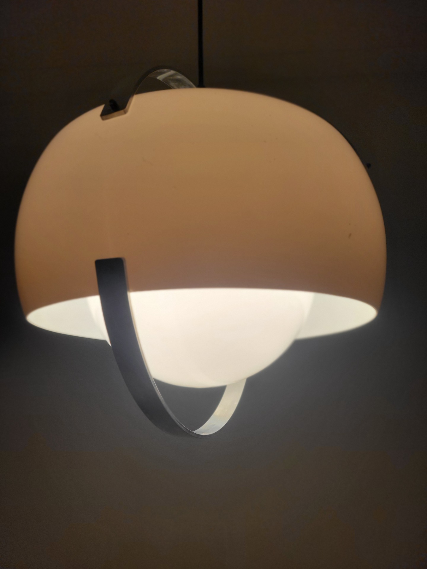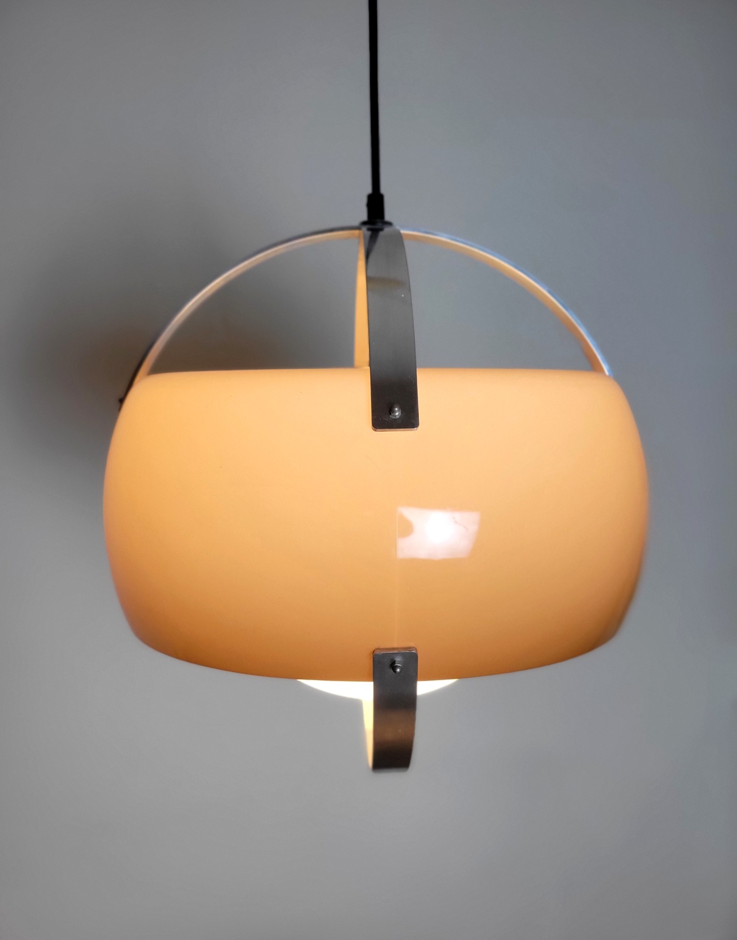 Vintage Space Age hanglamp uit de jaren '70. De lamp heeft een bijzonder strak ontwerp en doet enigszins denken aan de lampen van Harvey Guzzini uit dezelfde periode. De lamp heeft drie halve chromen ringen waaraan de mokka kleurige kunststof kap is bevestigd. In het midden van de kap huist een wit glazen bol. De lamp is oorspronkelijk uitgevoerd met een trek pendel, deze is vervangen met een nieuwe snoer en fitting. De lamp verkeert in goede vintage conditie met lichte sporen van gebruik conform leeftijd.