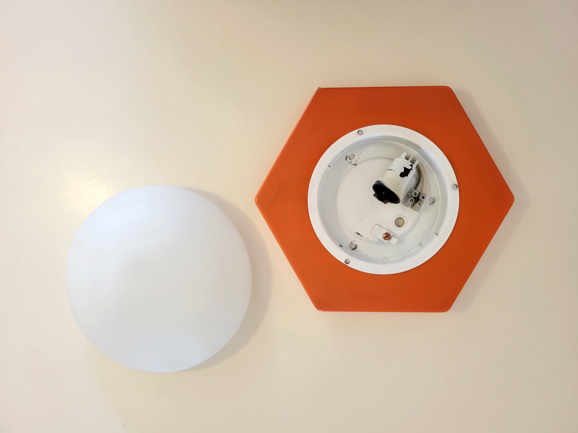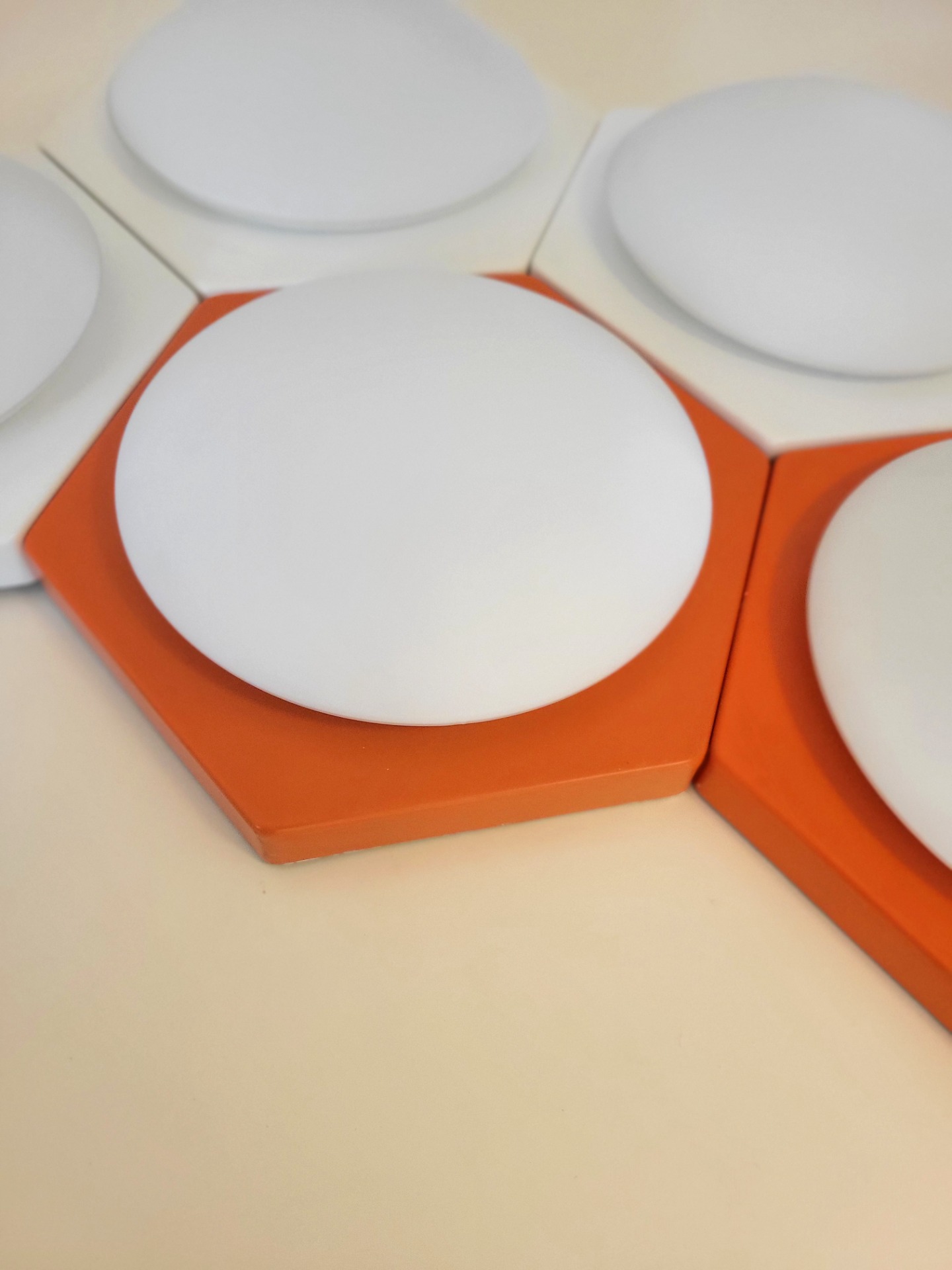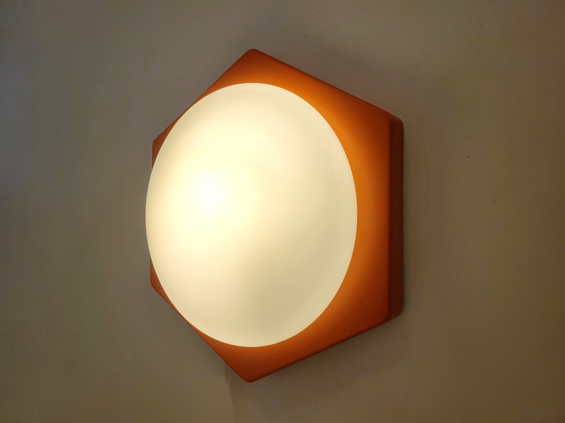 Bijzonder speelse hexagon wandlampen geproduceerd door Paul Neuhaus, Duitsland 1970. Het typische Space Age armatuur bestaat uit een gekleurde, zeshoekige basisplaat waarop een platte, ronde melkglazen diffuser rust. Het bijzondere aan deze armatuur is de vorm en de mogelijkheid om deze te combineren met meerdere wandlampen tot een lichtgevende wandsculptuur. De lampen zijn in meerder kleuren uitgebracht; rood, oranje, geel en wit. De lampen verkeren in zeer nette vintage staat.