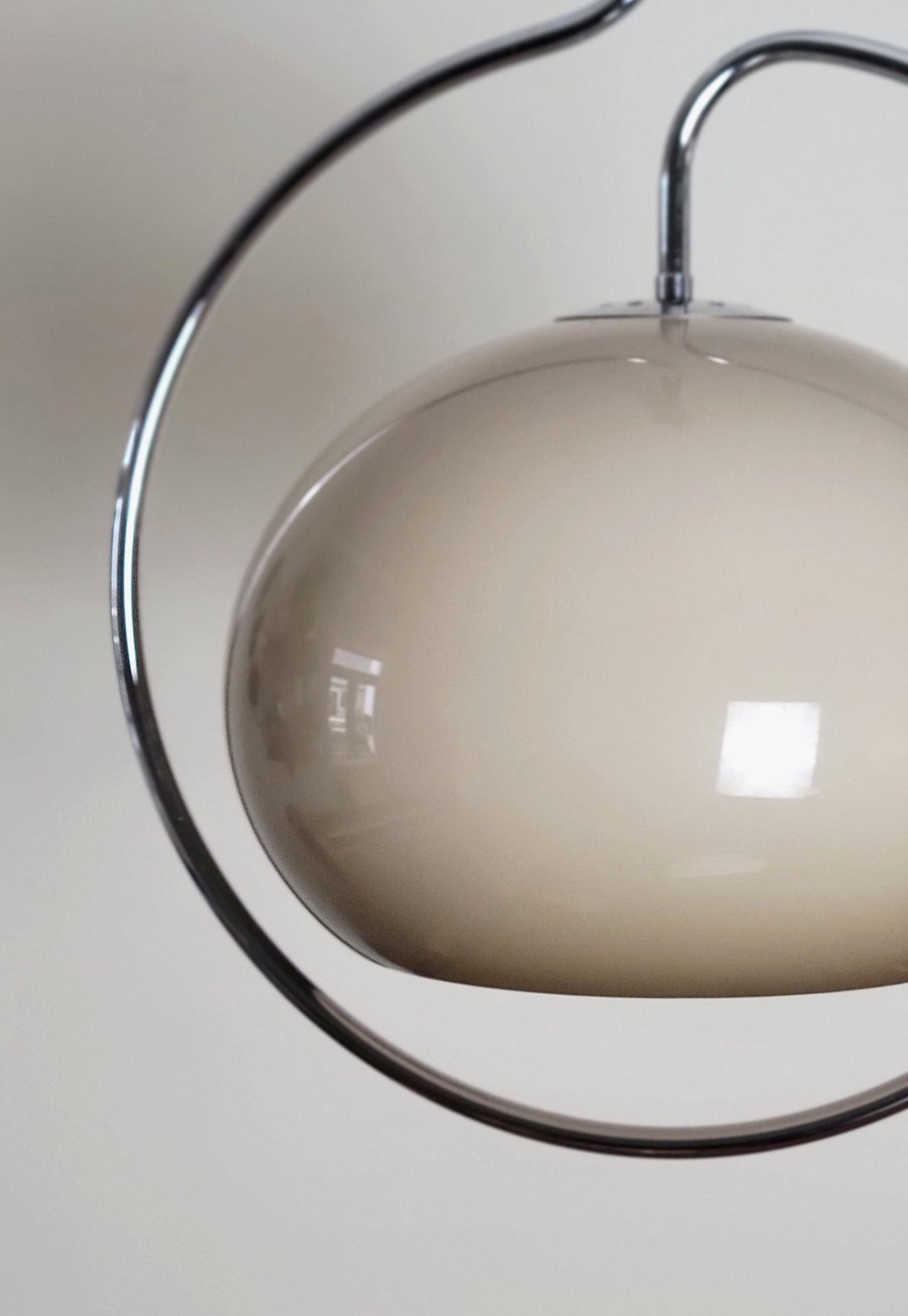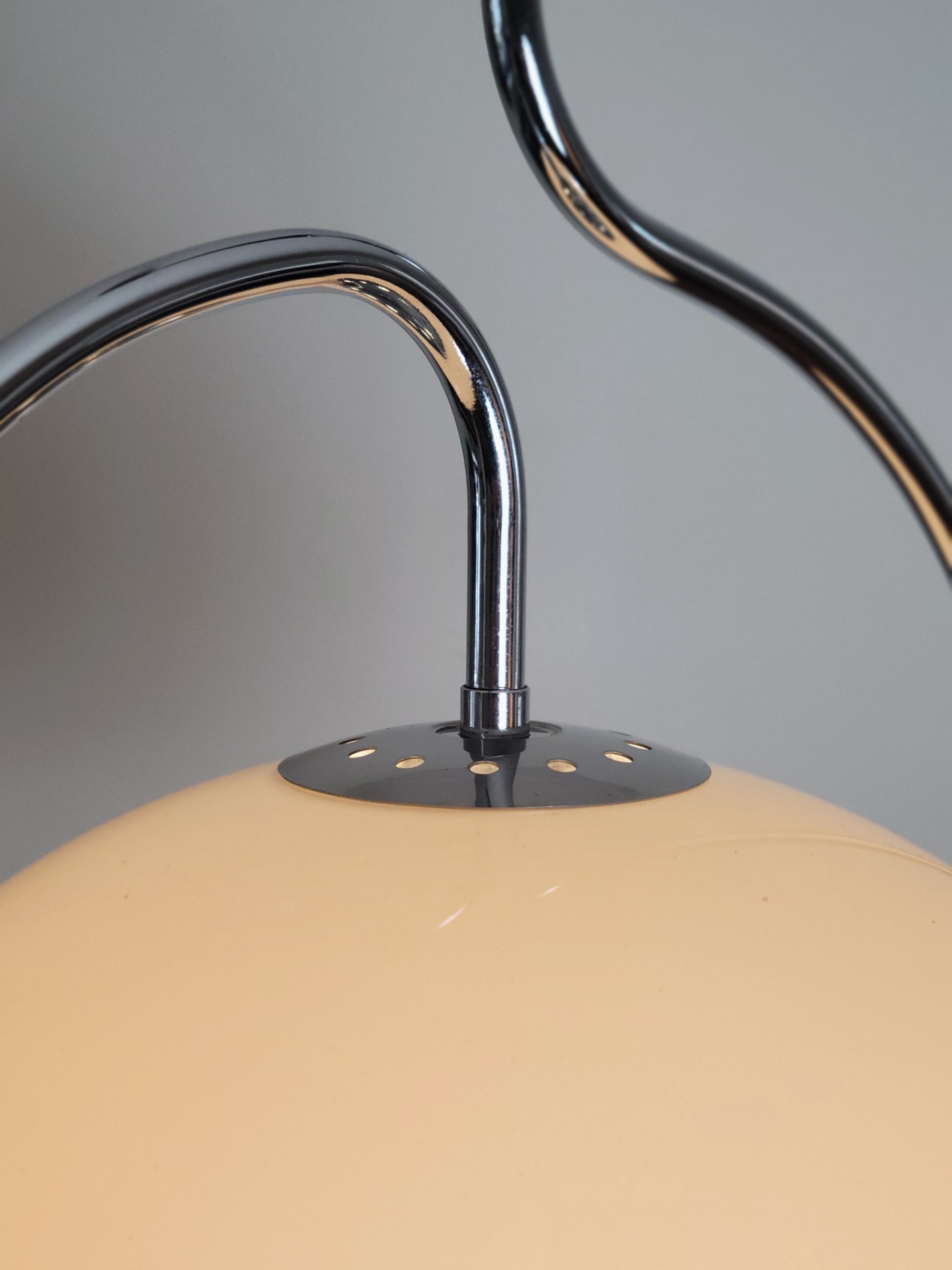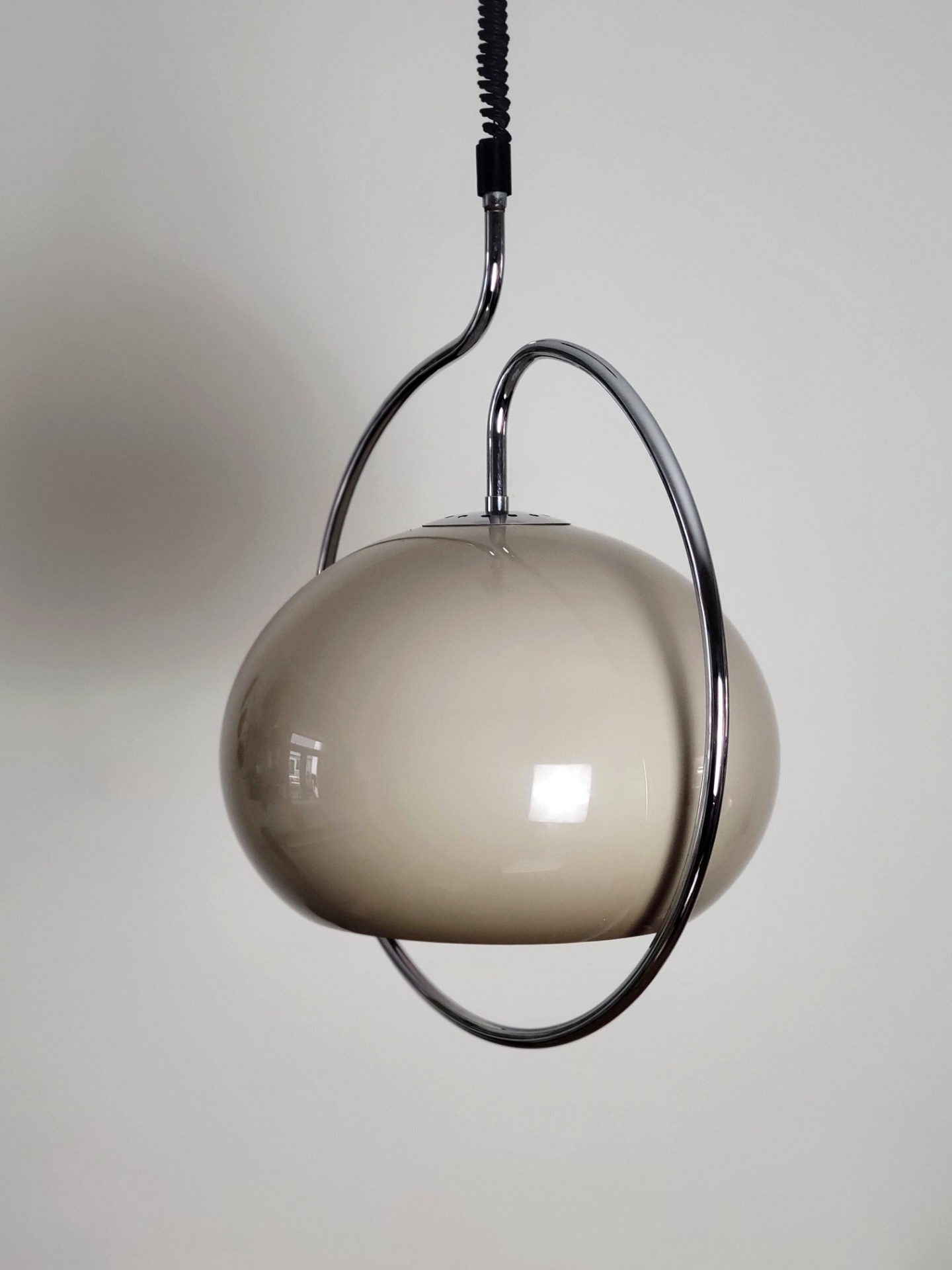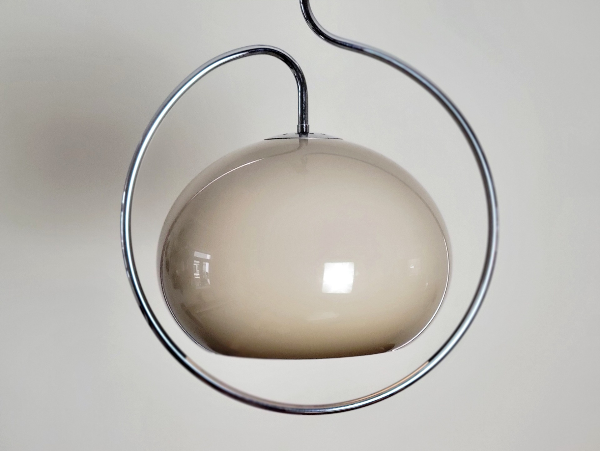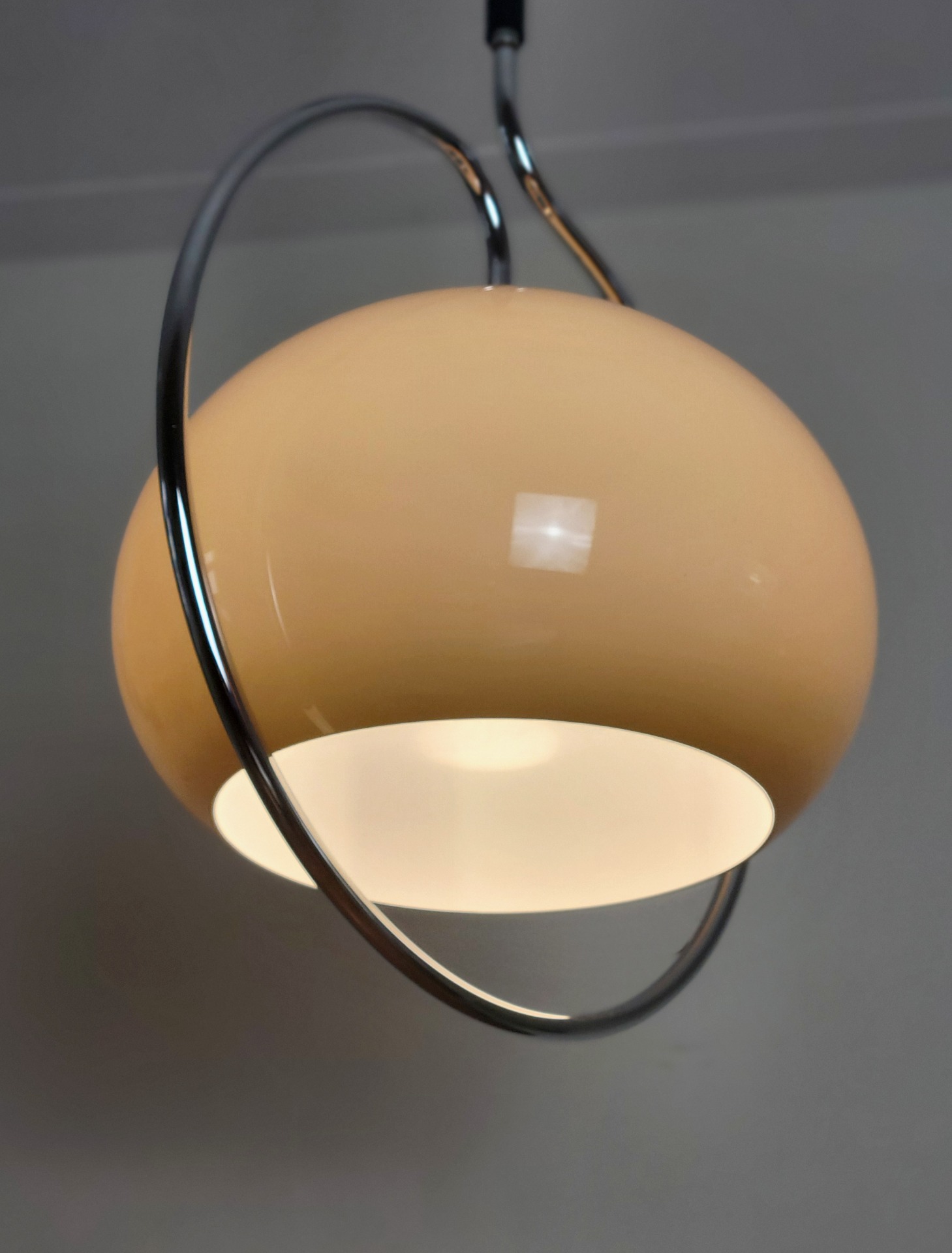 Elegant vormgegeven vintage hanglamp van Dijkstra in kenmerkende Space Age stijl. Wat direct opvalt is het heldere en simpel ogend lijnen spel. De lamp bestaat uit een kunststof beige kap en daaromheen een chromen stang. Door het pendel systeem is de lamp makkelijk in hoogte te verstellen. De kap verspreid een aangenaam en sfeervol licht. De lamp verkeert in nette vintage conditie met gebruikssporen conform leeftijd.