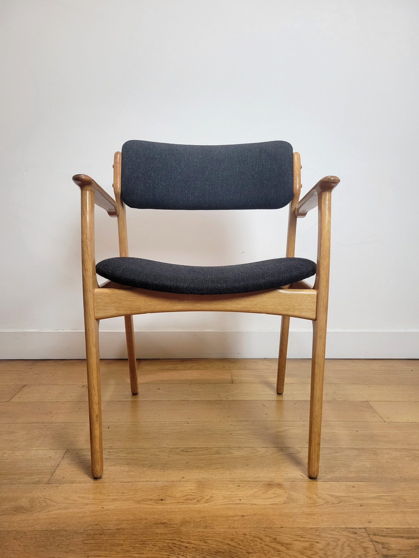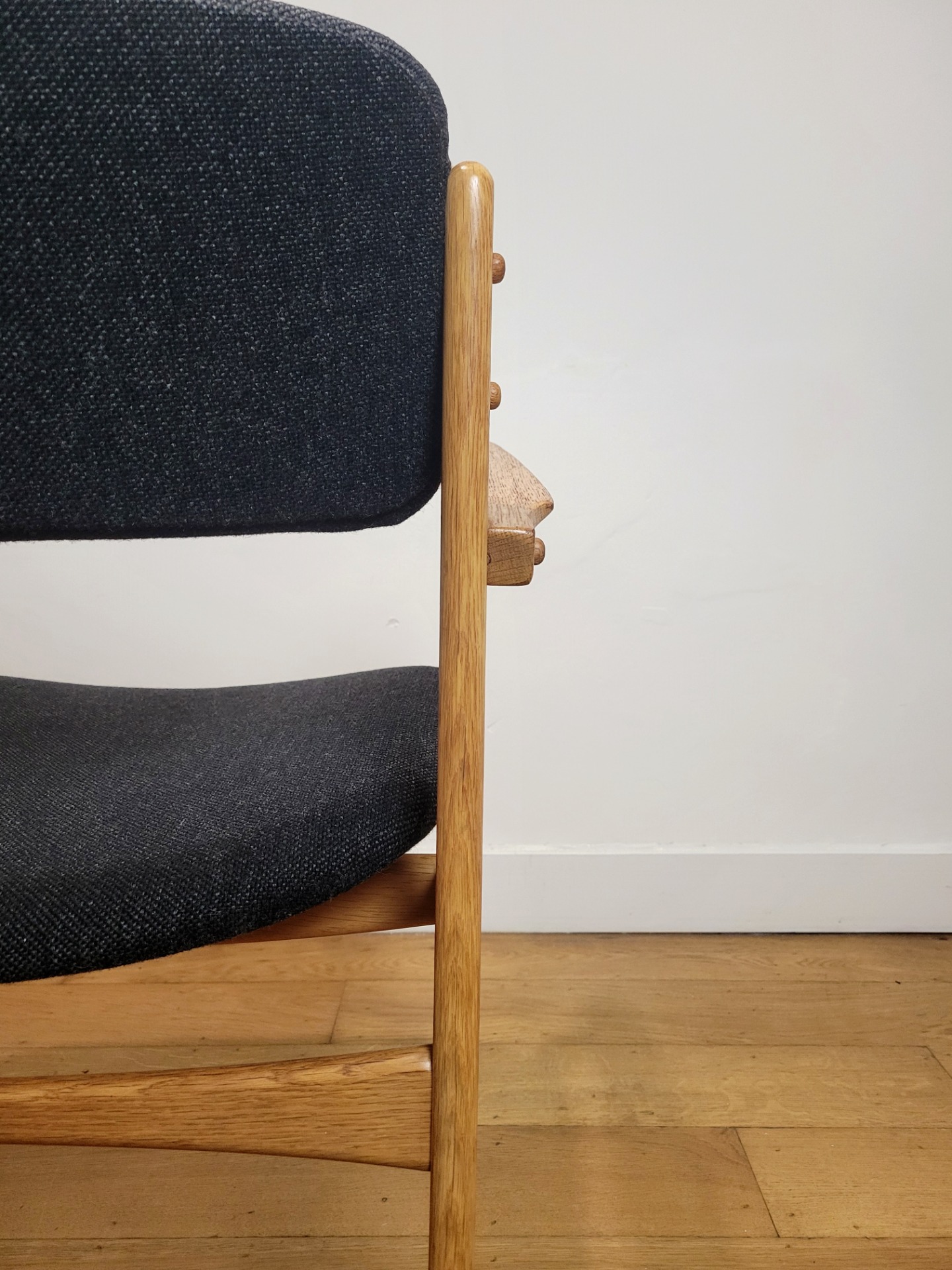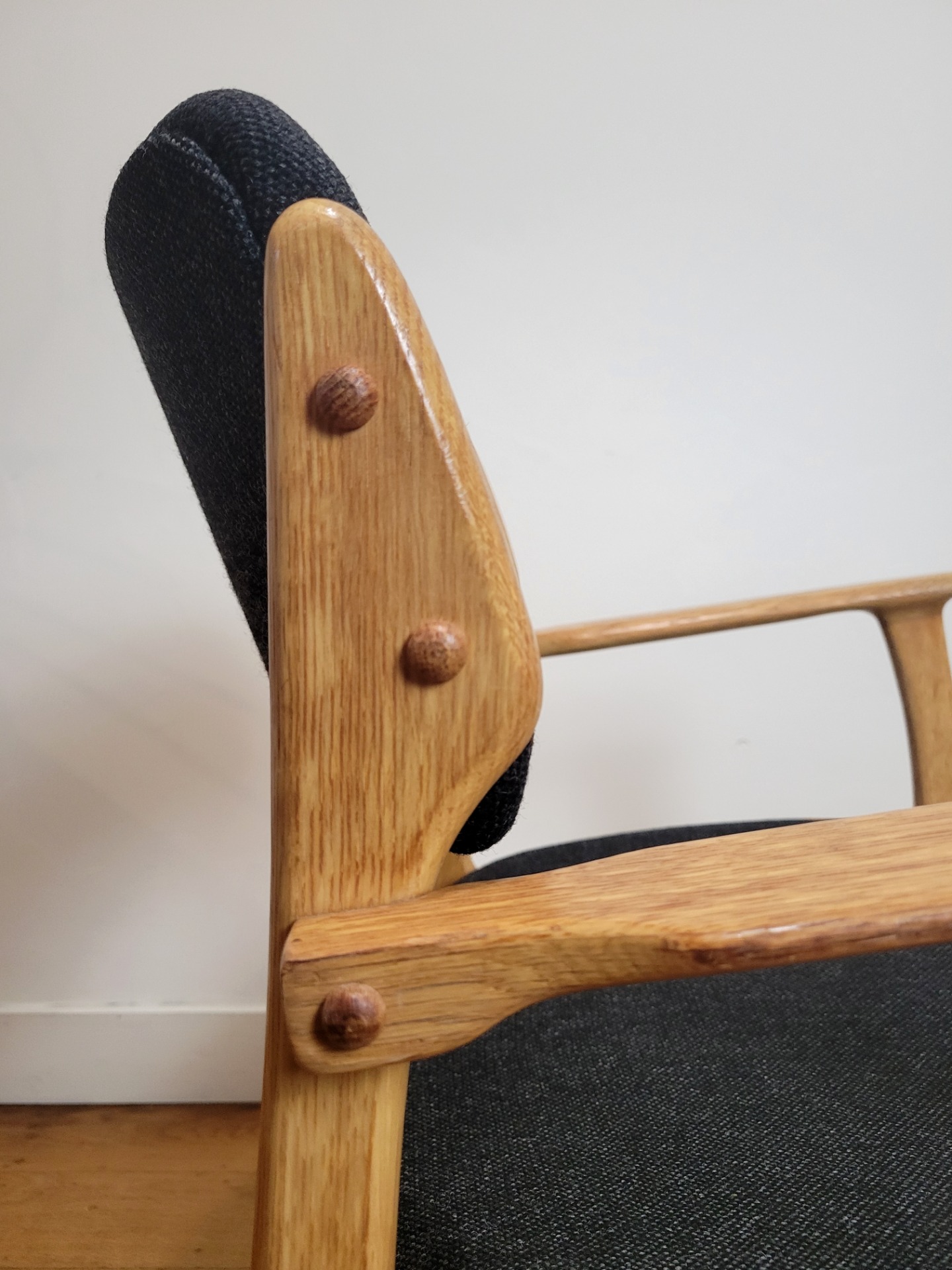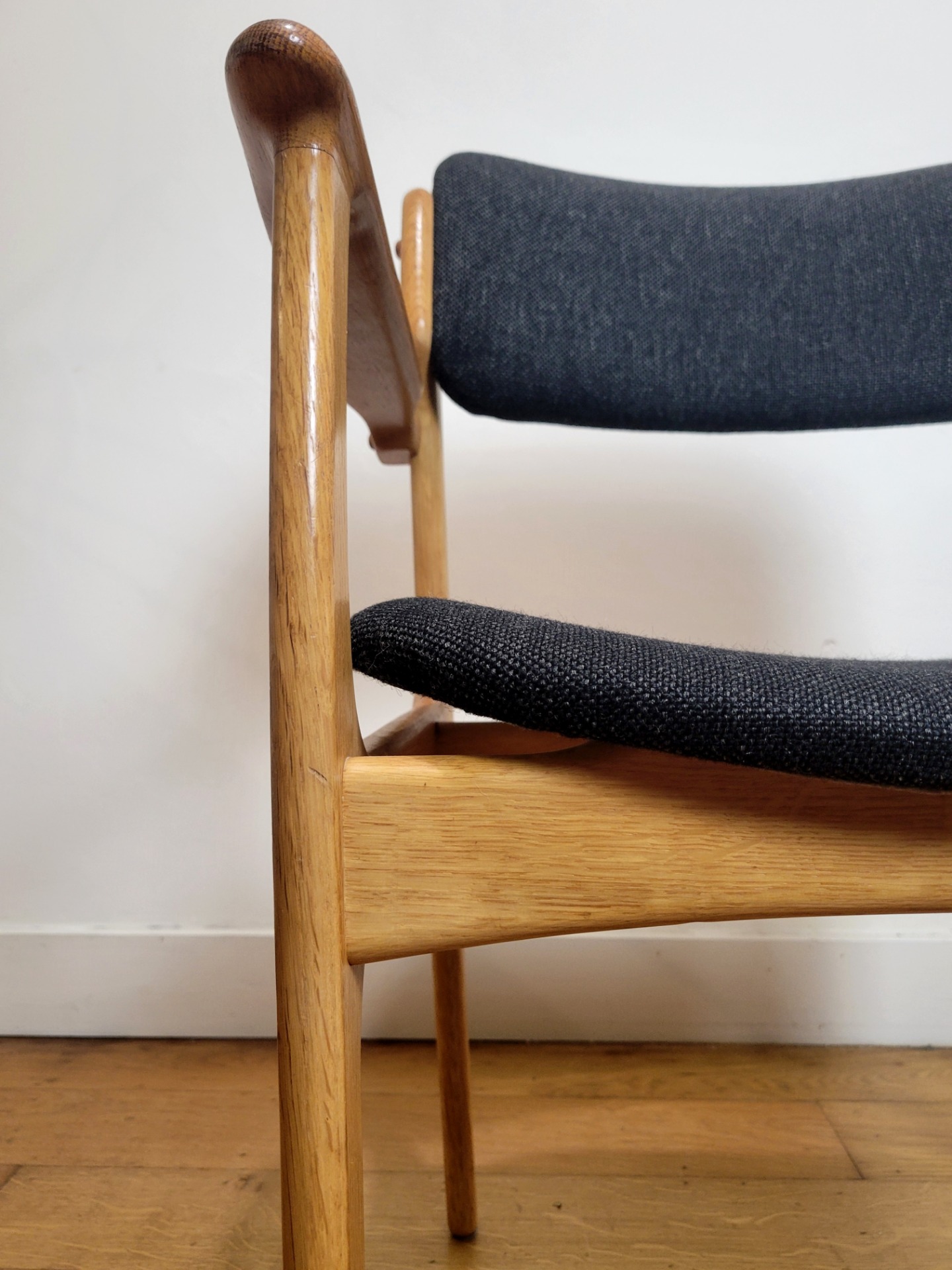Bijzonder mooi vormgegeven Deense armstoel, model 50 ontworpen door Erik Buch en uitgebracht door Stolefabriken Odense. De stoel is uitgevoerd in massief eiken frame en voorzien van een antraciet wollen bekleding. De stoel is een prachtig voorbeeld van Mid-Century Scandinavian design: elegant, licht ogend en ergonomisch. De stoel verkeert in zeer goede staat en heeft weinig tot geen sporen van gebruik. De armleggers hebben een lichte patina. De originele bekleding is in zeer goede staat.