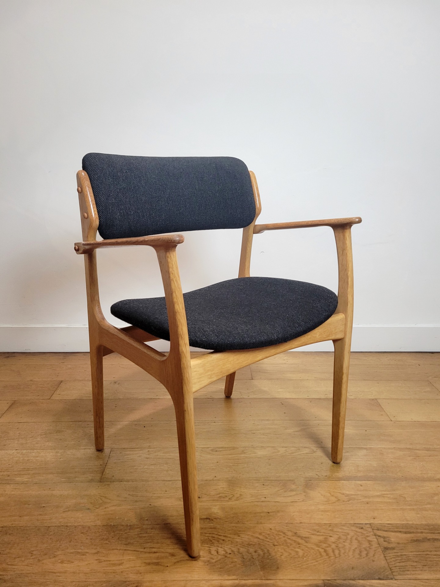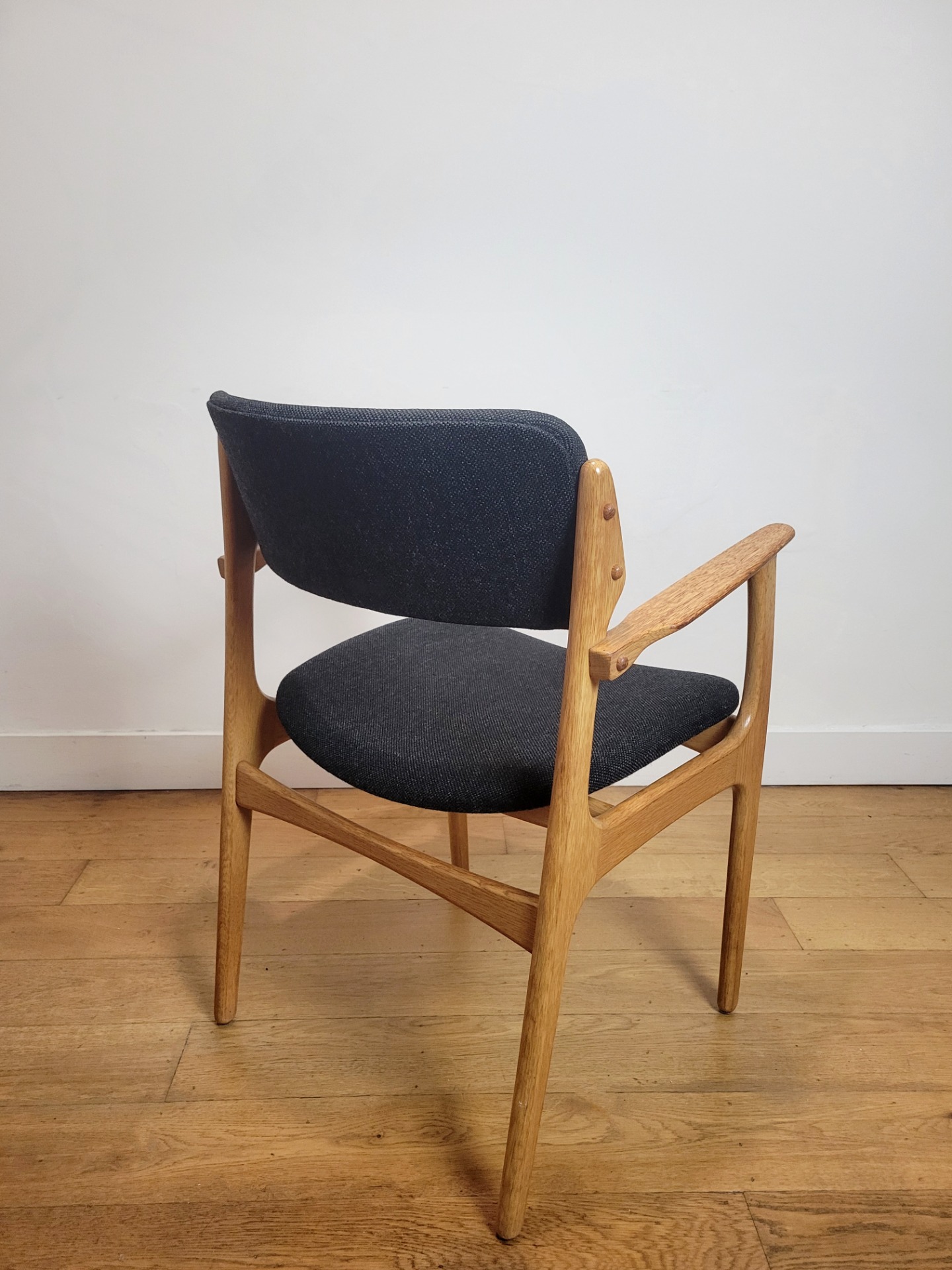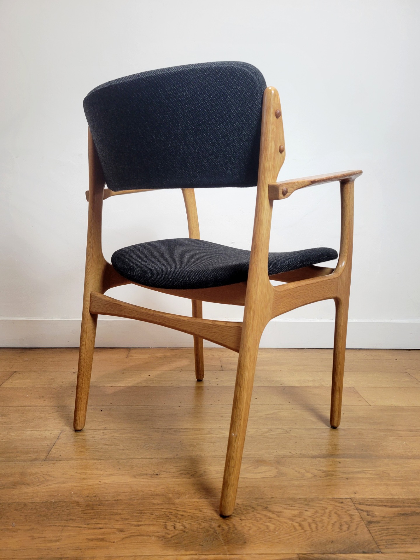 Bijzonder mooi vormgegeven Deense armstoel, model 50 ontworpen door Erik Buch en uitgebracht door Stolefabriken Odense. De stoel is uitgevoerd in massief eiken frame en voorzien van een antraciet wollen bekleding. De stoel is een prachtig voorbeeld van Mid-Century Scandinavian design: elegant, licht ogend en ergonomisch. De stoel verkeert in zeer goede staat en heeft weinig tot geen sporen van gebruik. De armleggers hebben een lichte patina. De originele bekleding is in zeer goede staat.