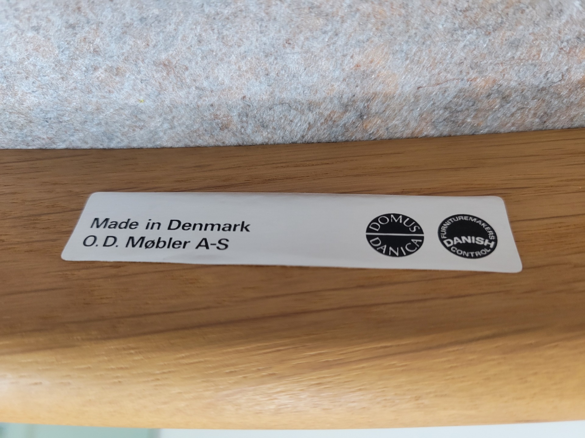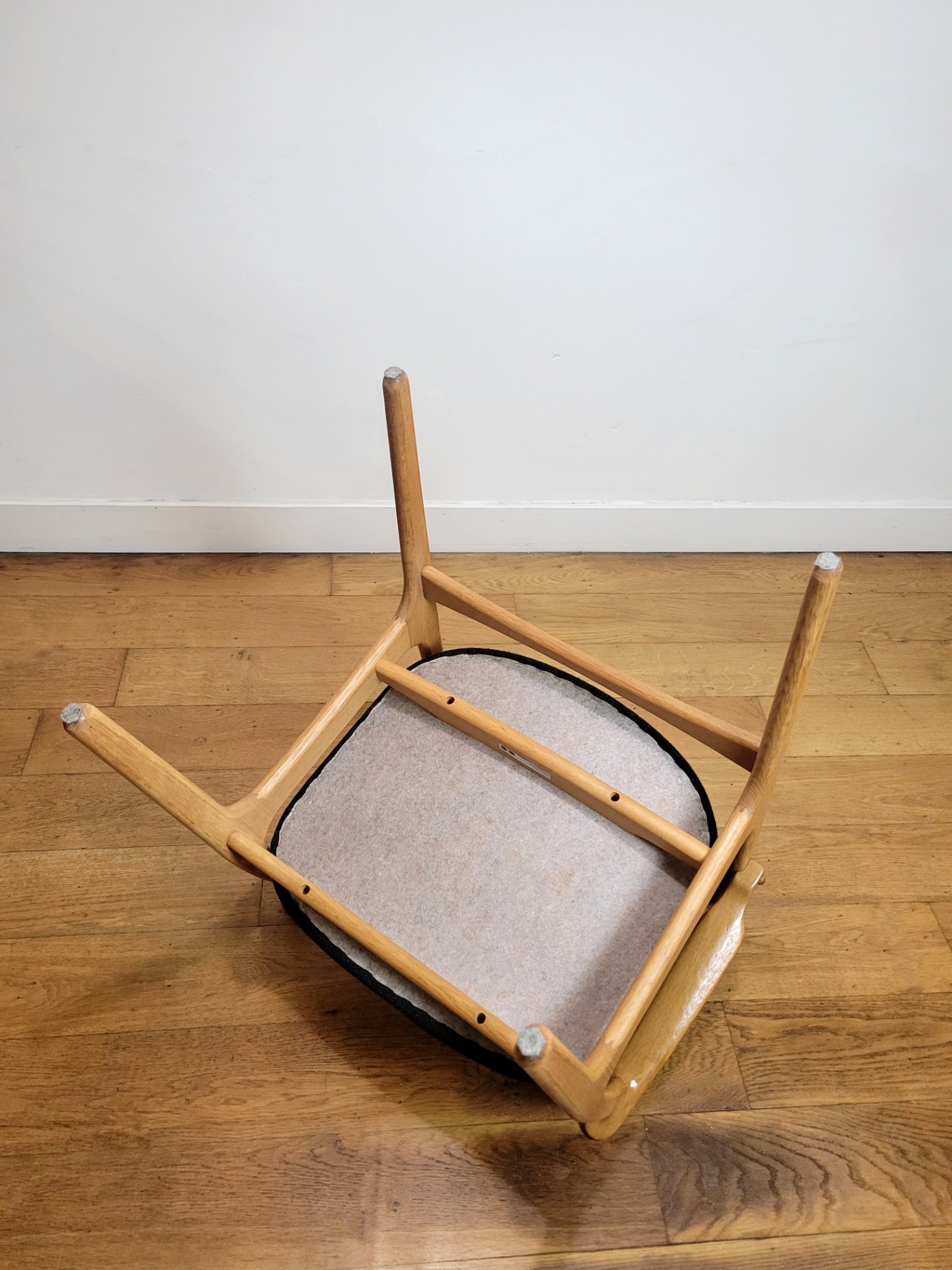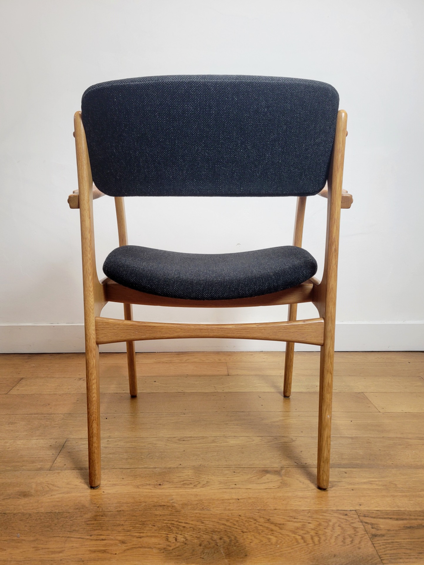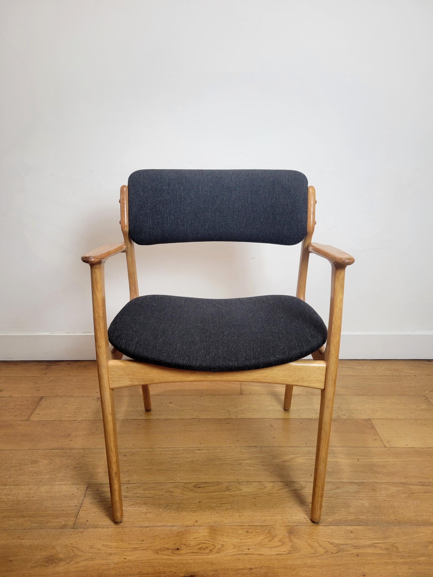 Bijzonder mooi vormgegeven Deense armstoel, model 50 ontworpen door Erik Buch en uitgebracht door Stolefabriken Odense. De stoel is uitgevoerd in massief eiken frame en voorzien van een antraciet wollen bekleding. De stoel is een prachtig voorbeeld van Mid-Century Scandinavian design: elegant, licht ogend en ergonomisch. De stoel verkeert in zeer goede staat en heeft weinig tot geen sporen van gebruik. De armleggers hebben een lichte patina. De originele bekleding is in zeer goede staat.