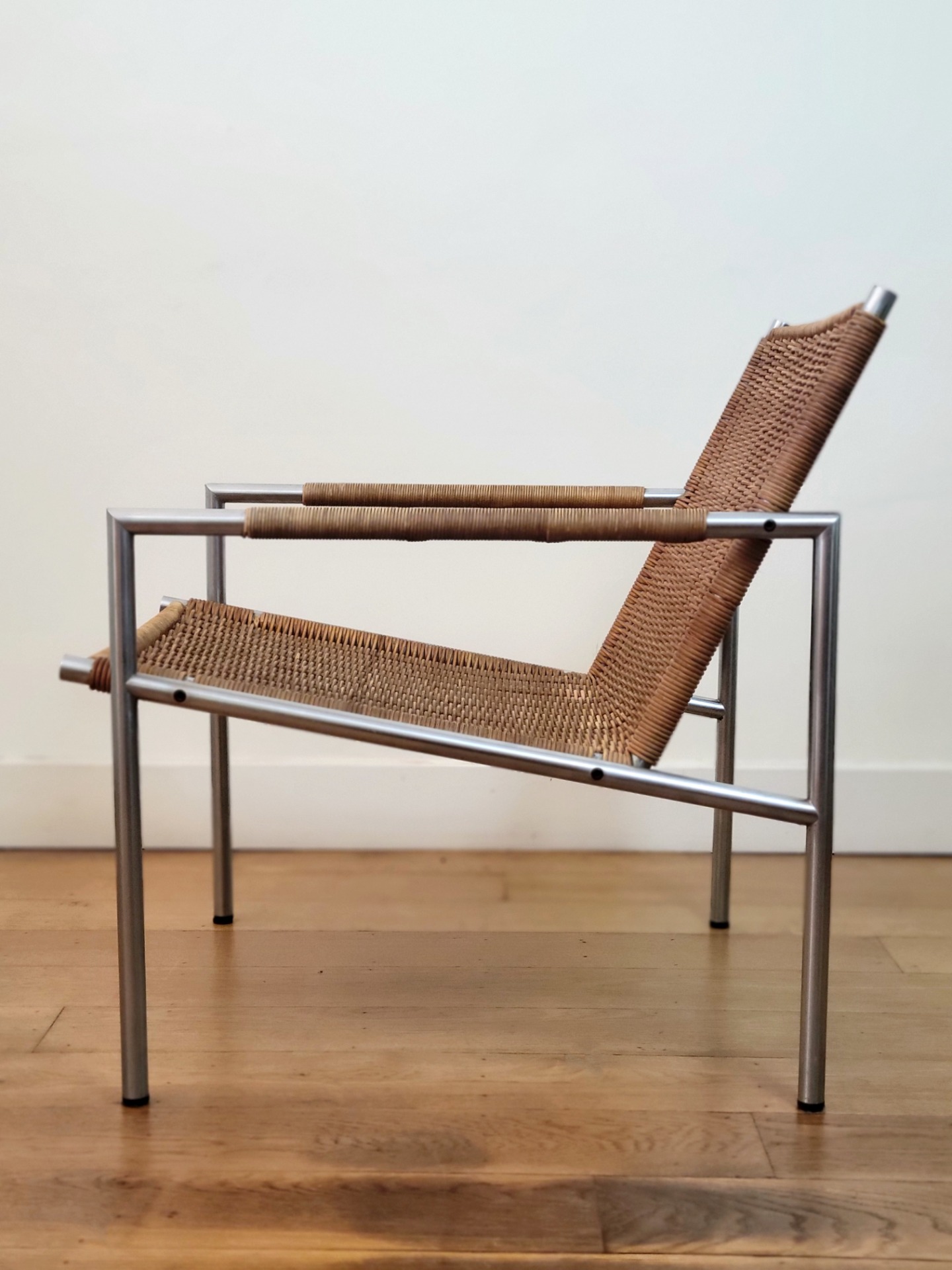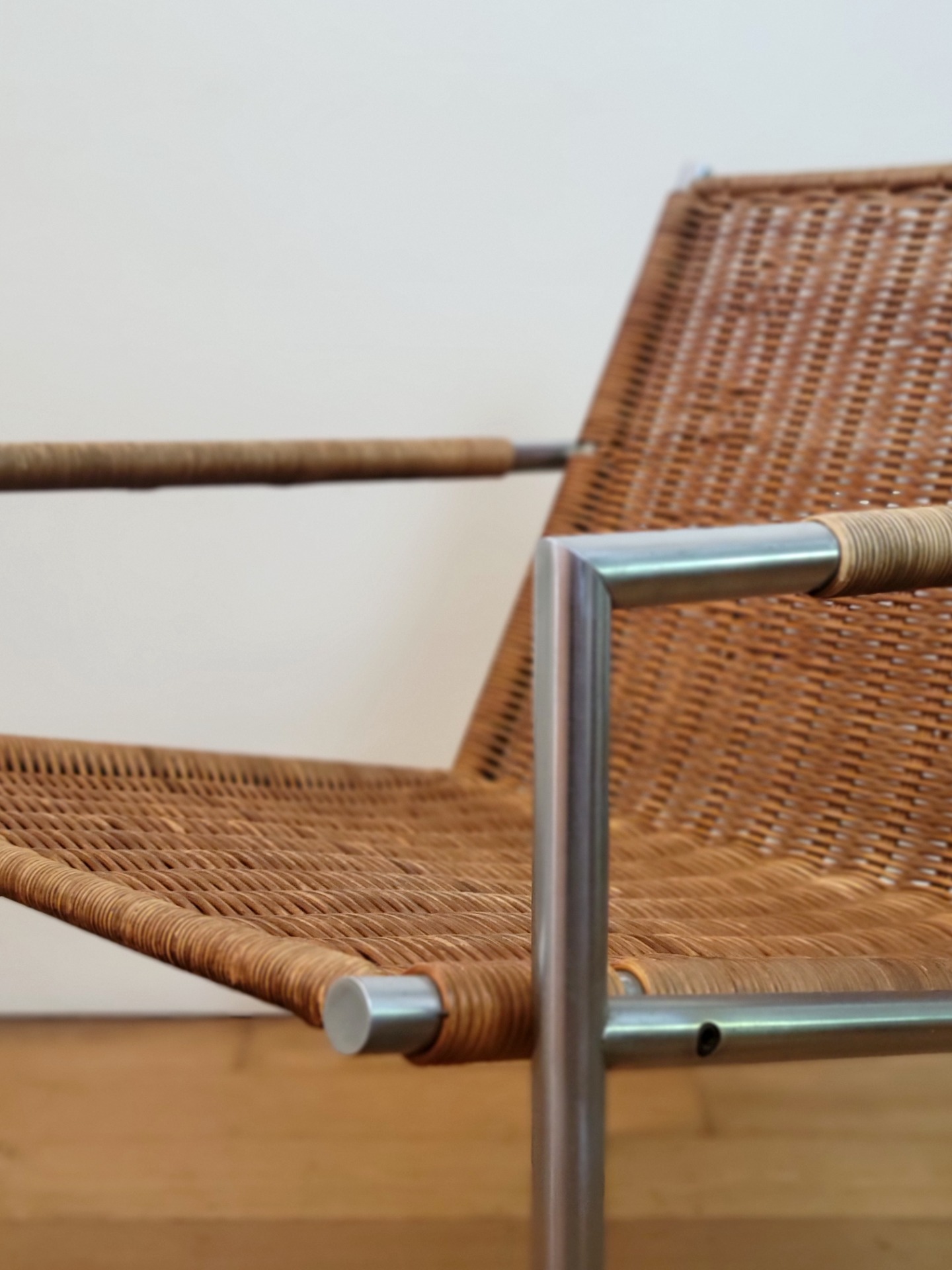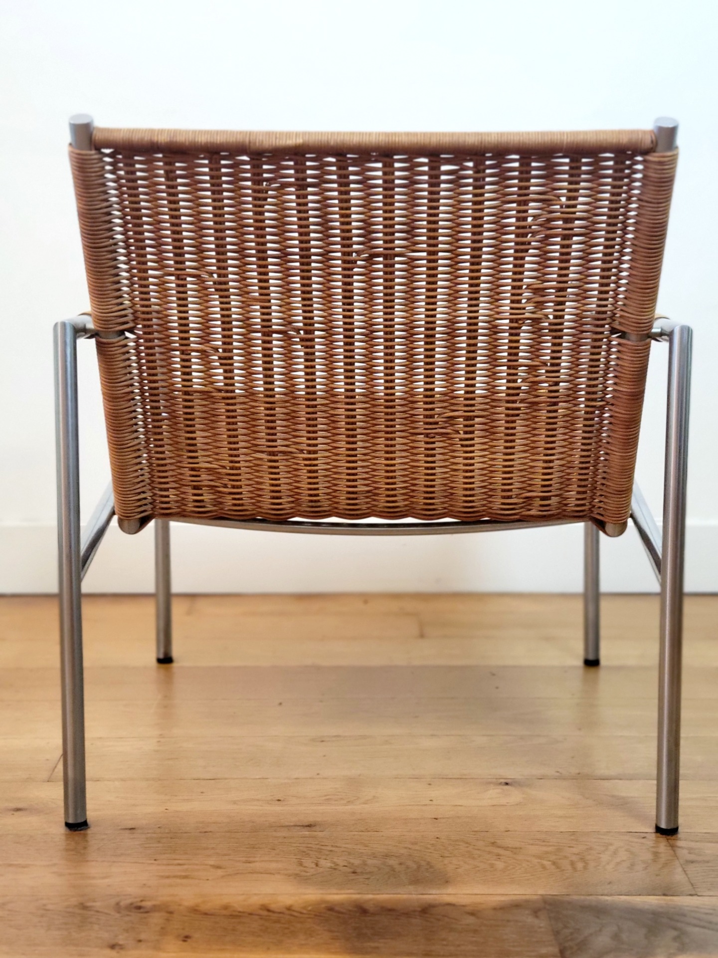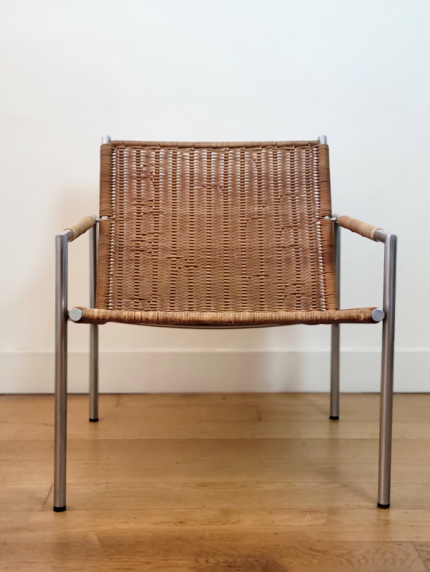 Begin jaren zestig begon Martin Visser als hoofdontwerper bij het Nederlandse meubelbedrijf Spectrum. Tijdens zijn tijd bij Spectrum ontwierp hij vele tijdloze stukken die tot op de dag van vandaag nog steeds n geproduceerd worden. Dat geldt ook voor deze tijdloze stoel uitgevoerd in chroom en pitriet Het pitriet heeft een bijzondere fraaie patina. Het pitriet is volledig intact en zeer stevig.