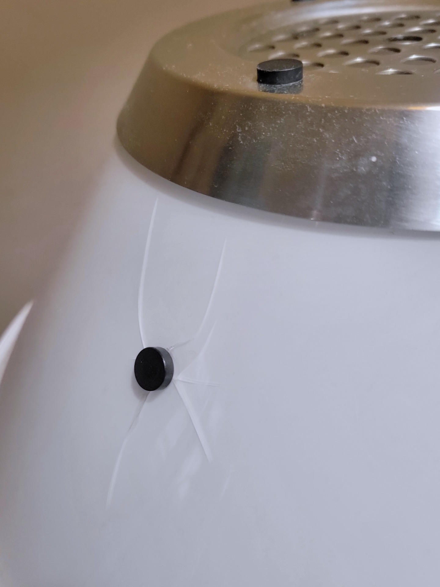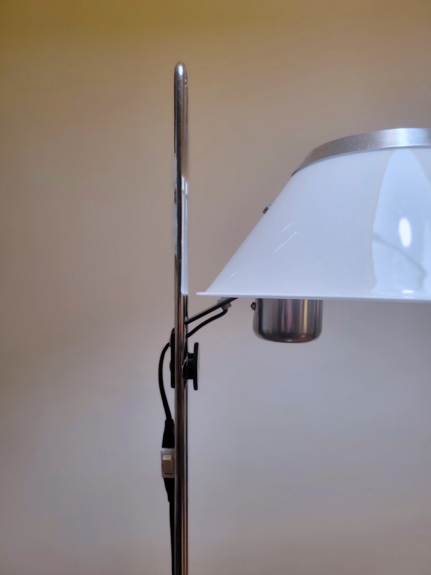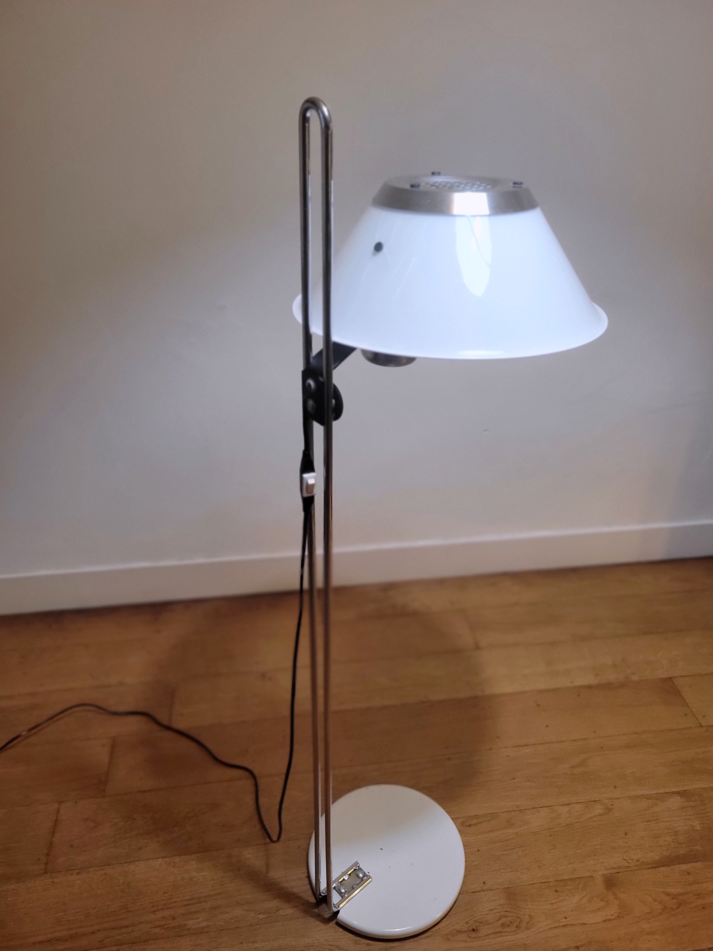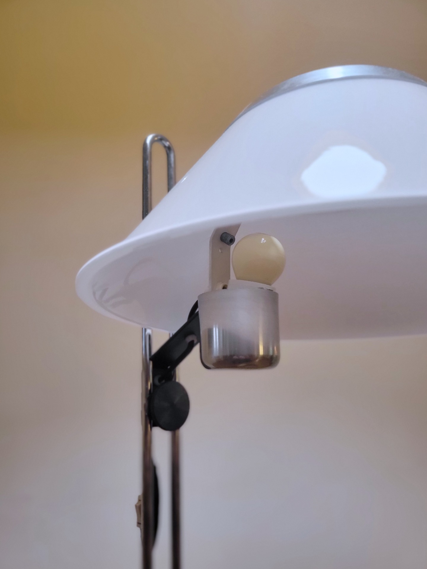 De kap is gemaakt van wit acryl en heeft een geperforeerd aluminium bovenkant waardoor het licht zich ook kan verspreiden. Het chromen frame rust op een wit gelakt metalen voet. De kap is in hoogte verstelbaar. De lamp verkeert in goede staat met enkele kleine tekenen van eerder gebruik. Er is in de buitenste laag van de kunststofkap een oppervlakkige lijn/barst te zien, zie foto. Het fabrikantlabel van Ateljé Lyktan bevindt zich onder de basis.